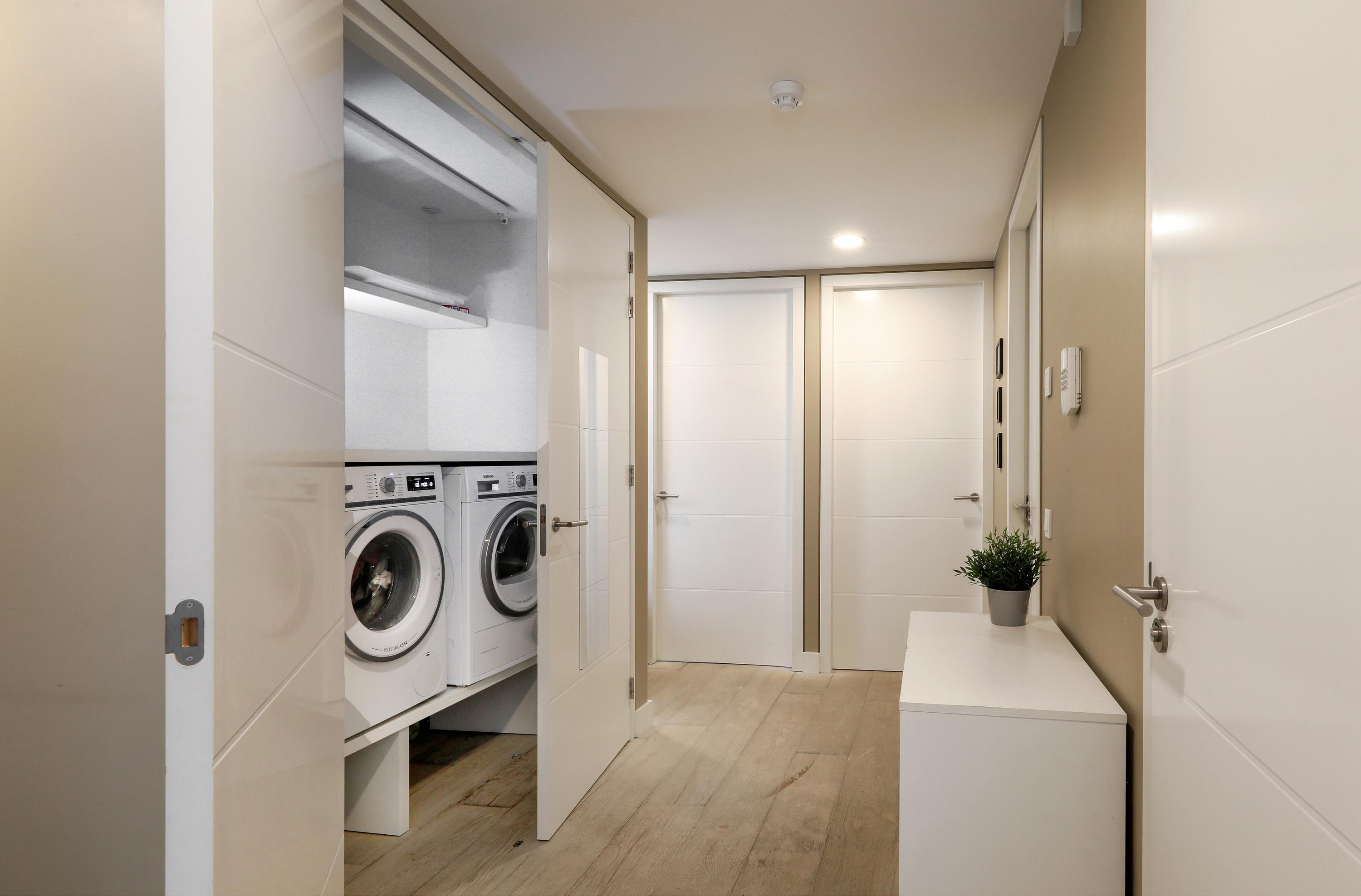 This was once an upstairs and downstairs apartment. By combining the two, a staircase could be removed. The current staircase is beautifully concealed behind a sliding door. We recognize this architect by the banister, but also by the interplay of lines on this staircase and the light line between the wall and the sloping surface. Laundry appliances are concealed in a cupboard on the spacious landing.