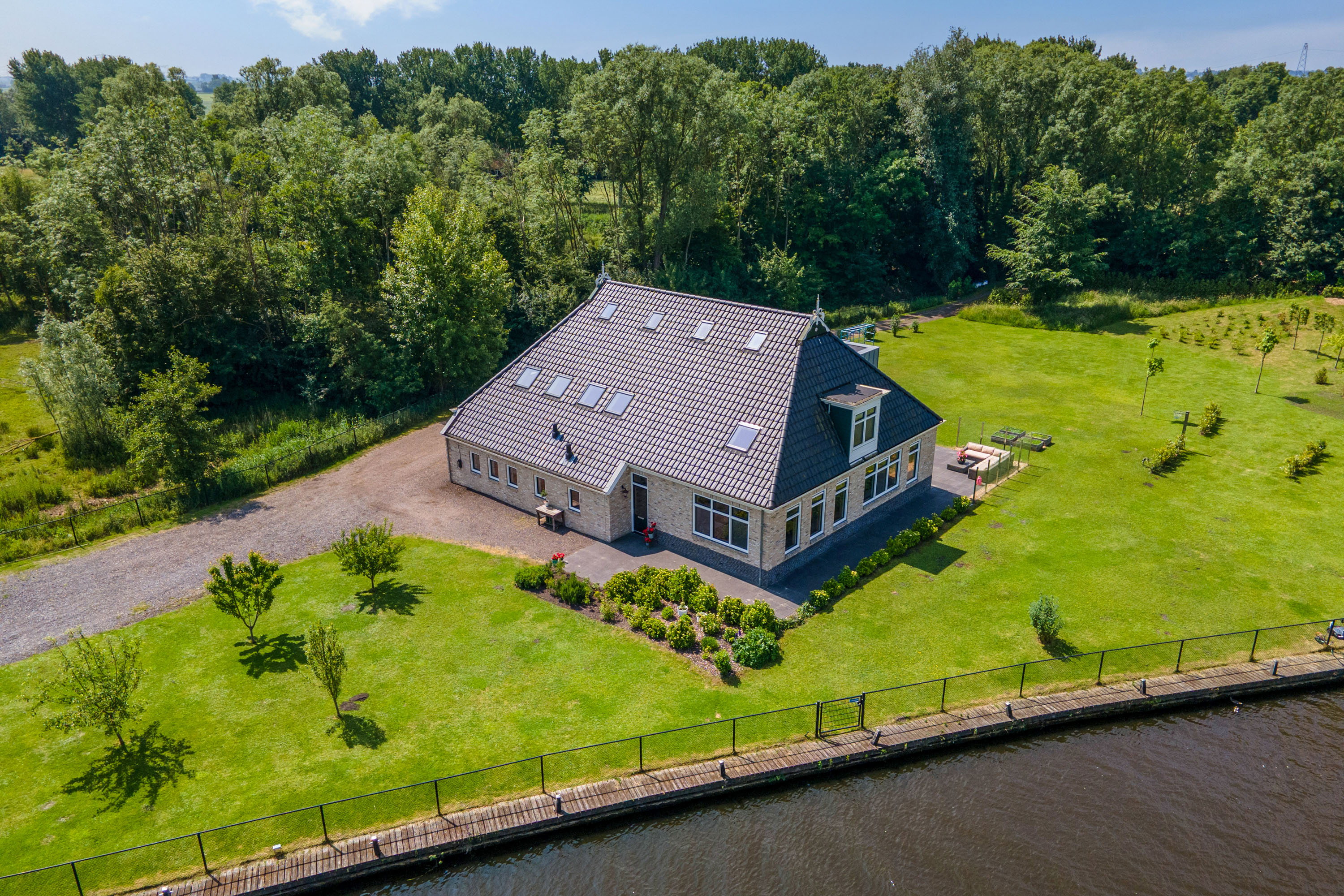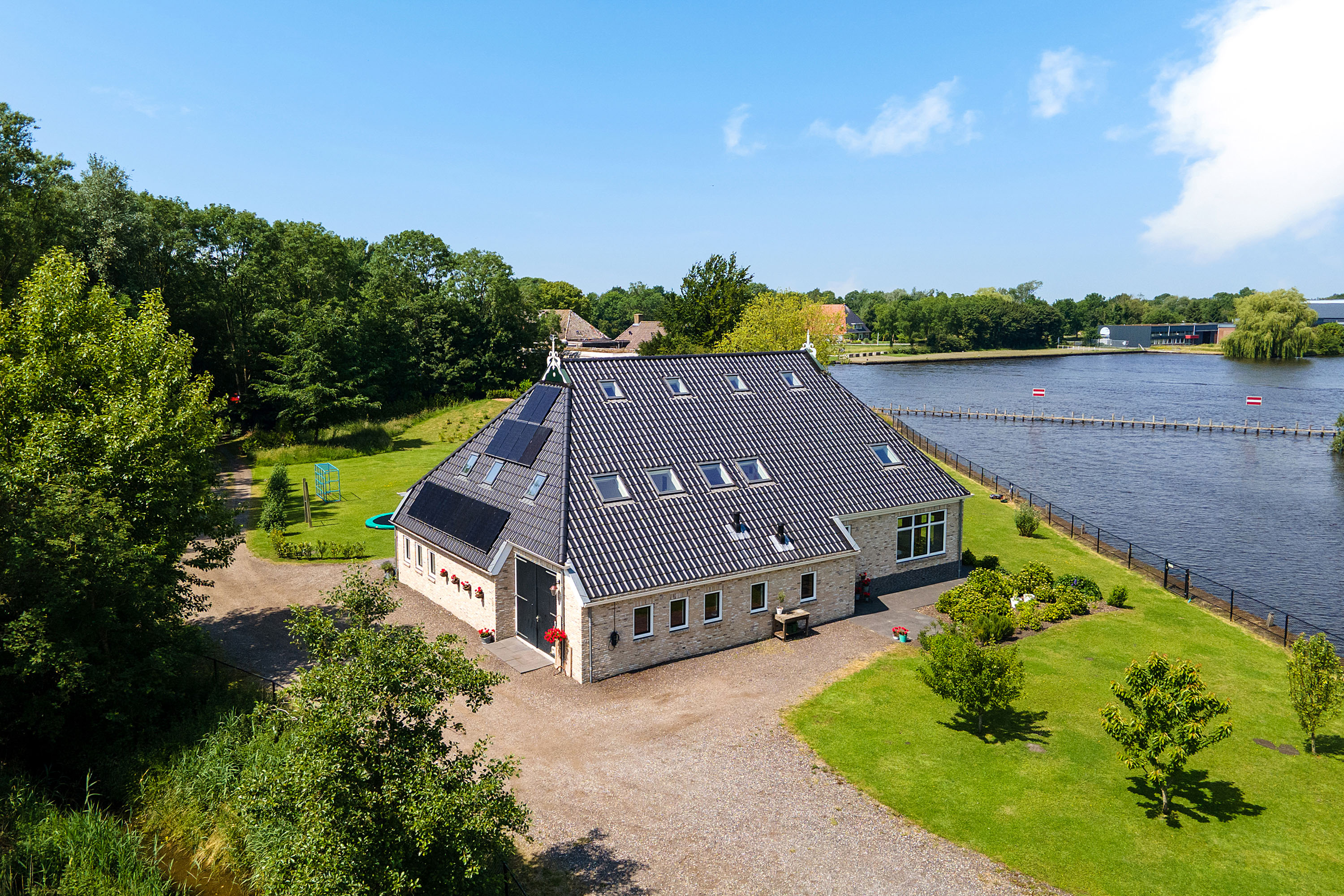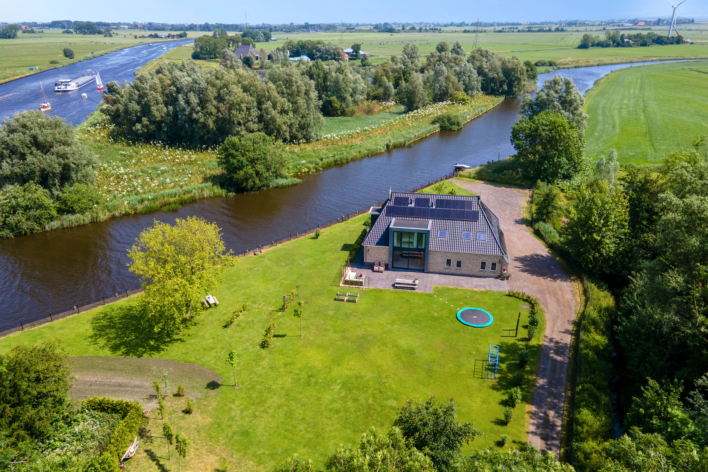 Tucked away at the end of a picturesque green lane where the trees give way to the shimmering waters of the “Nije Wetering” – the waterway linking the Pikmeer (Grou) with the Sneekermeer (Terherne) – lies this exceptional, newly built farmhouse from 2019. Boasting over 400 m² of living space on a 4,574 m² plot with a private 100-metre-long quay, this is a dream property for those seeking freedom, space and direct access to the renowned Frisian Lakes.