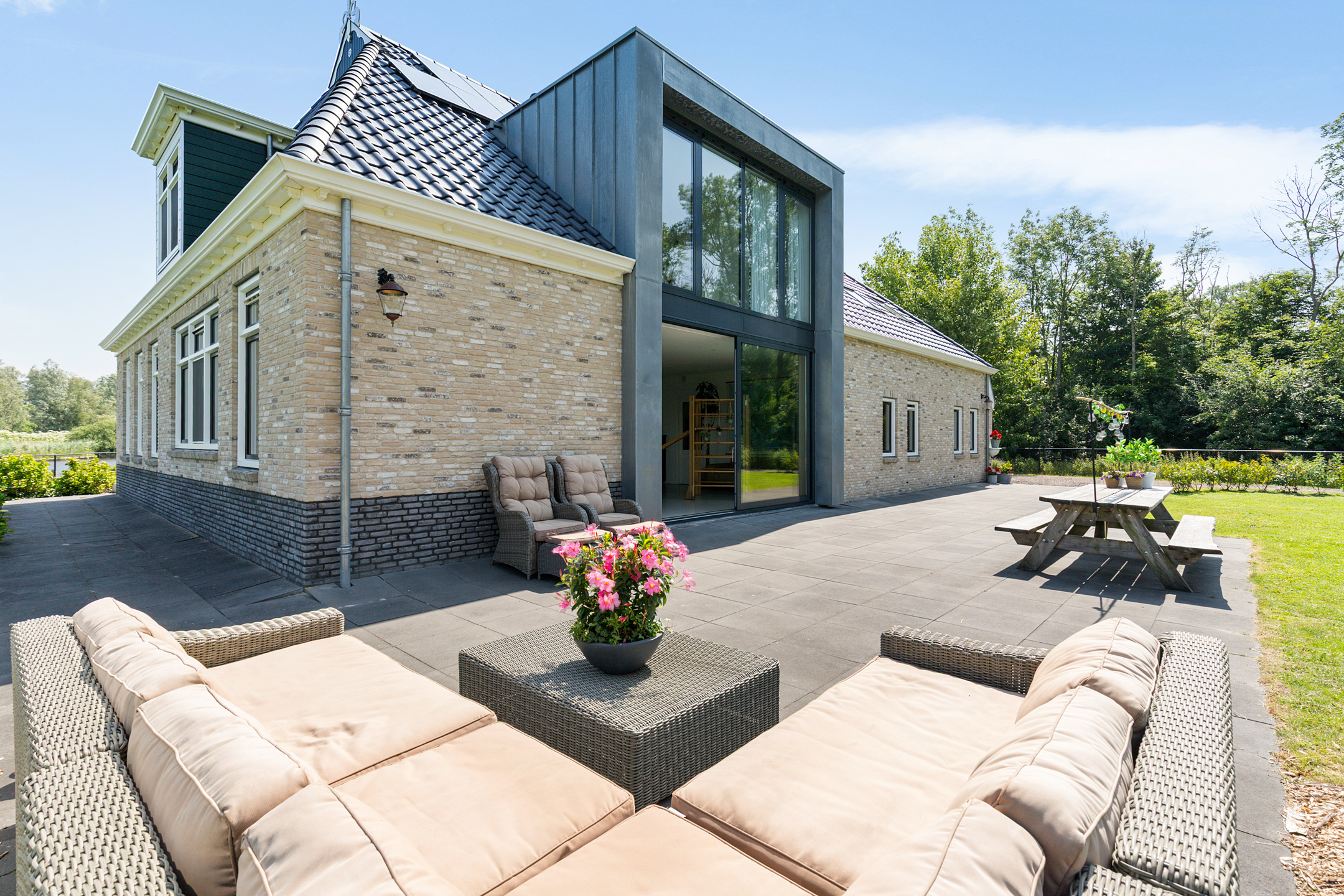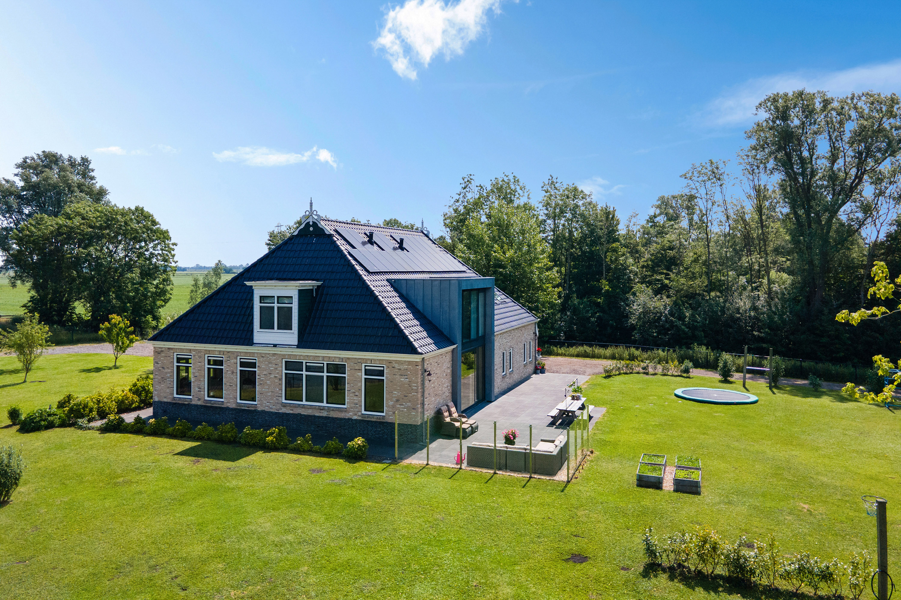 Designed in the style of a traditional Frisian farmstead but with a contemporary twist, this home blends rustic charm with modern efficiency. Its zinc-clad *risaliet* at the sun terrace hints at the refined architecture. Built to the highest energy standards, the property features full insulation, low-maintenance synthetic window frames, a geothermal heat pump with cooling module, heat recovery system (WTW), 38 solar panels and an A-level energy label. Inside, the ambience is open, light-filled and comfortable: a generous living area with a 107 m² kitchen-lounge, five bedrooms, four en-suite bathrooms, a spacious office, utility room and a spectacular fully insulated 75 m² barn with double stable doors.