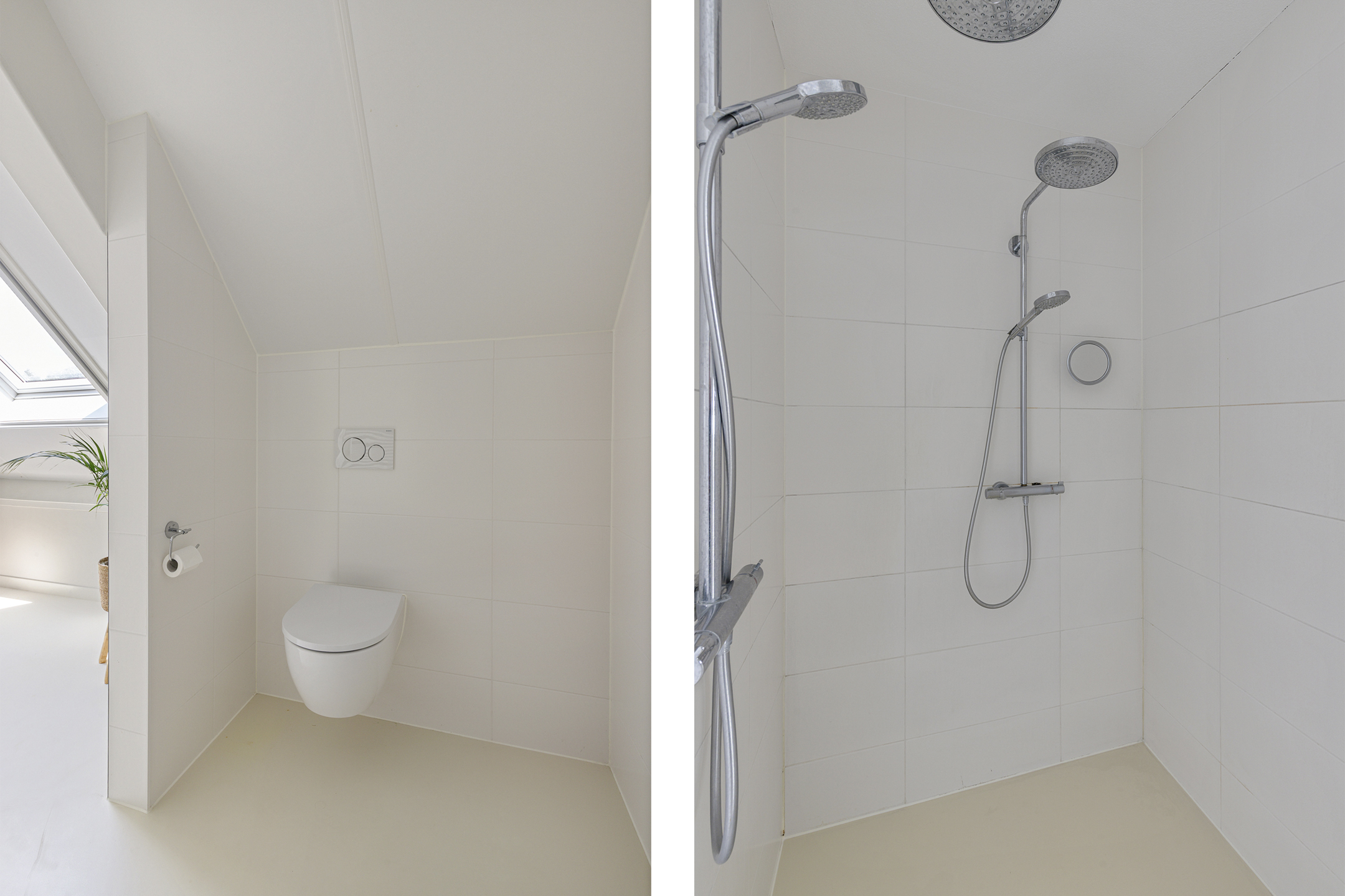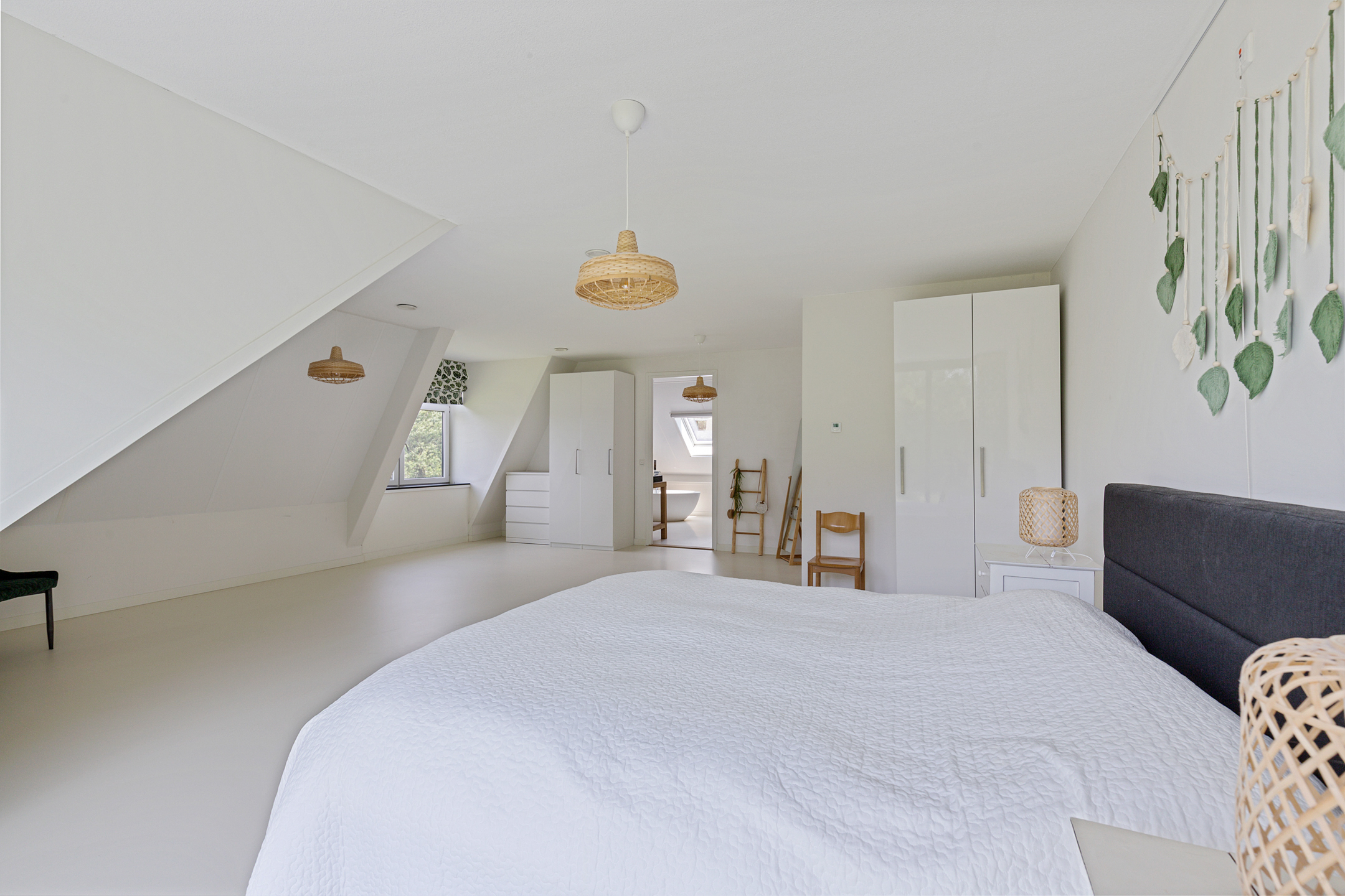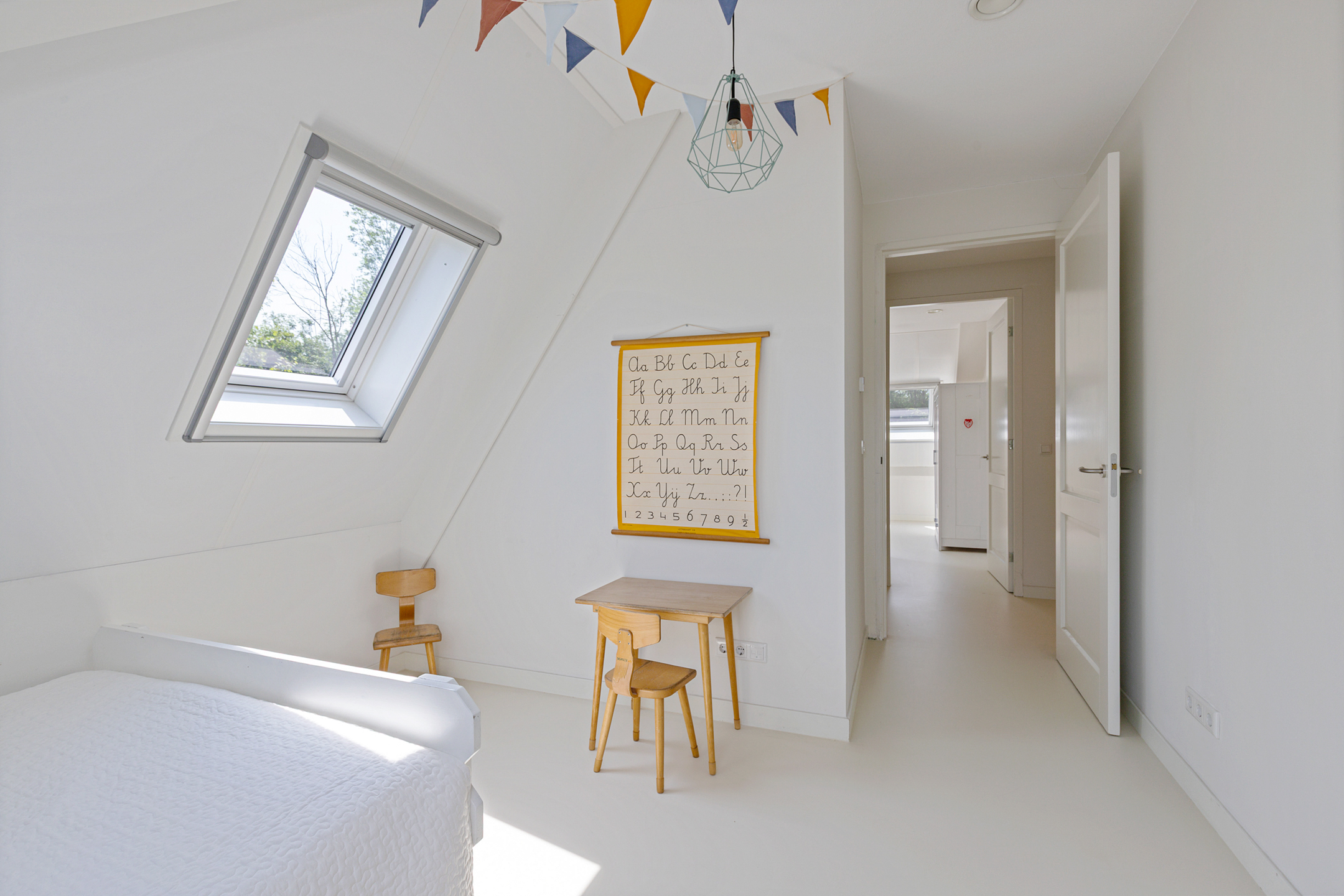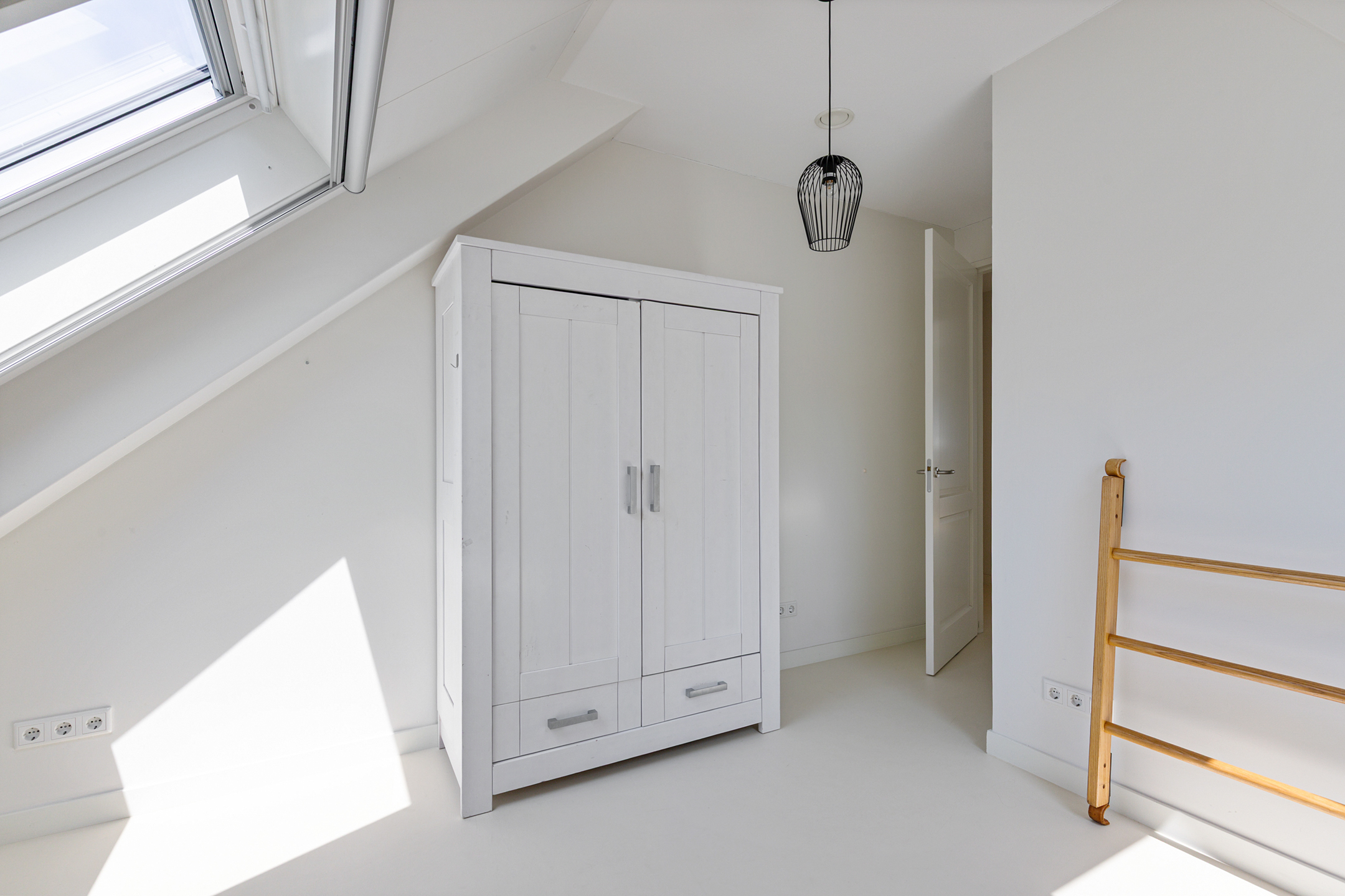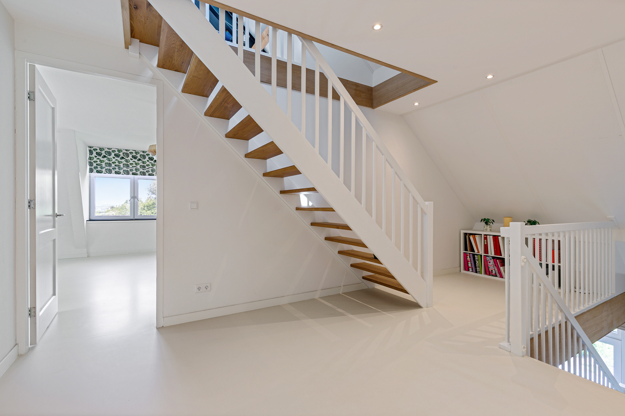 A fixed staircase leads to the fully insulated attic, with full standing height along the length of the house. Industrial steel trusses and rustic wooden beams lend this space character. Three Velux roof windows ensure ample light. Ideal as storage or for conversion into additional living or work areas.