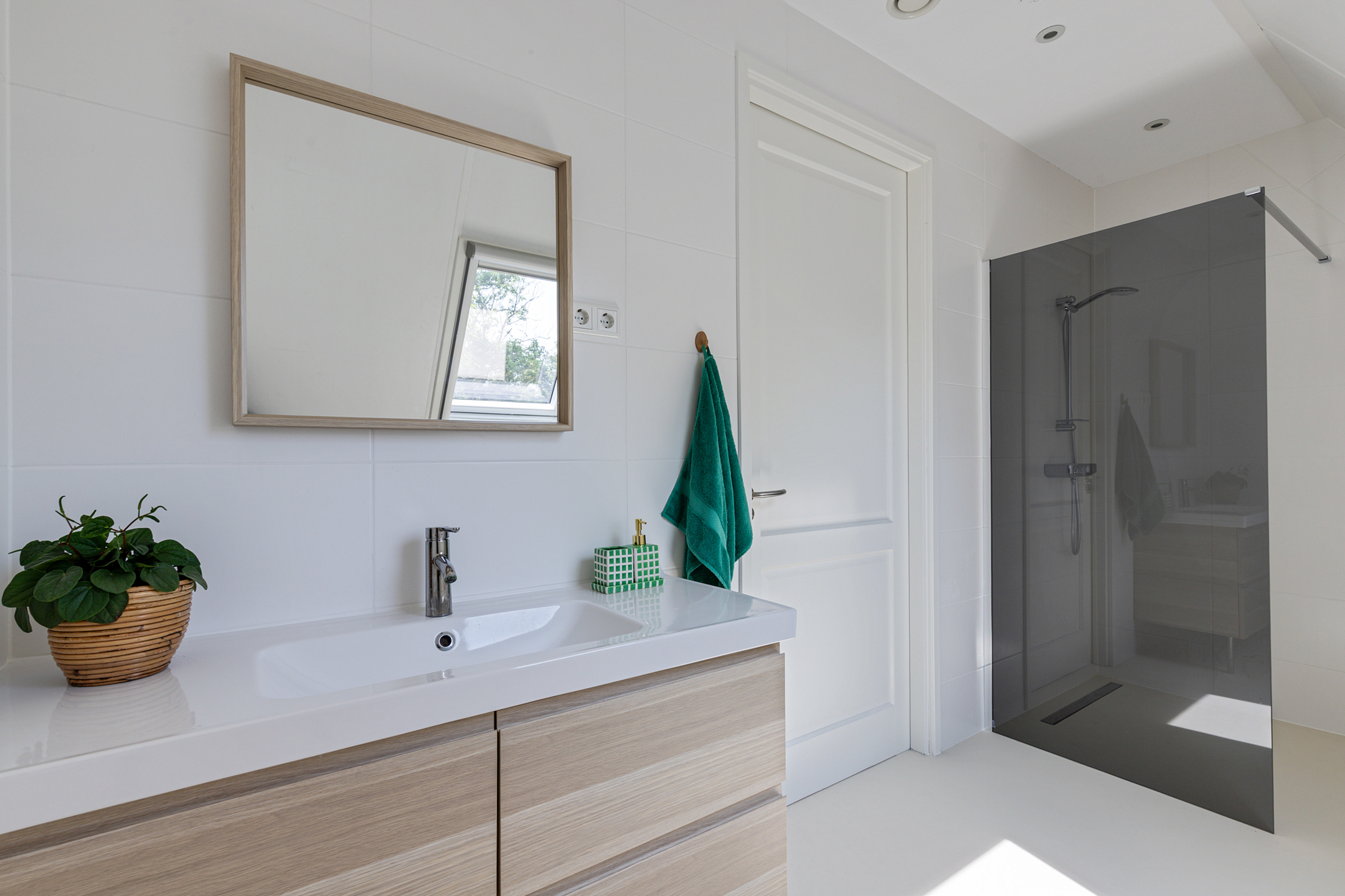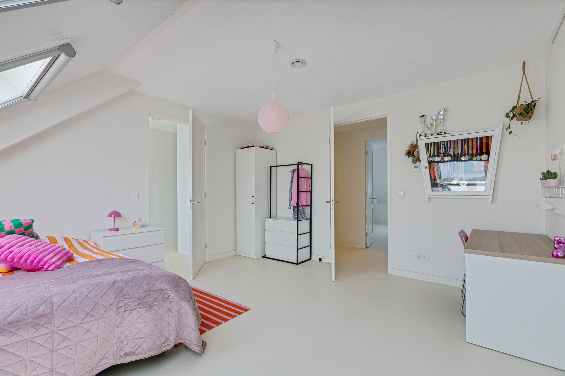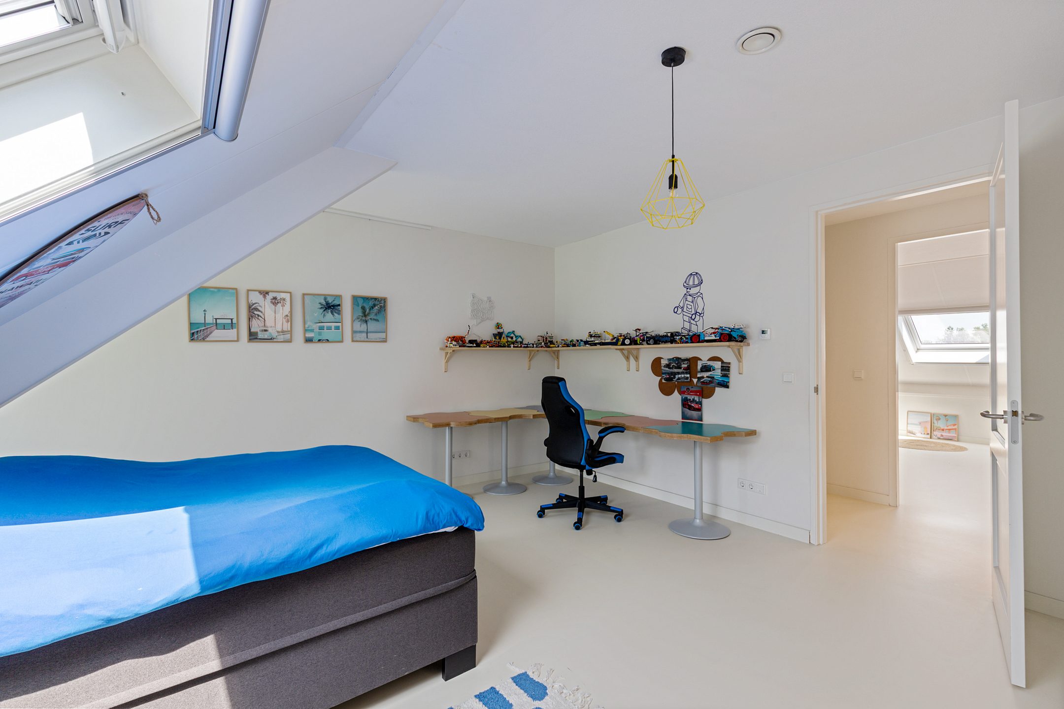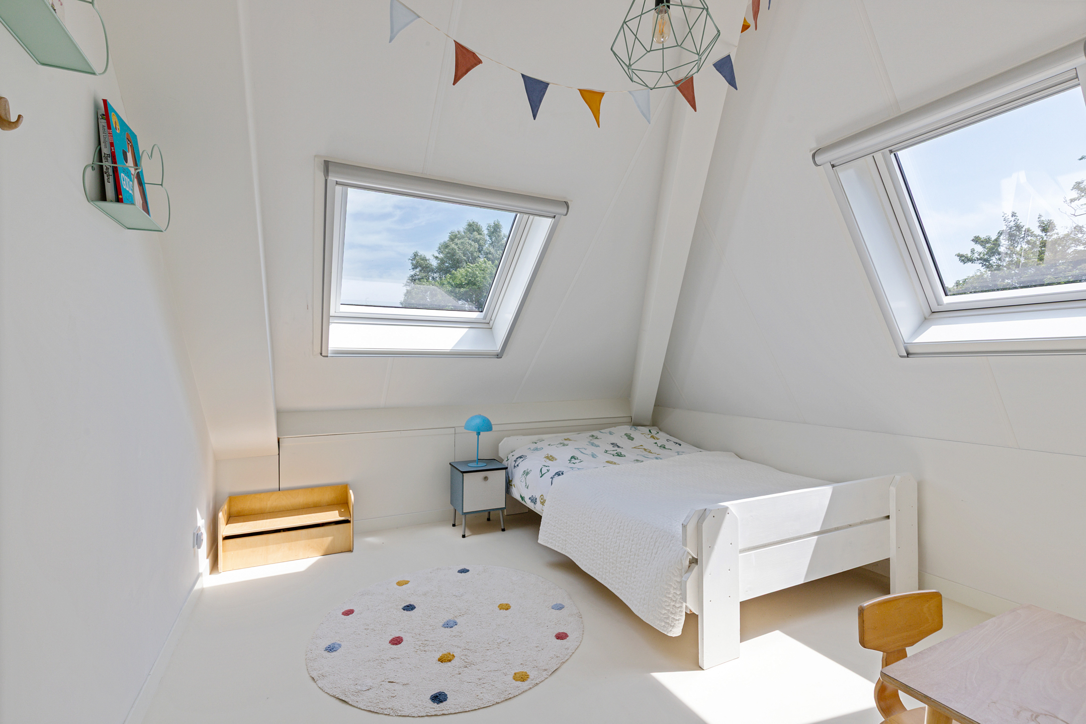 A fixed staircase leads to the fully insulated attic, with full standing height along the length of the house. Industrial steel trusses and rustic wooden beams lend this space character. Three Velux roof windows ensure ample light. Ideal as storage or for conversion into additional living or work areas.