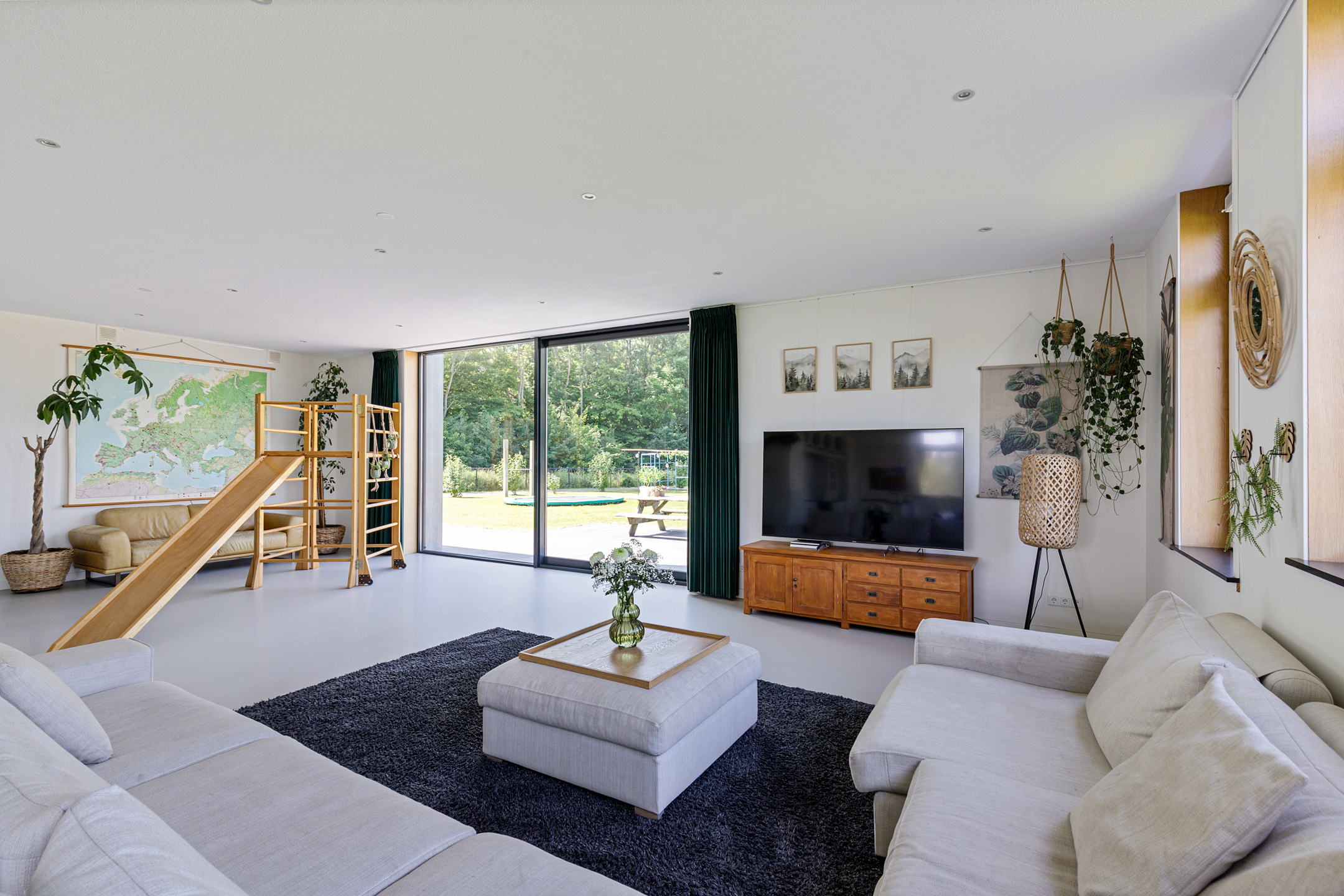 The generous plot is bordered by greenery and includes a long driveway with ample parking. The garden is playful, child-friendly and welcoming to both humans and animals. Outdoor enthusiasts will appreciate the tranquility, space and gardening opportunities here.