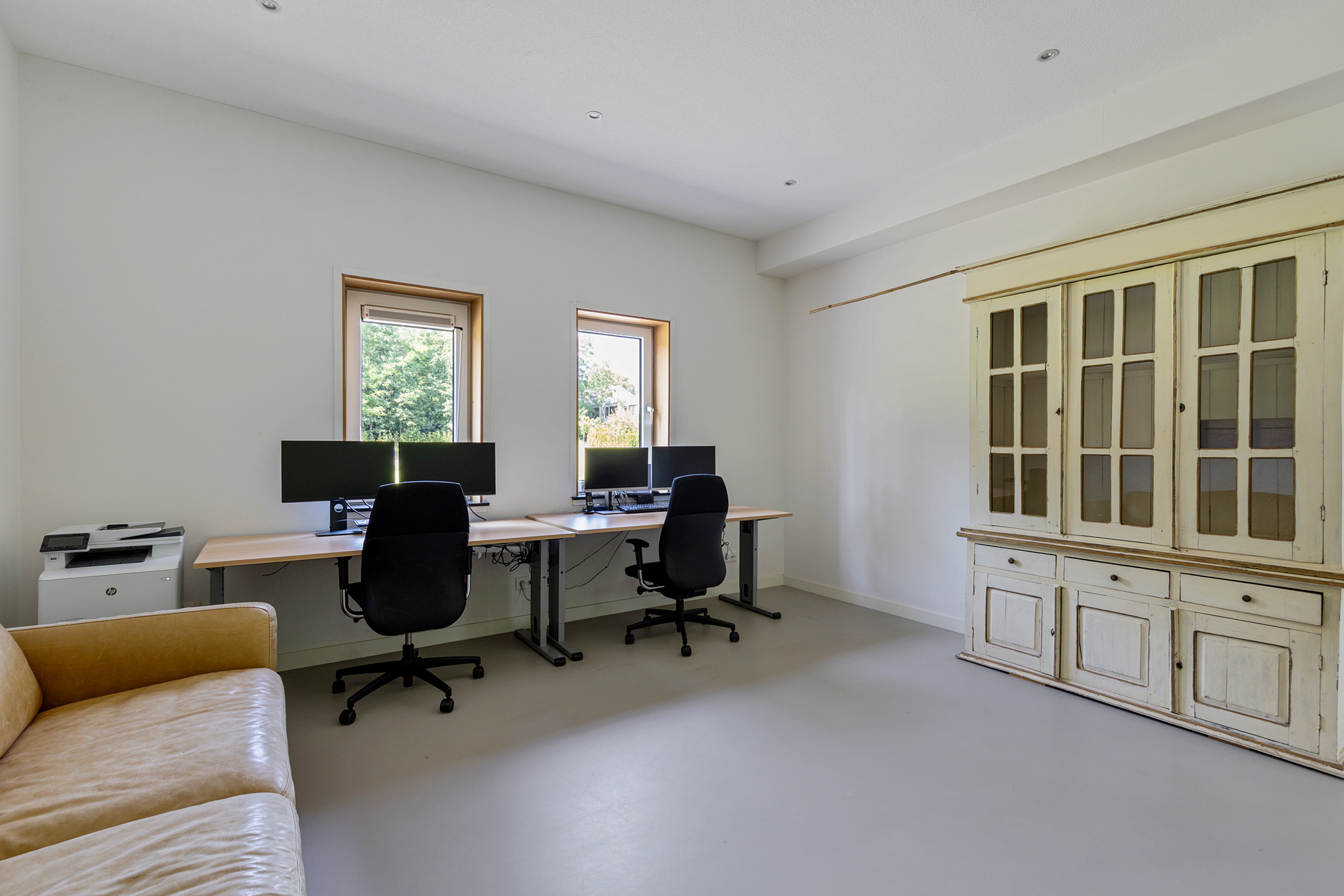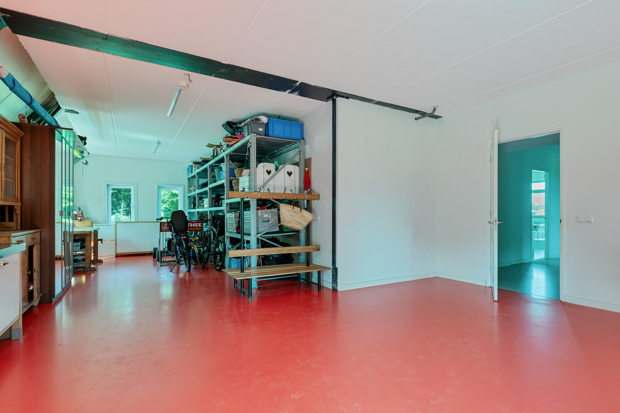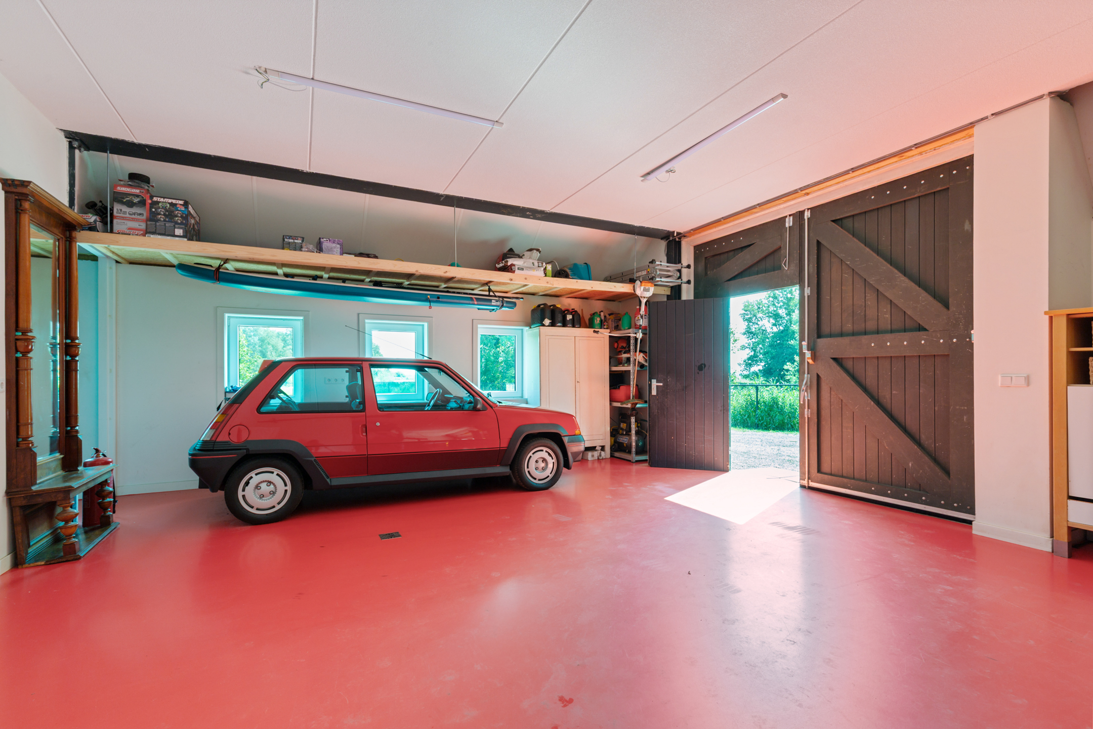 The attached barn (or *deel*), accessible from the hall, is fully insulated and features a concrete floor with underfloor heating and large windows. High double barn doors make it ideal for multiple vehicles or even a motorhome. The technical installations are also housed here. This space offers excellent potential to be converted into extra living or work space.