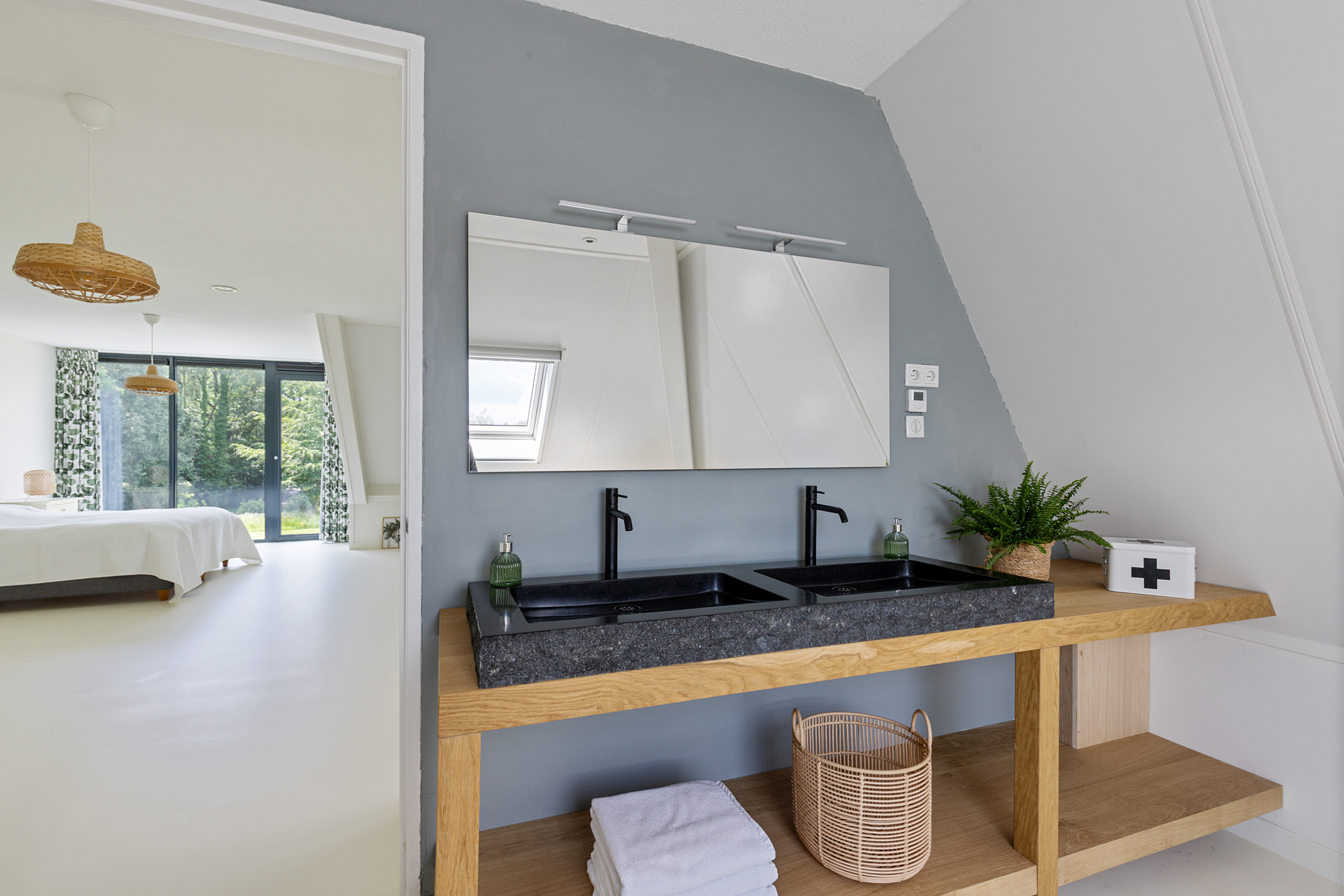 The master suite (46 m²) is a true private retreat with panoramic water views through floor-to-ceiling windows in the zinc-clad *risaliet*. An extra dormer window offers views of the adjacent nature reserve island. The luxurious en-suite includes a freestanding bathtub, double sink, walk-in shower and WC – a space that offers the perfect start to each day.