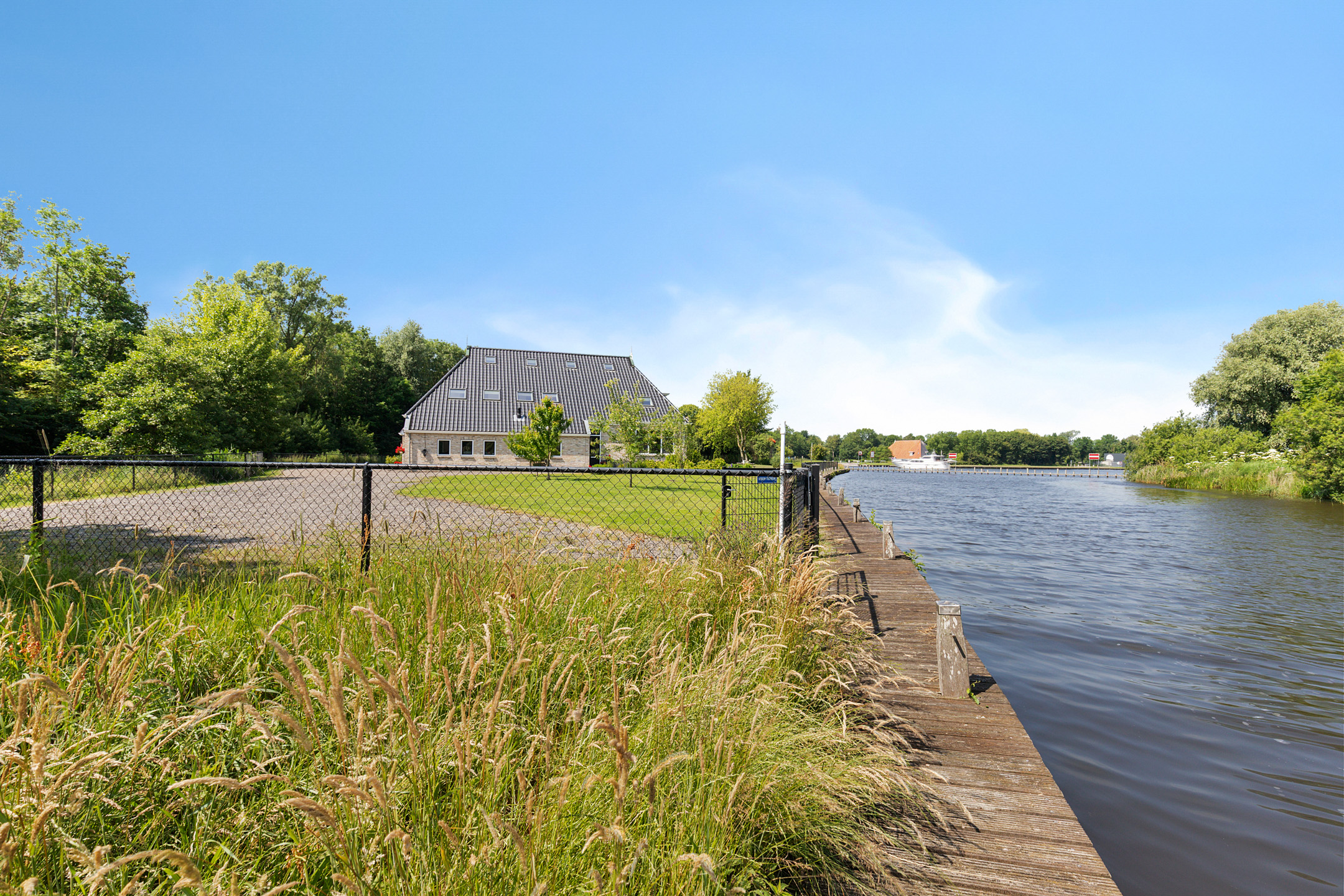 The landscaped garden is fully fenced and gently sloping, adorned with fruit trees, espaliered lindens and blooming hydrangeas. On the waterfront side, a broad private quay offers ample space to moor several boats. This calm, dead-end canal forms part of the standing mast route, offering immediate access to open water in the direction of Grou, Sneek or the IJsselmeer. All this just a short bike ride from Akkrum, with excellent road and rail links to Groningen, Zwolle and the Randstad region.