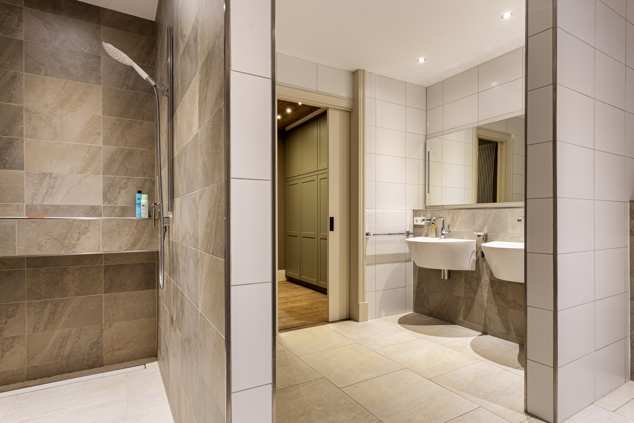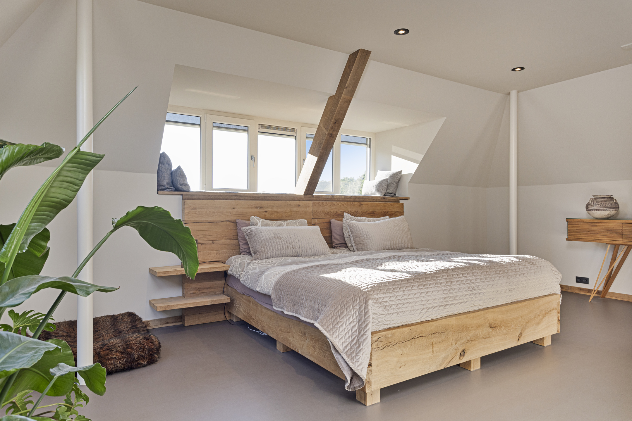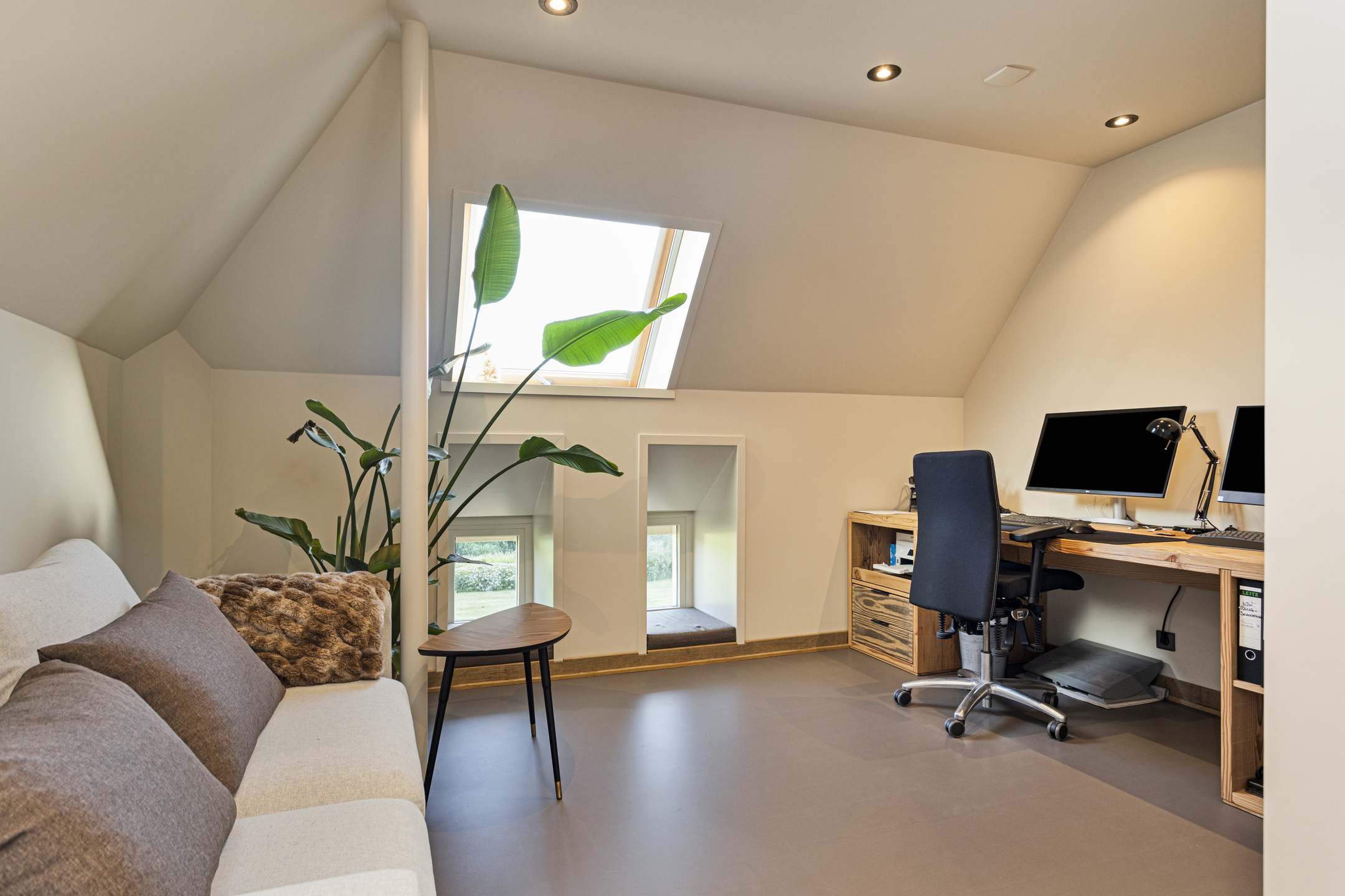 The part, where the cows used to ruminate, has been transformed into a super cool space; the rafters and the thick reed package (there is still insulation material in between) have been left in sight and the space is nice and light through the skylights. The concrete floor - ready for the installation of floor heating -, the beautiful loam stove and the staircase (forge Oldenhave from Vorden) give it a raw, industrial edge. Downstairs, two separate toilets have been installed. Upstairs, the billiard room will be realized.