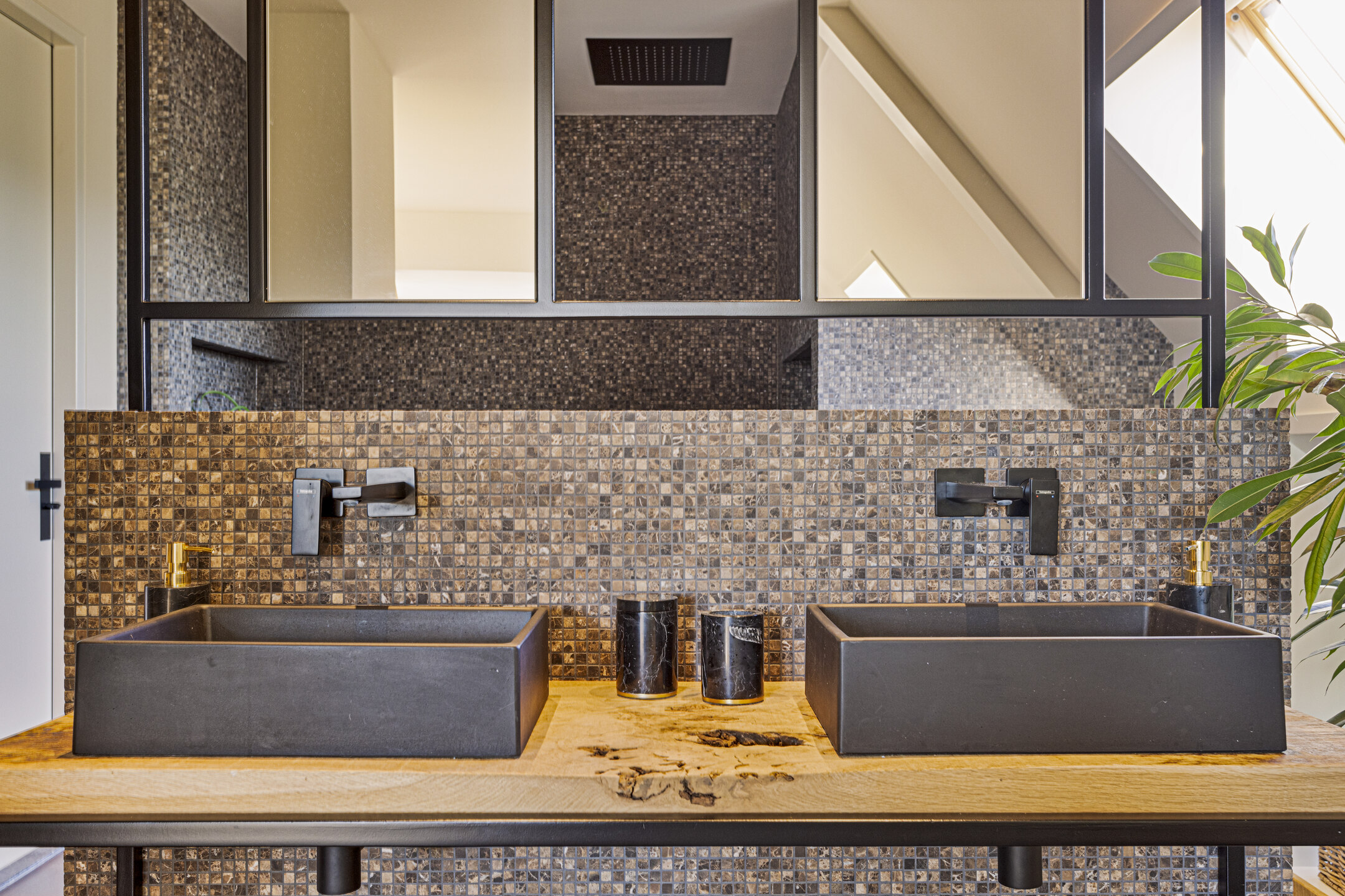 In the hall on the floor, the travertine Vieux de Bourgogne dales, which also make their reappearance in the kitchen and hallway. On the wall, a very tasteful linen structure wallpaper in a fine taupe color, which provides a beautiful background for any type of interior. Modern rustic was chosen here and all the elements work together in full harmony to create a wonderful composition. On the left the stairs to the floor, on the right the WC - out of the art with gorgeous glazed Portuguese tiles and matte black ceramic plumbing in the form of hanging closet and sink arrangement- and the access to the studio. To the left is the spacious basement.