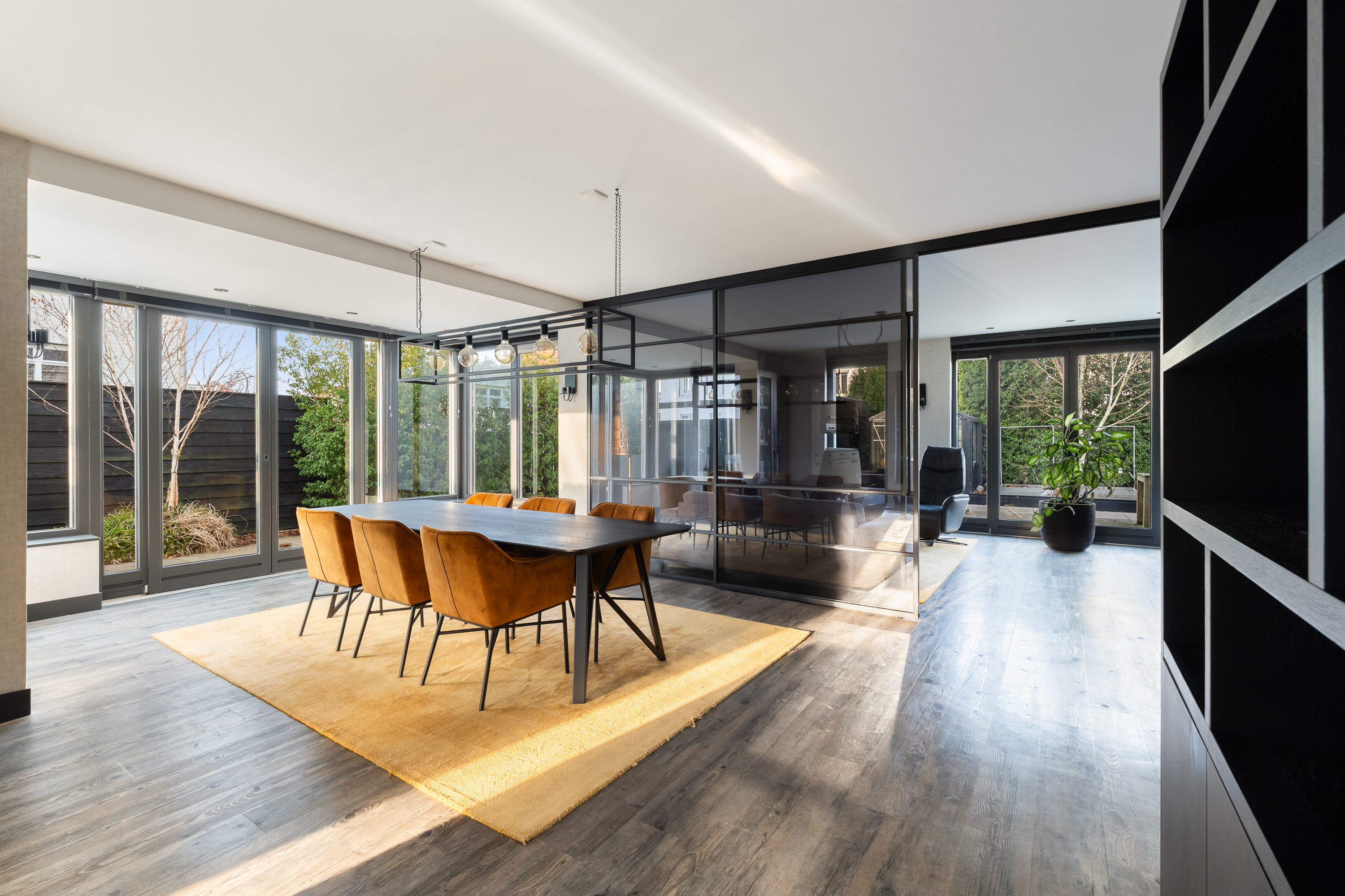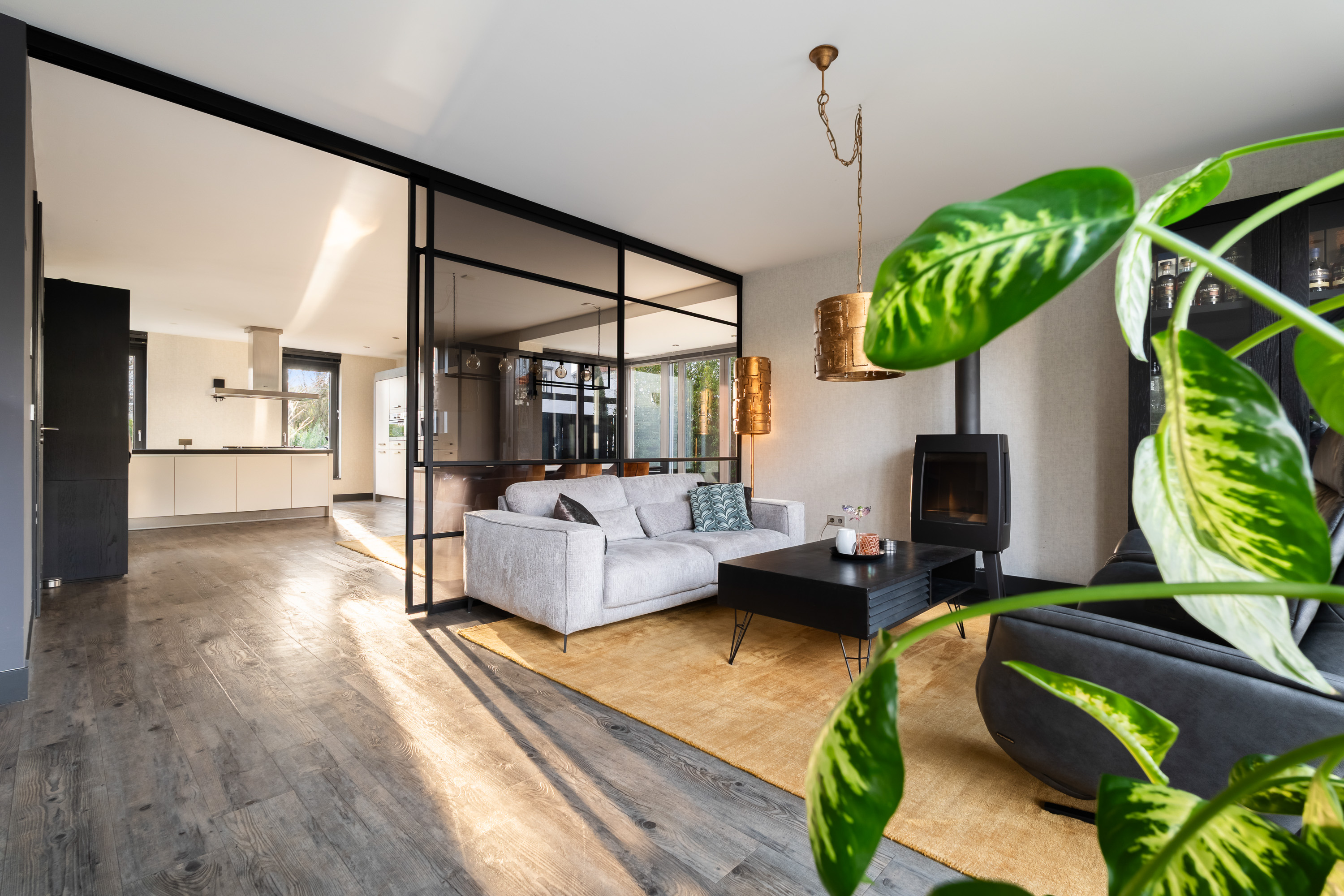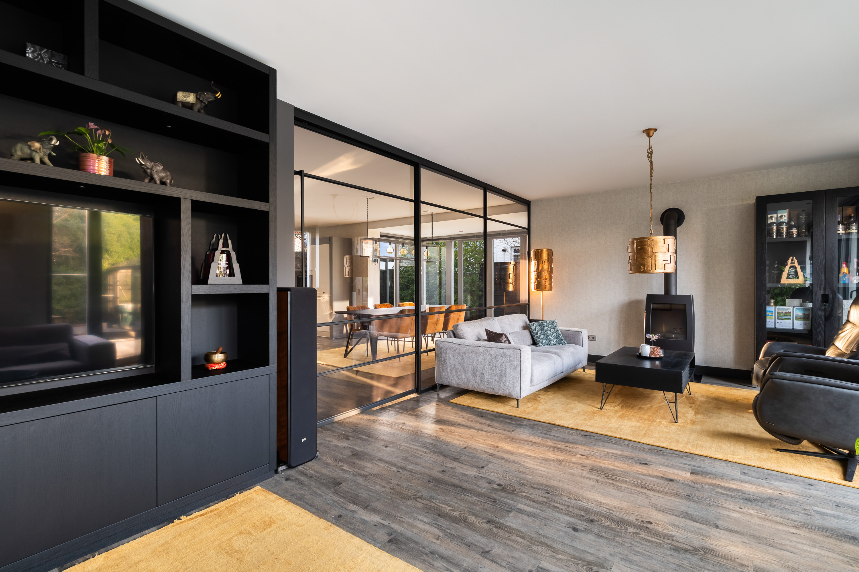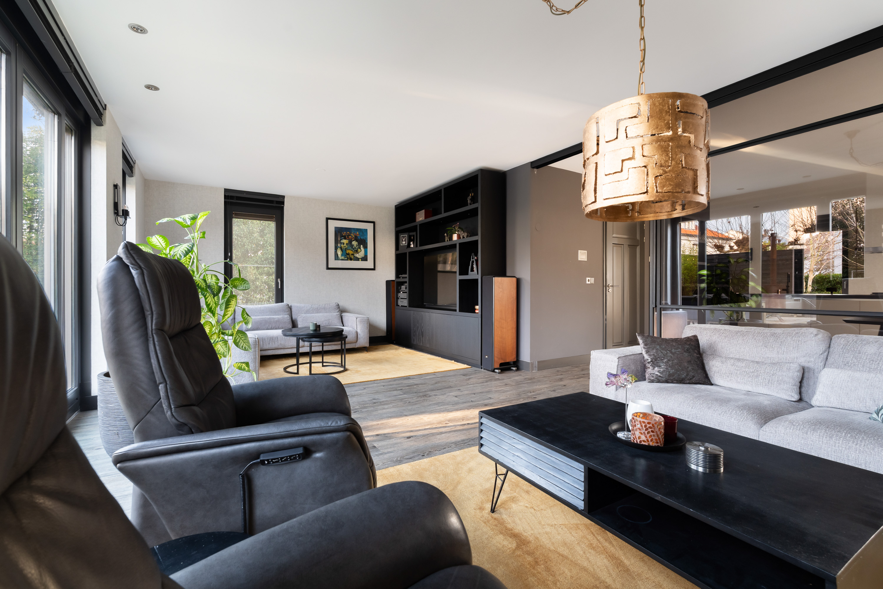 The living room is spacious and wonderfully bright. A true eye-catcher is the glass sliding wall with smoked glass, which stylishly separates the living room from the TV and reading room. This feature provides additional privacy without compromising the open character of the living space.