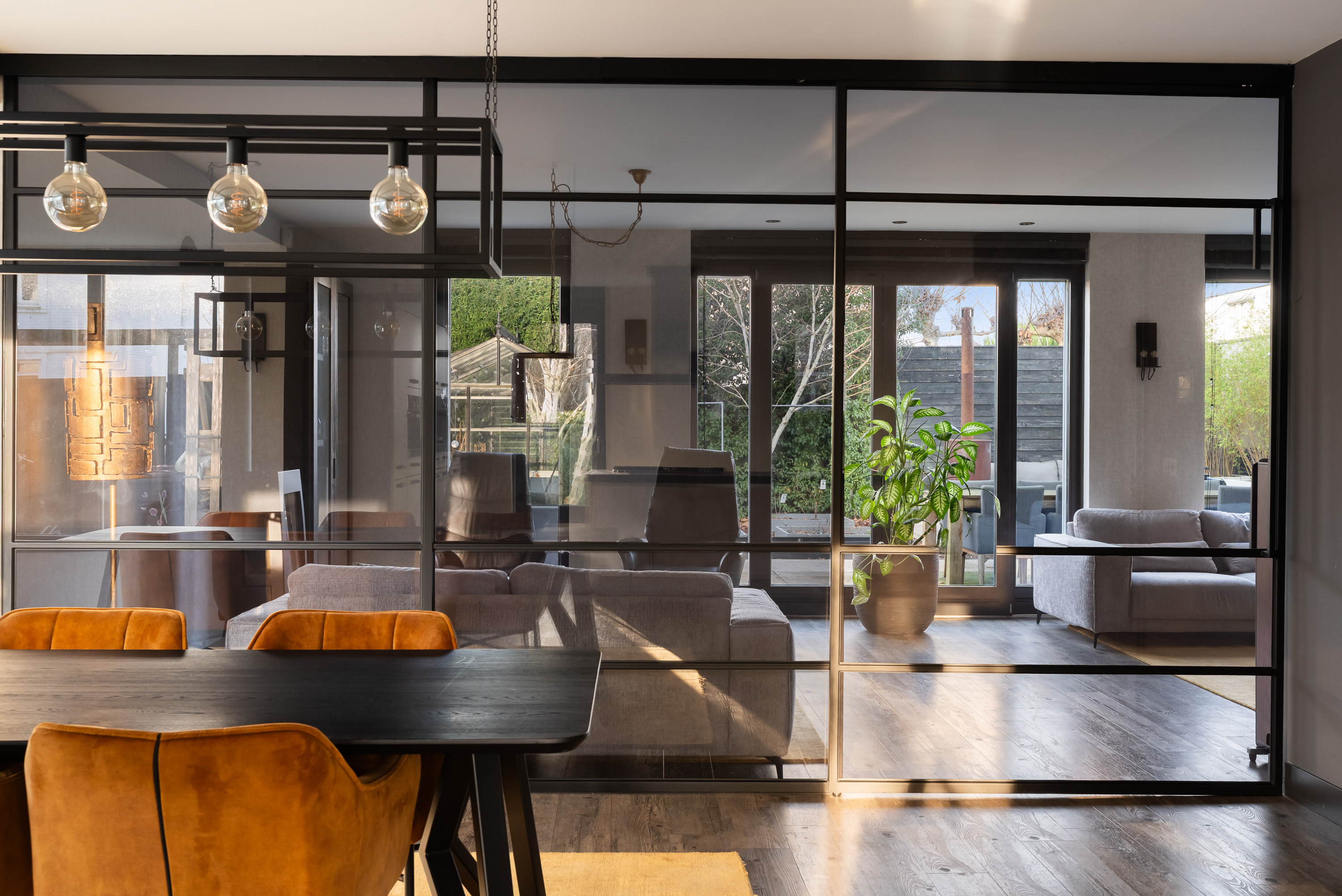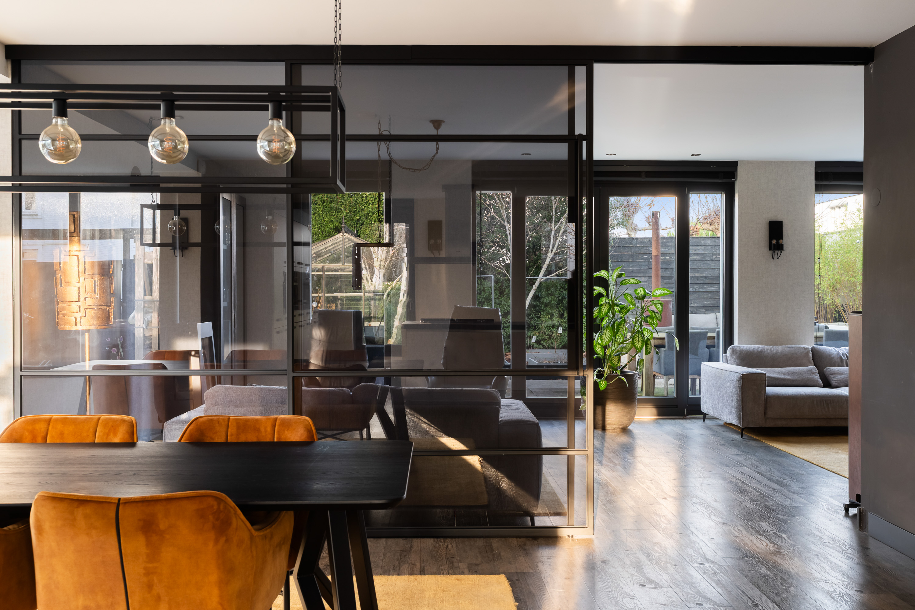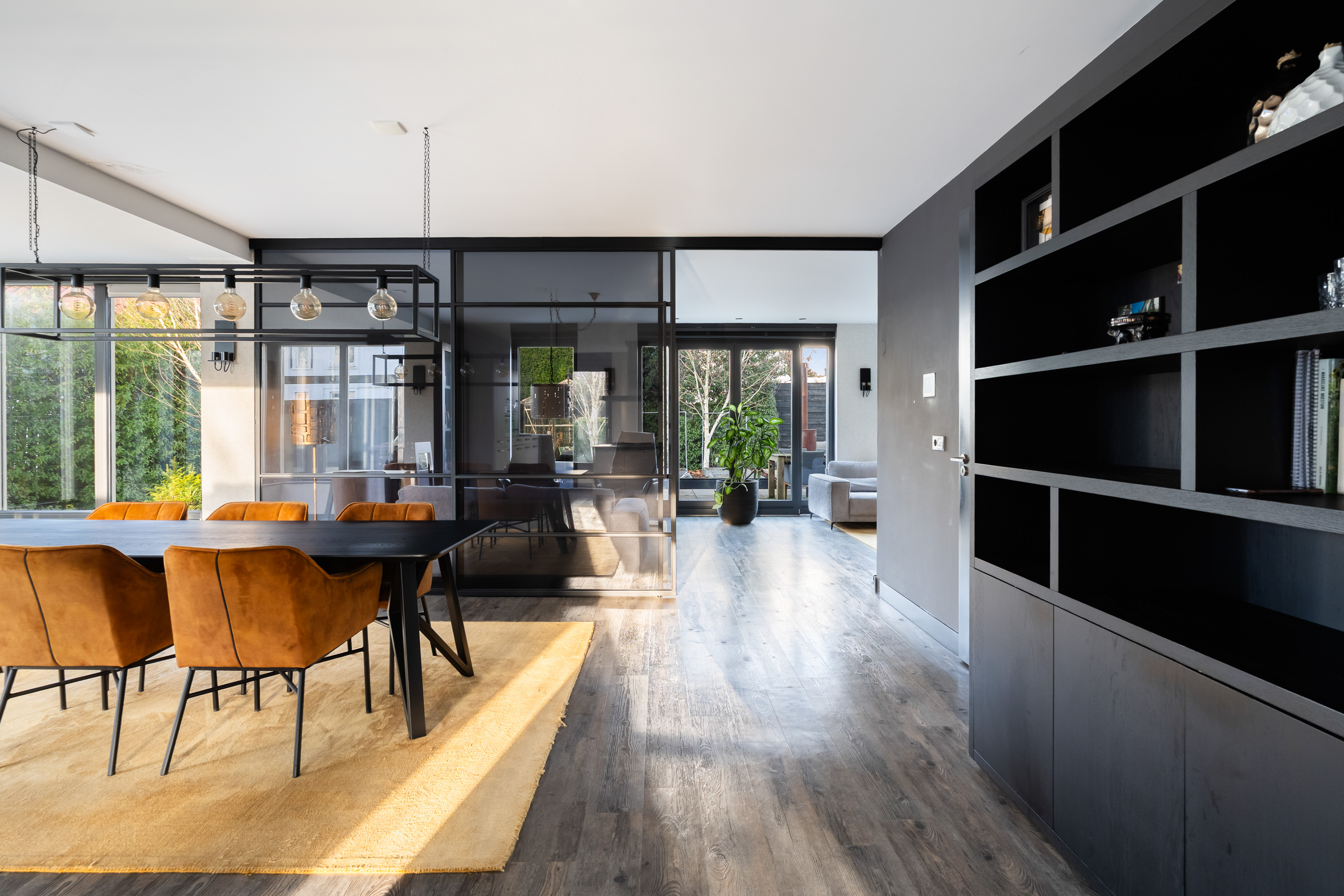 The living room is spacious and wonderfully bright. A true eye-catcher is the glass sliding wall with smoked glass, which stylishly separates the living room from the TV and reading room. This feature provides additional privacy without compromising the open character of the living space.