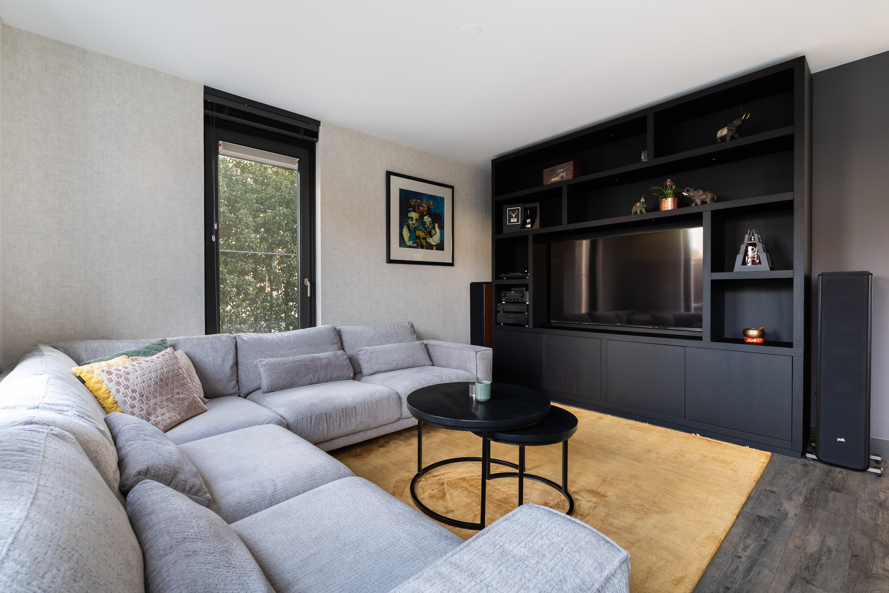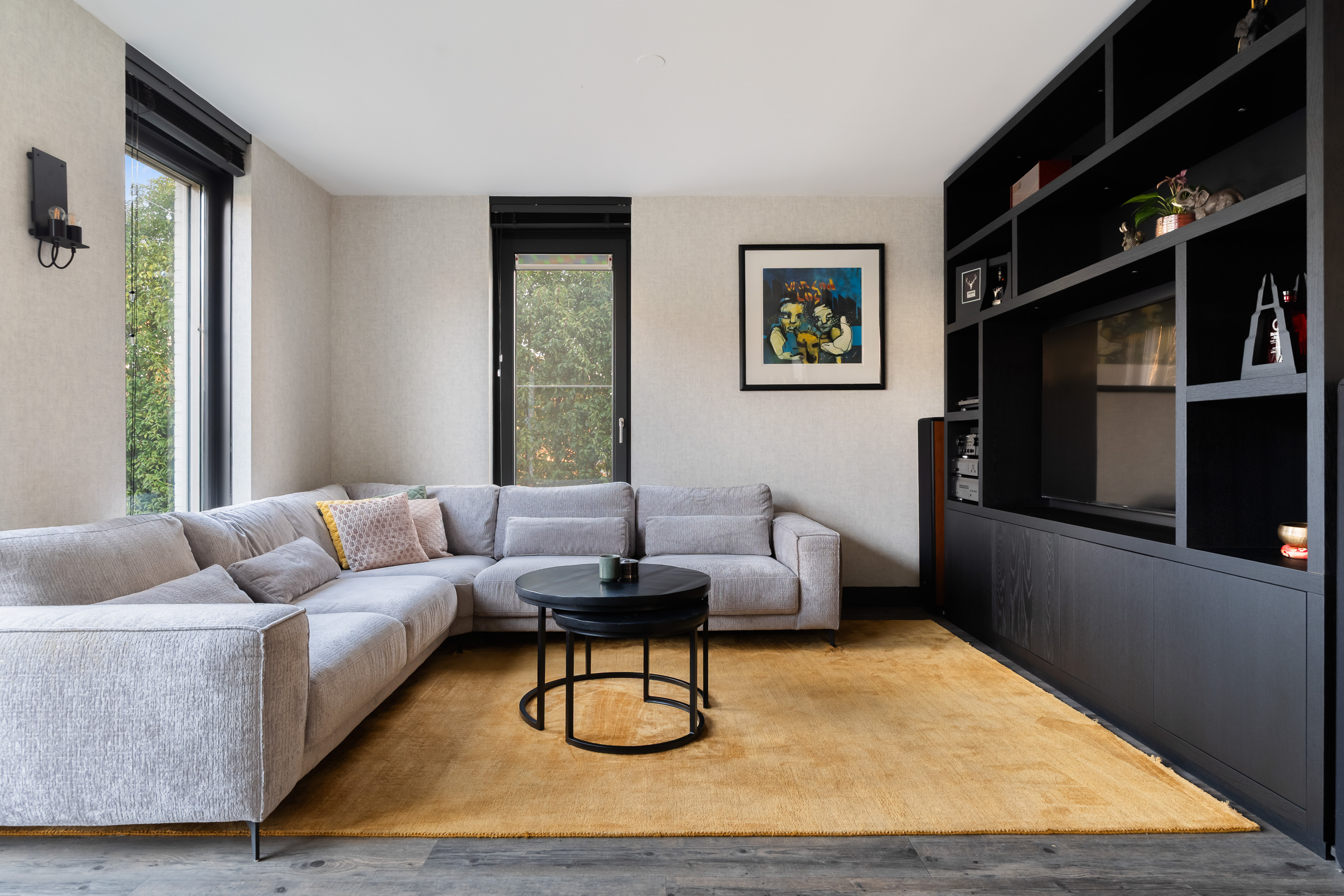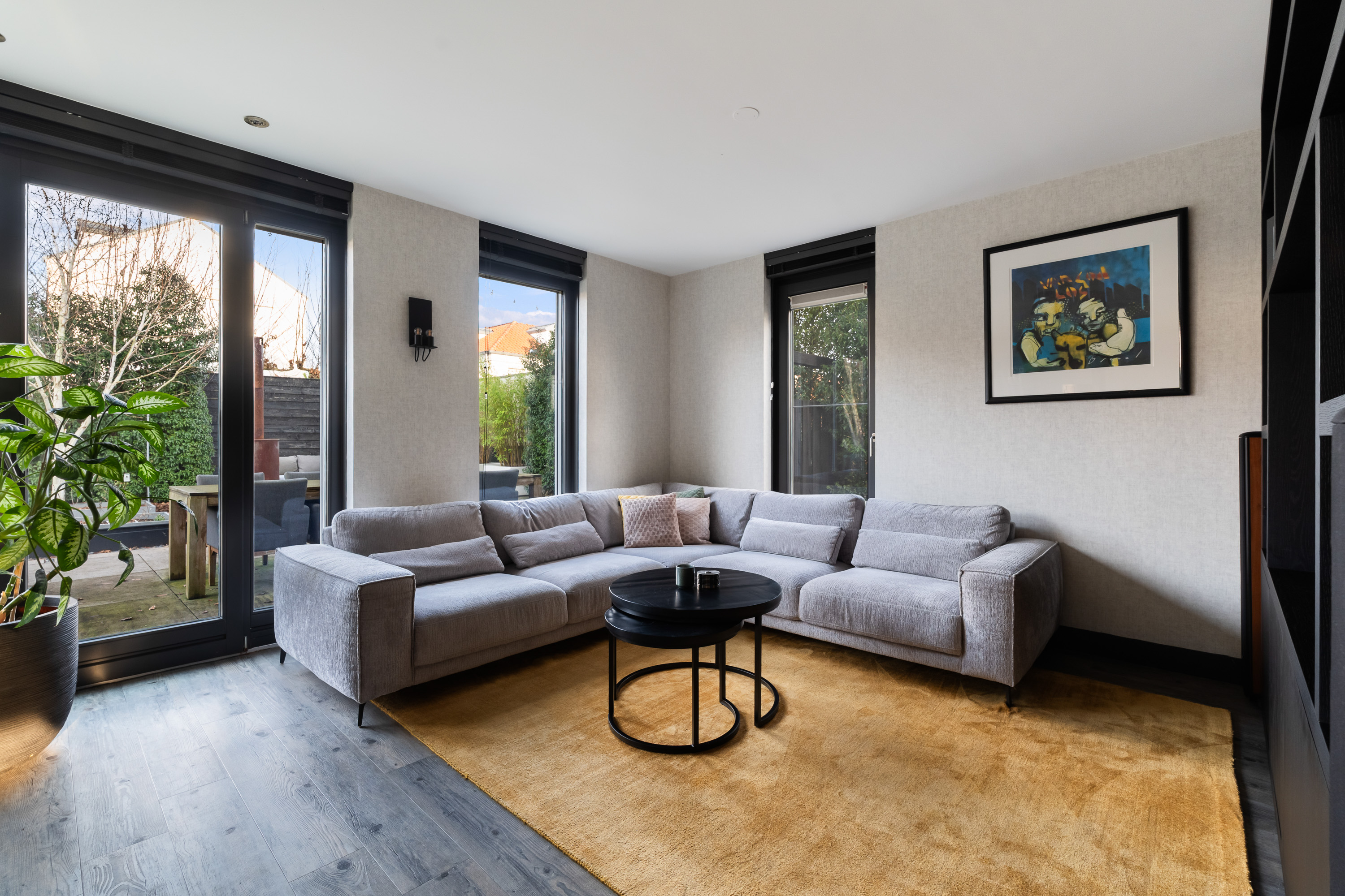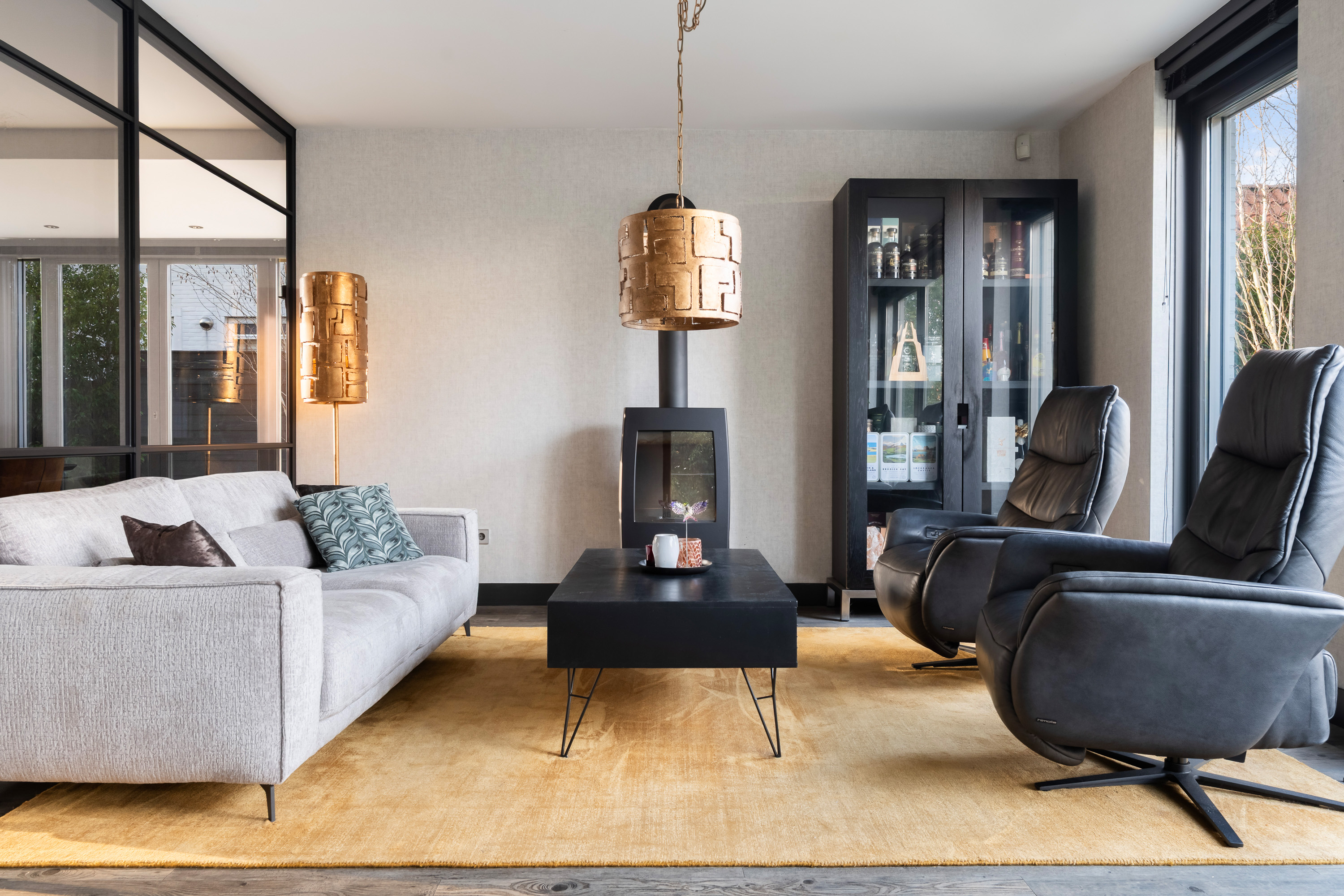 The living room is spacious and wonderfully bright. A true eye-catcher is the glass sliding wall with smoked glass, which stylishly separates the living room from the TV and reading room. This feature provides additional privacy without compromising the open character of the living space.