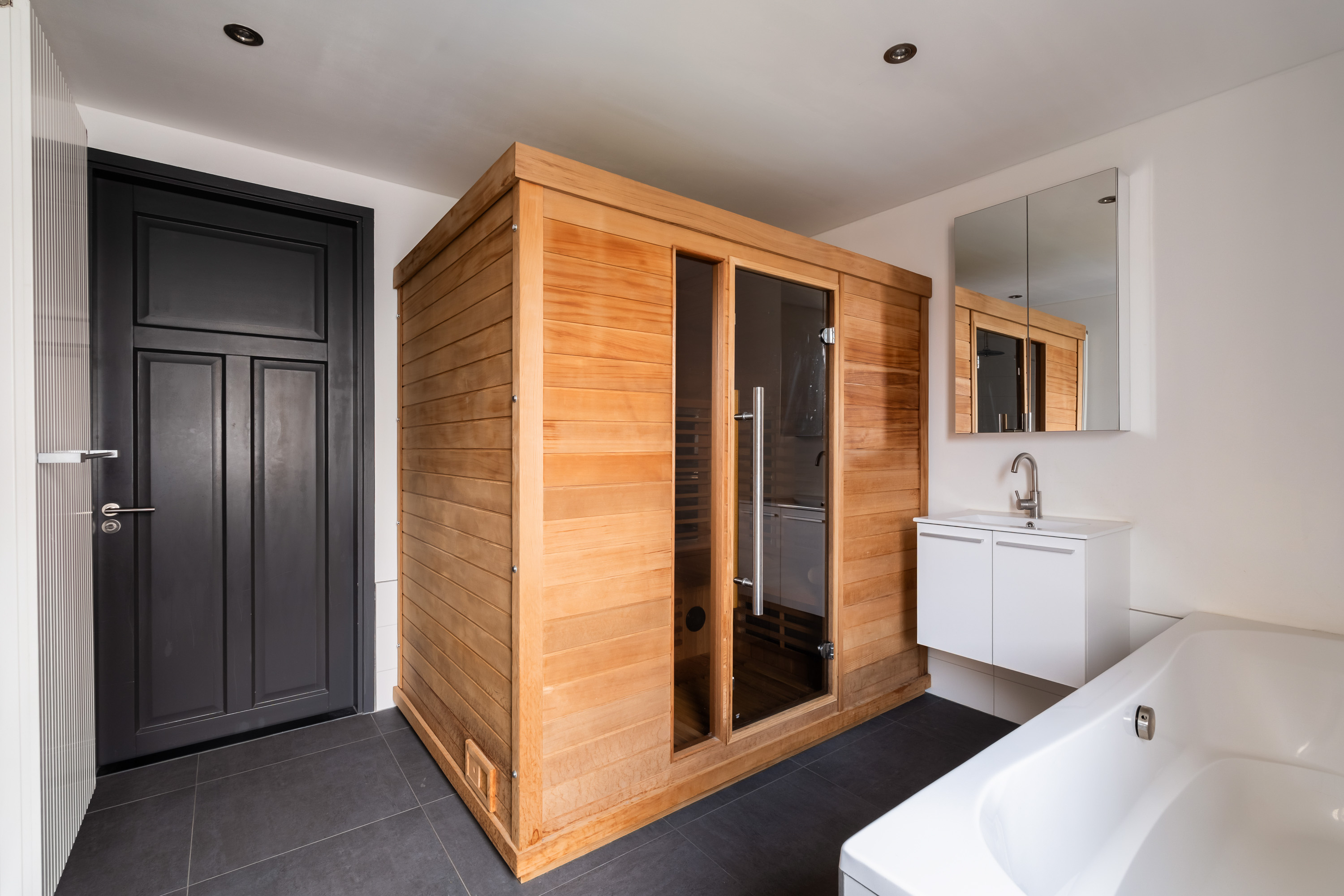 Bathroom with bathtub, rain shower and Finnish sauna with infrared