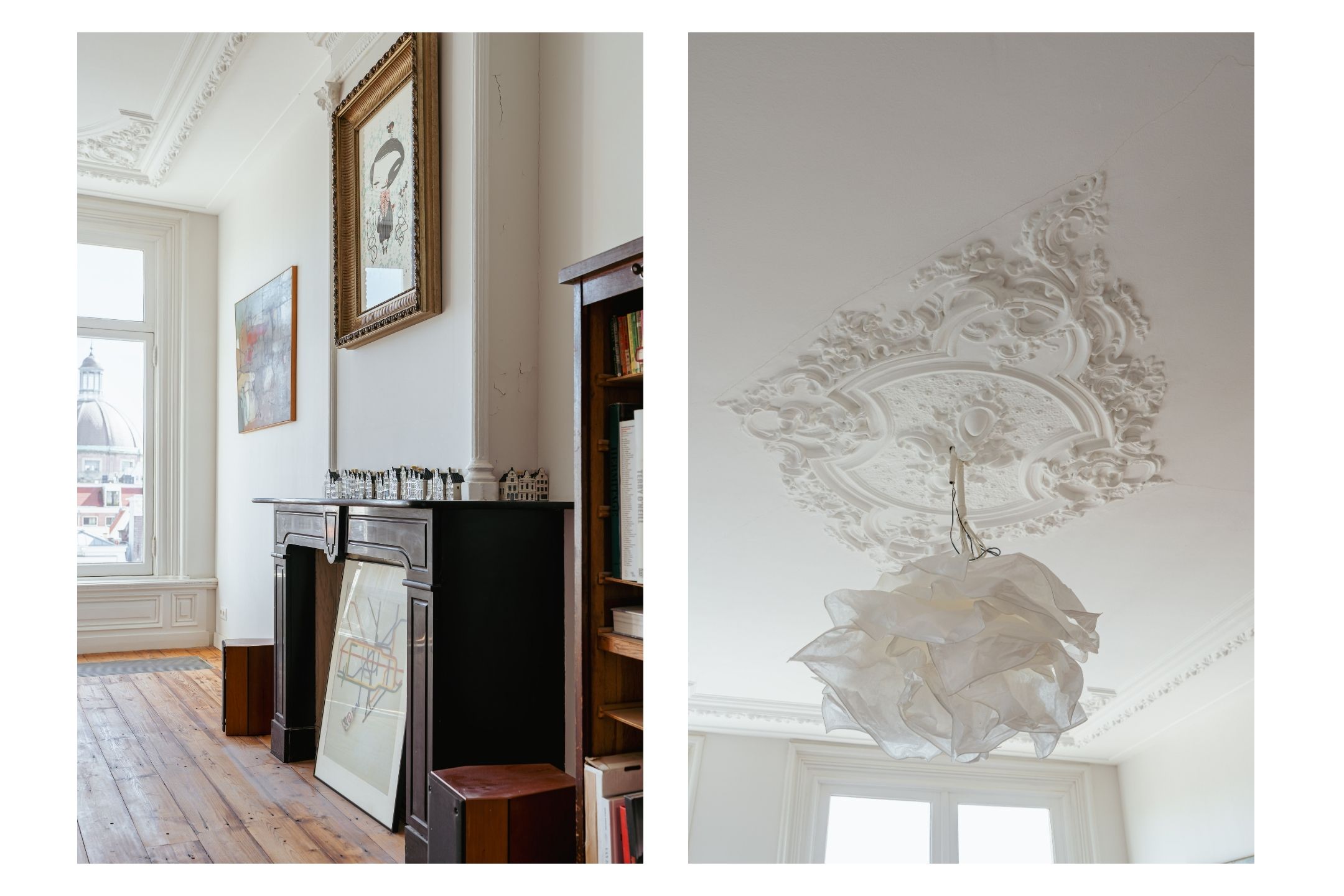 Each floor has spacious rooms with high ceilings, original ornaments, and paneled doors. Large windows at both the front and rear provide abundant natural light and offer characteristic views: at the front over the Herengracht and from the upper floors towards the Koepelkerk. Features such as marble fireplaces, decorative ceiling moldings, and built-in cupboards have been preserved on various levels, maintaining the authentic atmosphere.