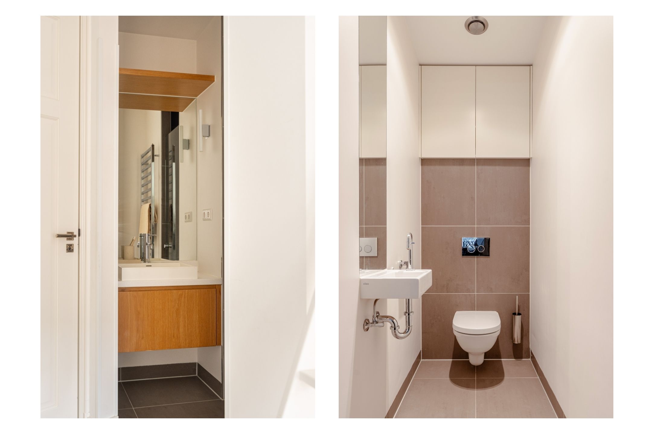 The modern bathroom is fitted with a spacious bathtub, a double washbasin with vanity unit and a toilet. This floor also houses the connections for a washing machine and dryer.