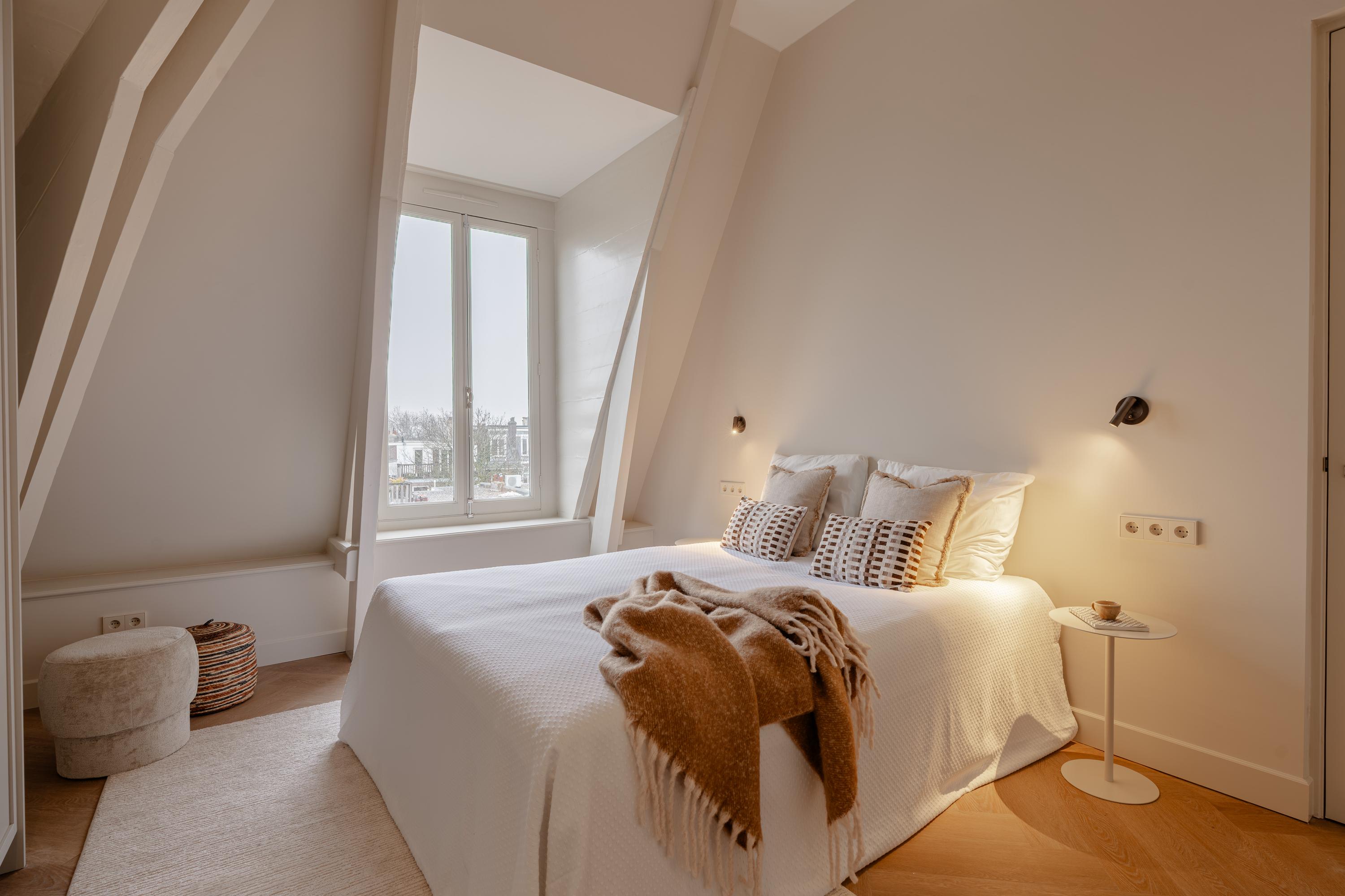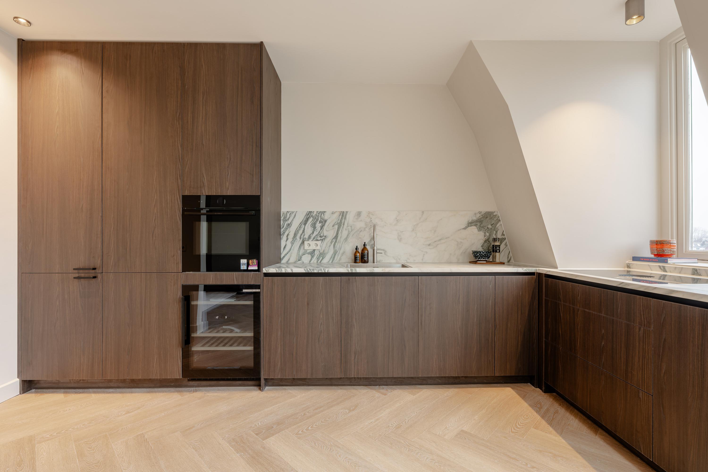This luxurious apartment is located on the fourth floor and is characterised by a spacious and light-filled design, featuring high ceilings and striking, angled skylights at the rear. These large windows give the apartment a distinctive character and provide exceptional natural light throughout the day, along with open, green views across the city. The living room and kitchen are situated at the rear of the apartment and together form one generous living space. The unique roof structure, combined with the large skylights, creates an open and architecturally interesting atmosphere with abundant daylight and attractive sightlines. There is ample space for both a comfortable seating area and a large dining table. The luxurious kitchen is finished in a sleek and timeless design and integrates seamlessly with the living area. It is equipped with an induction hob, sink with Quooker, combi oven, climate cabinet, dishwasher, separate refrigerator and freezer, and offers generous workspace and storage capacity. At the front of the apartment are two well-proportioned and quietly located bedrooms. The master bedroom features an en-suite bathroom fitted with a walk-in shower and a double washbasin with vanity unit. Centrally located on the landing is the second bathroom, also equipped with a walk-in shower and a washbasin with vanity unit. In addition, there is a separate toilet and practical built-in storage. The roof terrace is accessible via an internal staircase. This spacious terrace offers a high level of privacy and has been structurally prepared for the installation of a jacuzzi, including a double electrical group. Provisions have also been made for an outdoor shower (water connection) and for the installation of an outdoor kitchen (water and electricity connections), making this outdoor space a valuable extension of the living comfort.