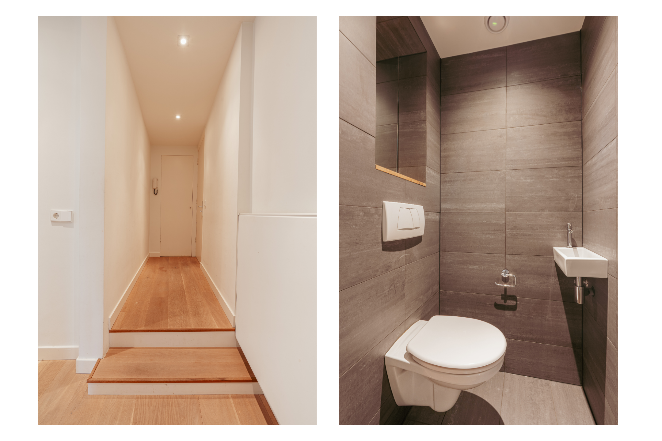 An open staircase in the living room leads to the first floor, which also has its own entrance via the communal staircase. The spacious hallway provides ample space for a coat area and additional storage. Here, you will find the first bathroom, fitted with a walk-in shower, washbasin unit, and a separate WC with a small sink.