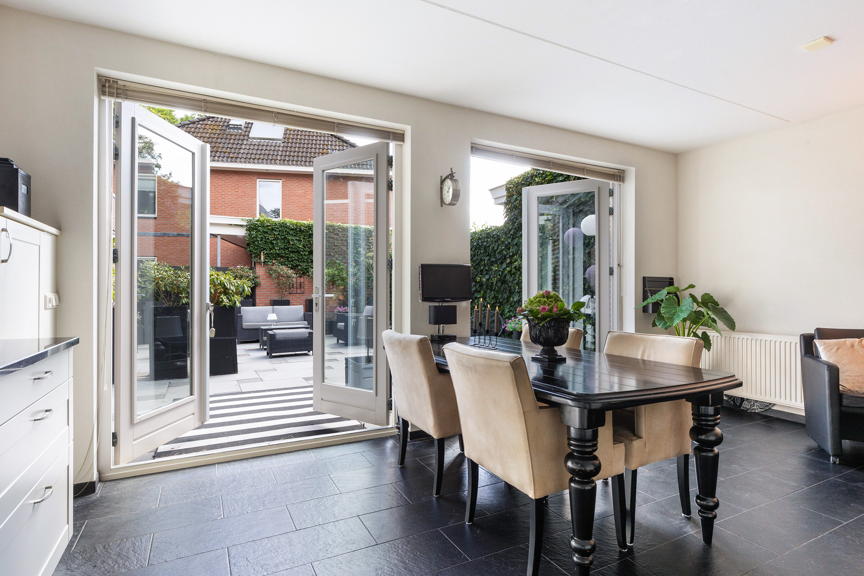 Aan de achterzijde bevindt zich de royale woonkeuken van circa 26 m². De keuken is in een praktische L-opstelling geplaatst en voorzien van diverse inbouwapparatuur, waaronder een vaatwasser, inductiekookplaat, koelkast en vrieskast. De ruime opzet biedt volop plek voor een grote eettafel, waardoor dit de ideale plek is om met het hele gezin of met vrienden samen te komen. Dankzij de twee openslaande deuren is er een directe verbinding met de zonnige achtertuin.