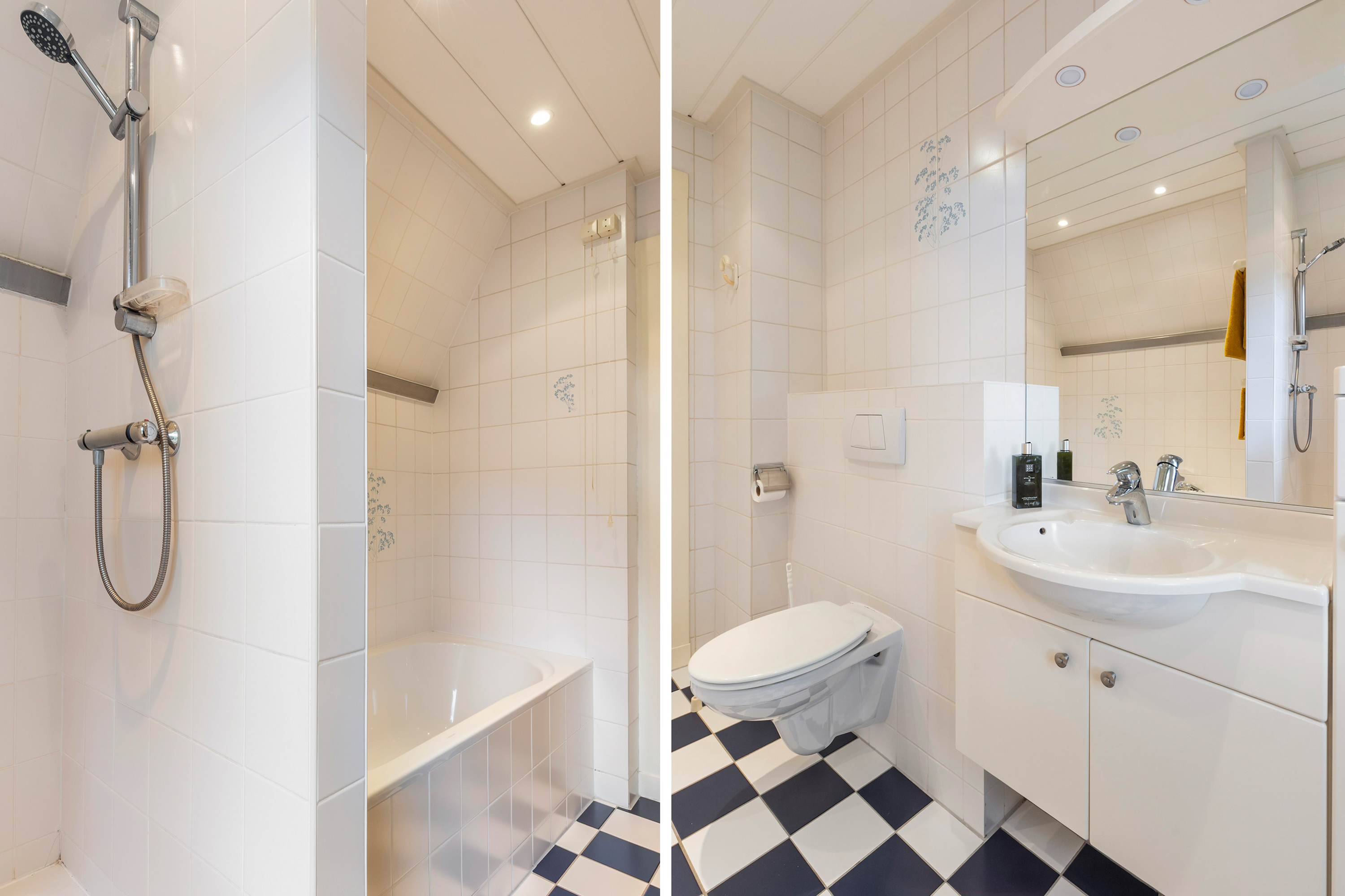 Adjoining is the utility room, tiled and equipped with connections for a washing machine and dryer. The Nefit HR boiler is located here, together with extra storage space for provisions or household appliances. A door provides access to the outside.
