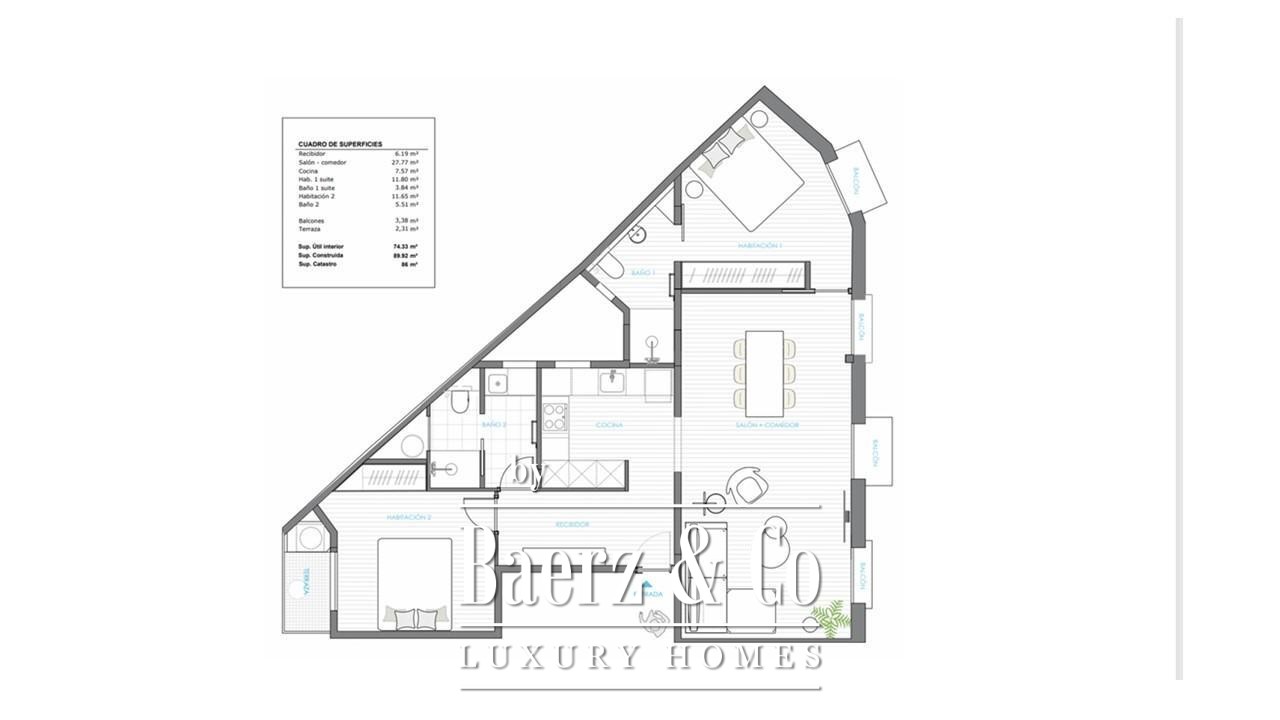 The open-plan living and dining area is designed for both relaxation and entertaining, with a fully equipped kitchen blending integrated appliances and practical design. The night area features two double bedrooms, each benefitting from abundant natural light. The master suite includes an en suite bathroom with a walk-in shower and elegant fixtures, reflecting the apartment’s overall sense of sophistication.