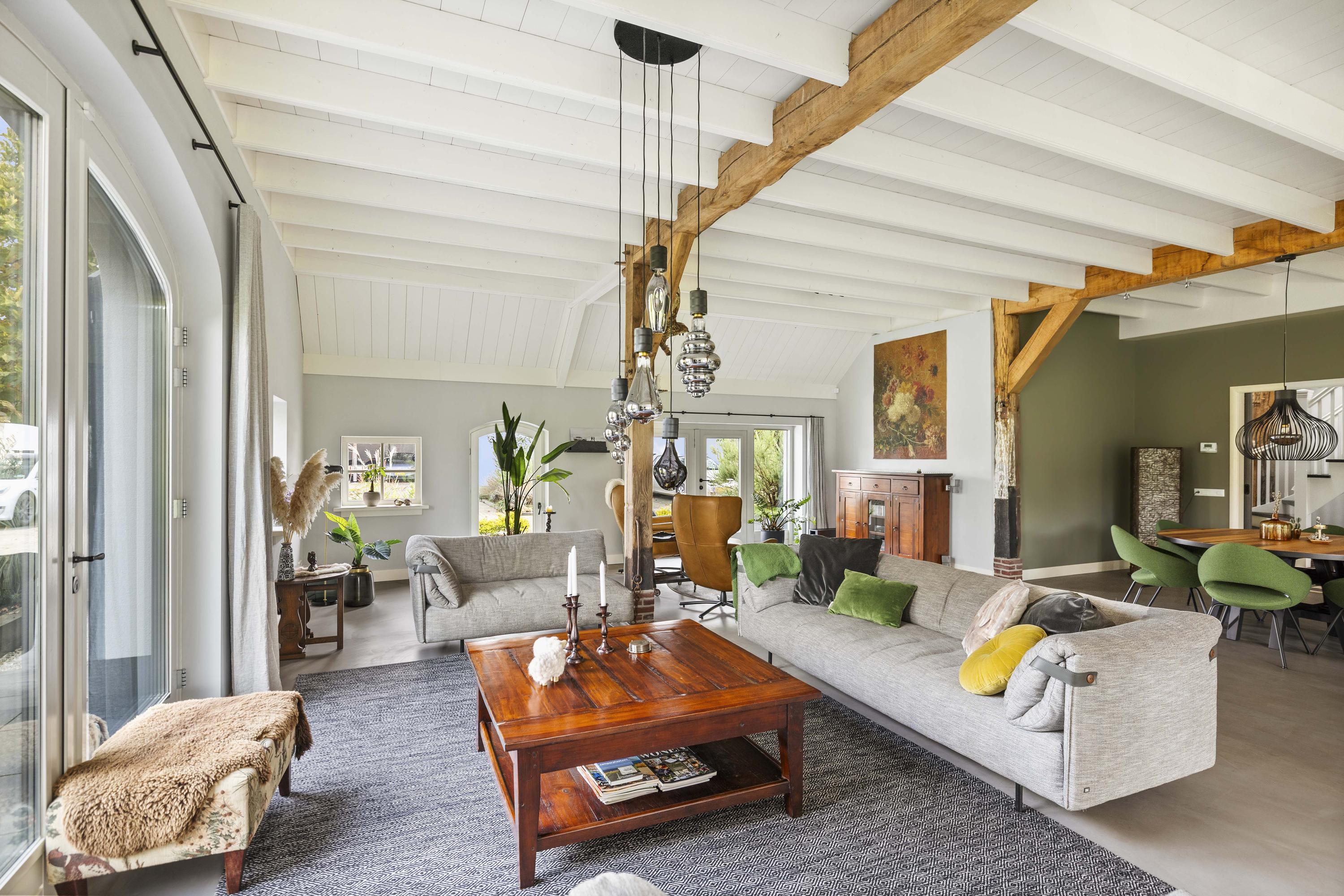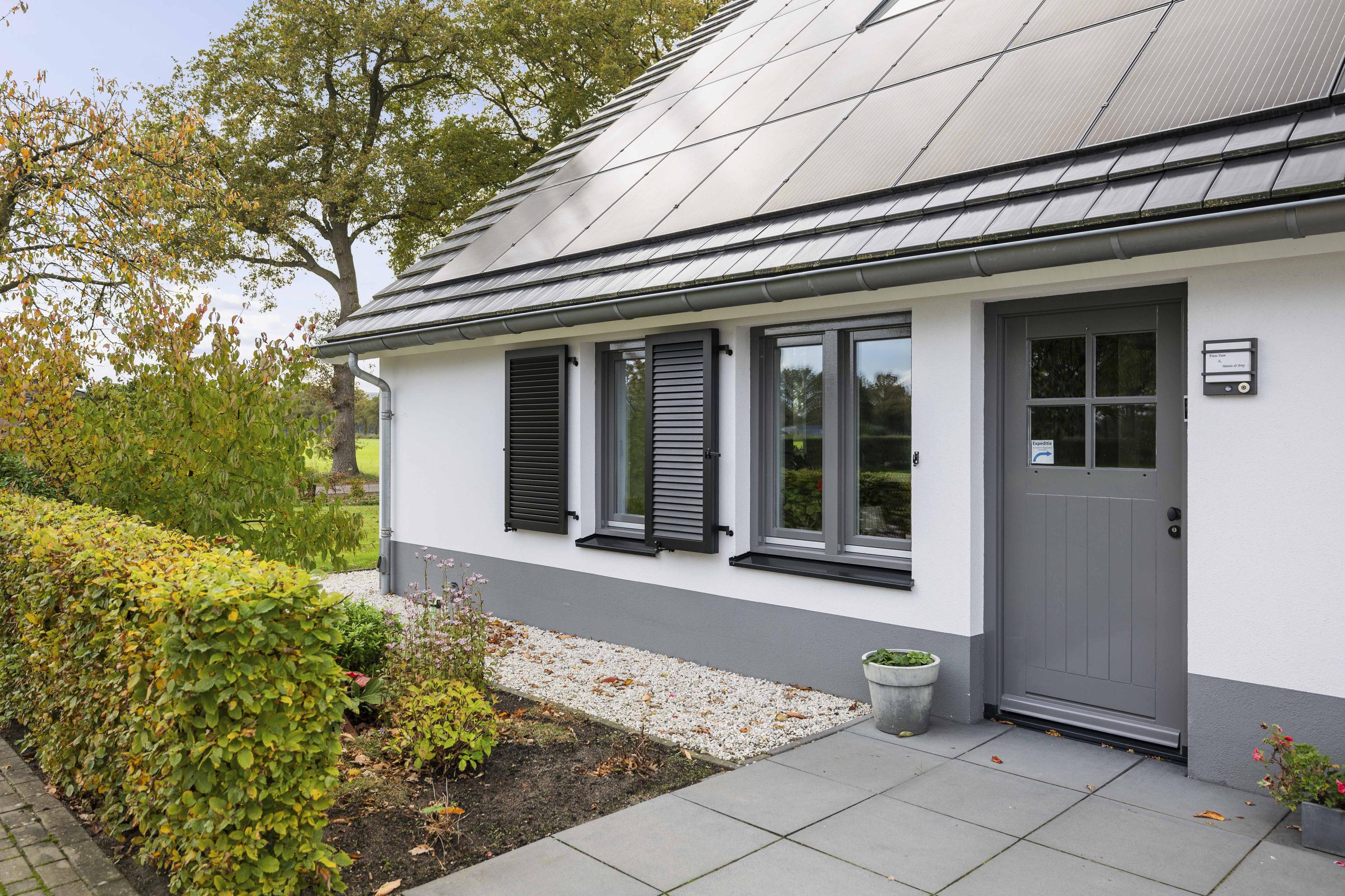 This magnificent farmhouse took on its current form in 2016, when the farm, which was built in 1924, was completely renovated. The emphasis was on sustainability: the exterior was fully insulated with polystyrene blocks, the house was fitted with new HR+++ glass all around, a water-water heat pump was installed (which exchanges and extracts heat at a depth of 75 metres), the interior floor was fitted with a robust cast floor – ideal in combination with underfloor heating – and a total of 110 (no, this is not a typo) solar panels were installed on the roofs. Under the bonnet, this house is all state-of-the-art technical ingenuity. Even the colour palette – the exterior is whitewashed with grey woodwork and beaded edging – contributes to the energy-efficient character of the house, because while the white facades reflect sunlight, the grey absorbs heat. Not only does this house have zero energy consumption, it also generates a considerable amount of energy! A home battery is therefore an excellent addition here.