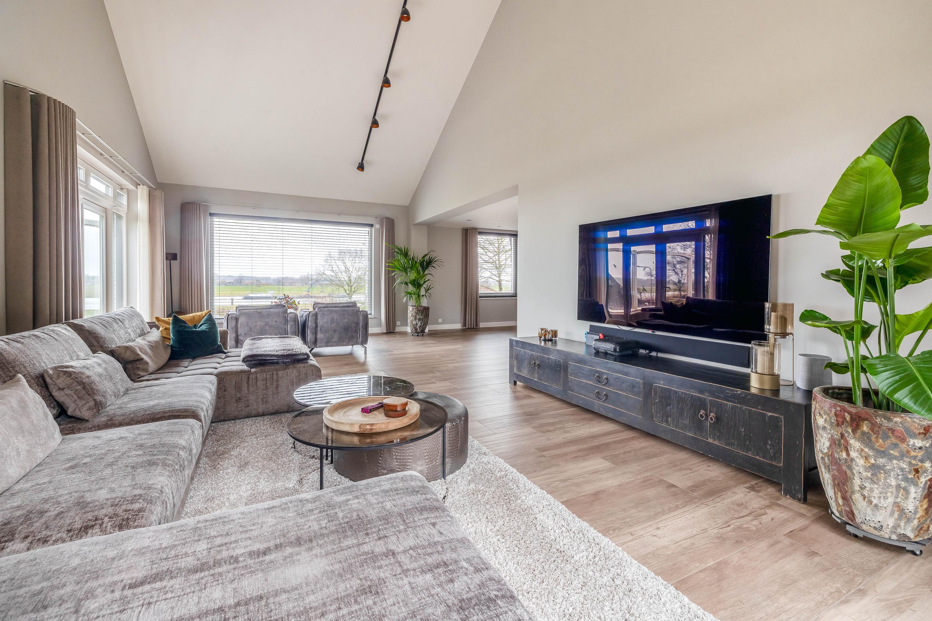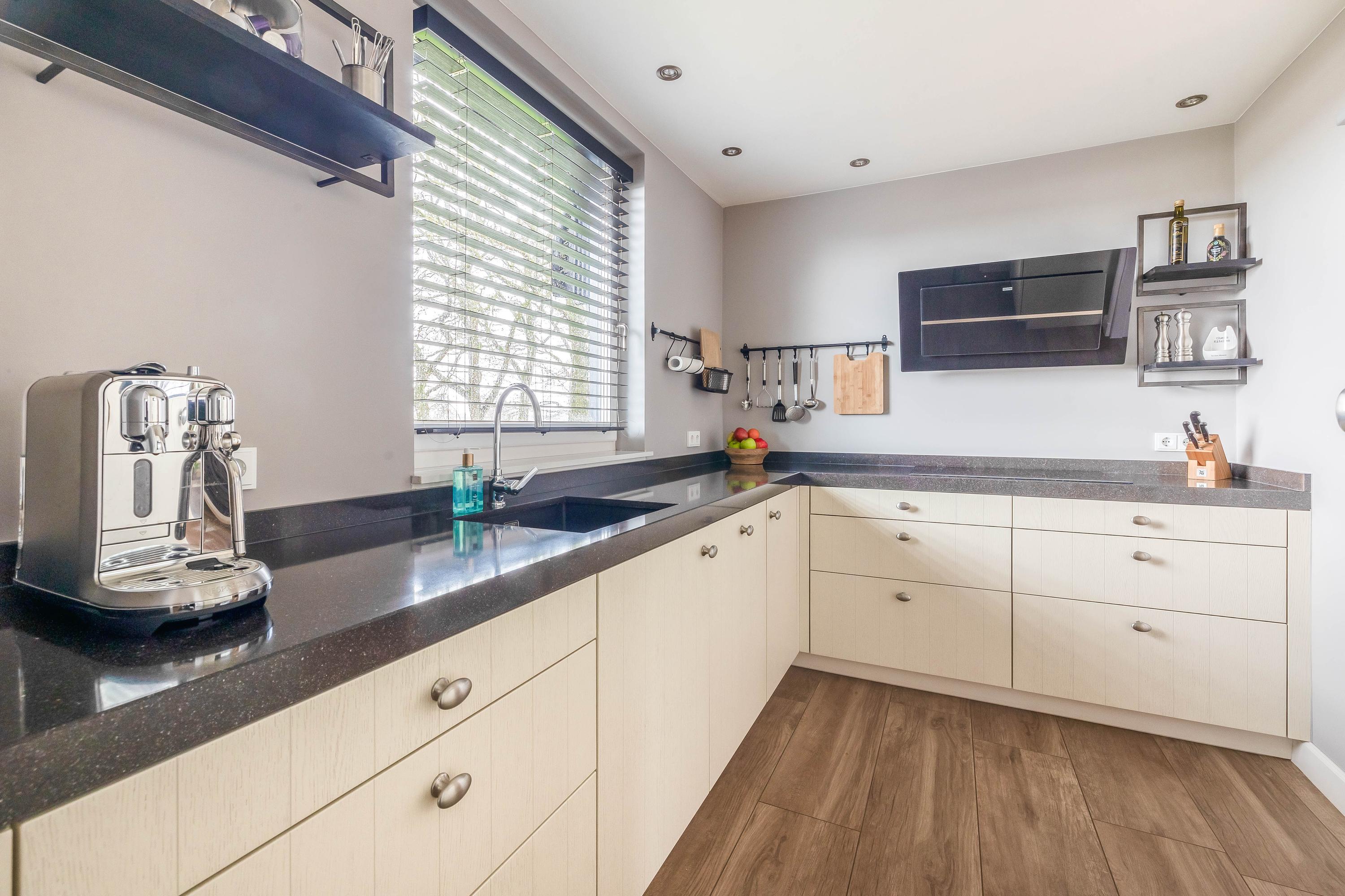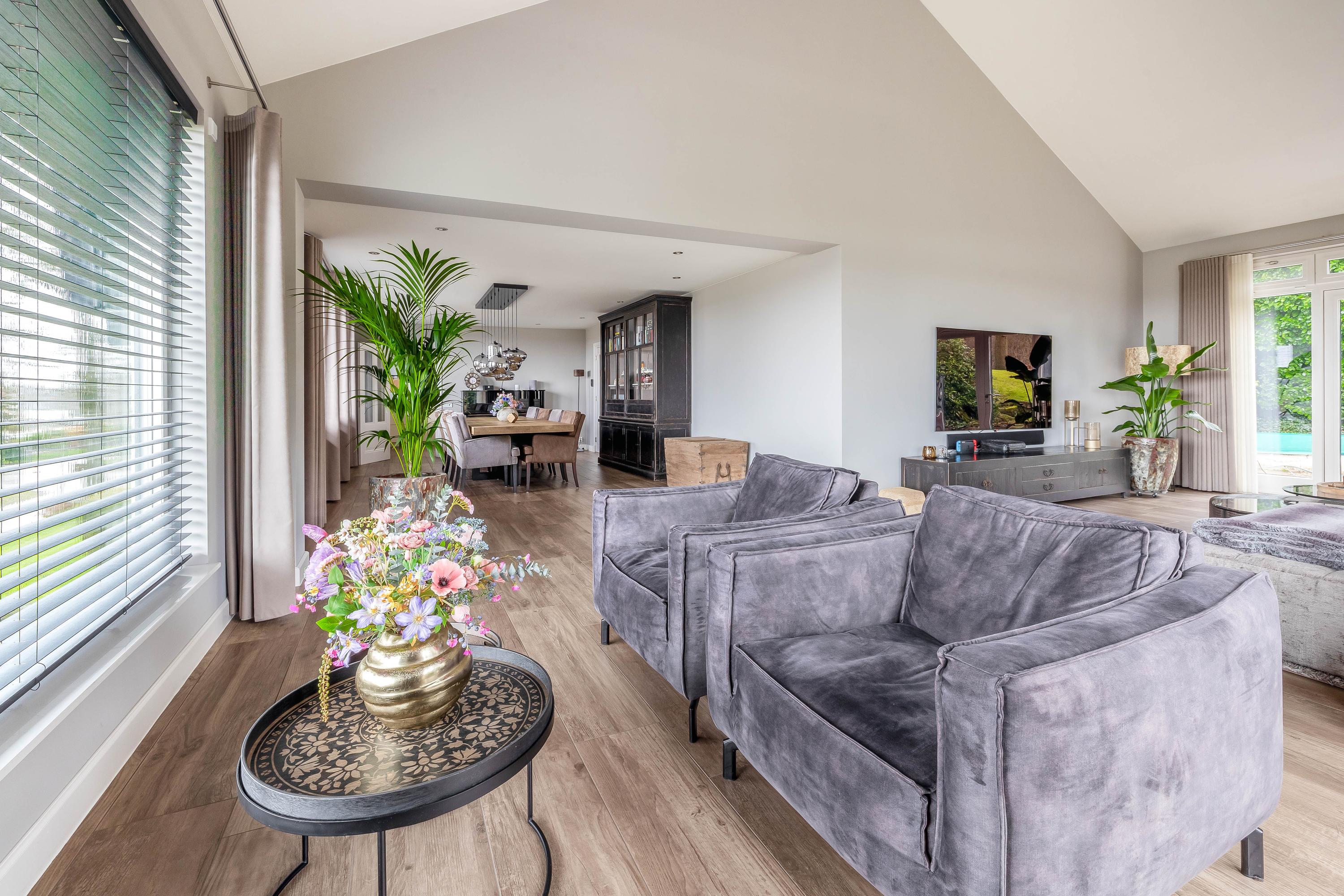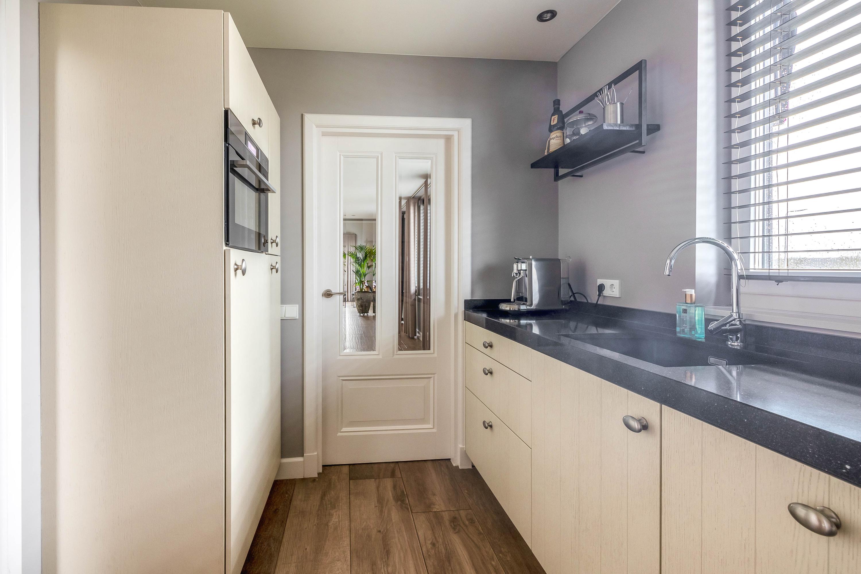 From the stunning, high L-shaped living room (approx. 72 m²), there is a fantastic view of the River Maas. The high ceiling, numerous windows, and double sets of garden doors ensure beautiful natural light. The solid kitchen (approx. 7 m²) is equipped with an induction hob, extractor hood, dishwasher, refrigerator, and a combination steam oven. From here as well, there is a lovely view of the Maas. The kitchen is finished with a composite worktop.