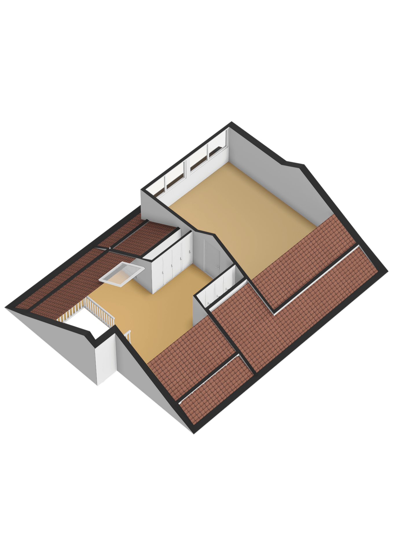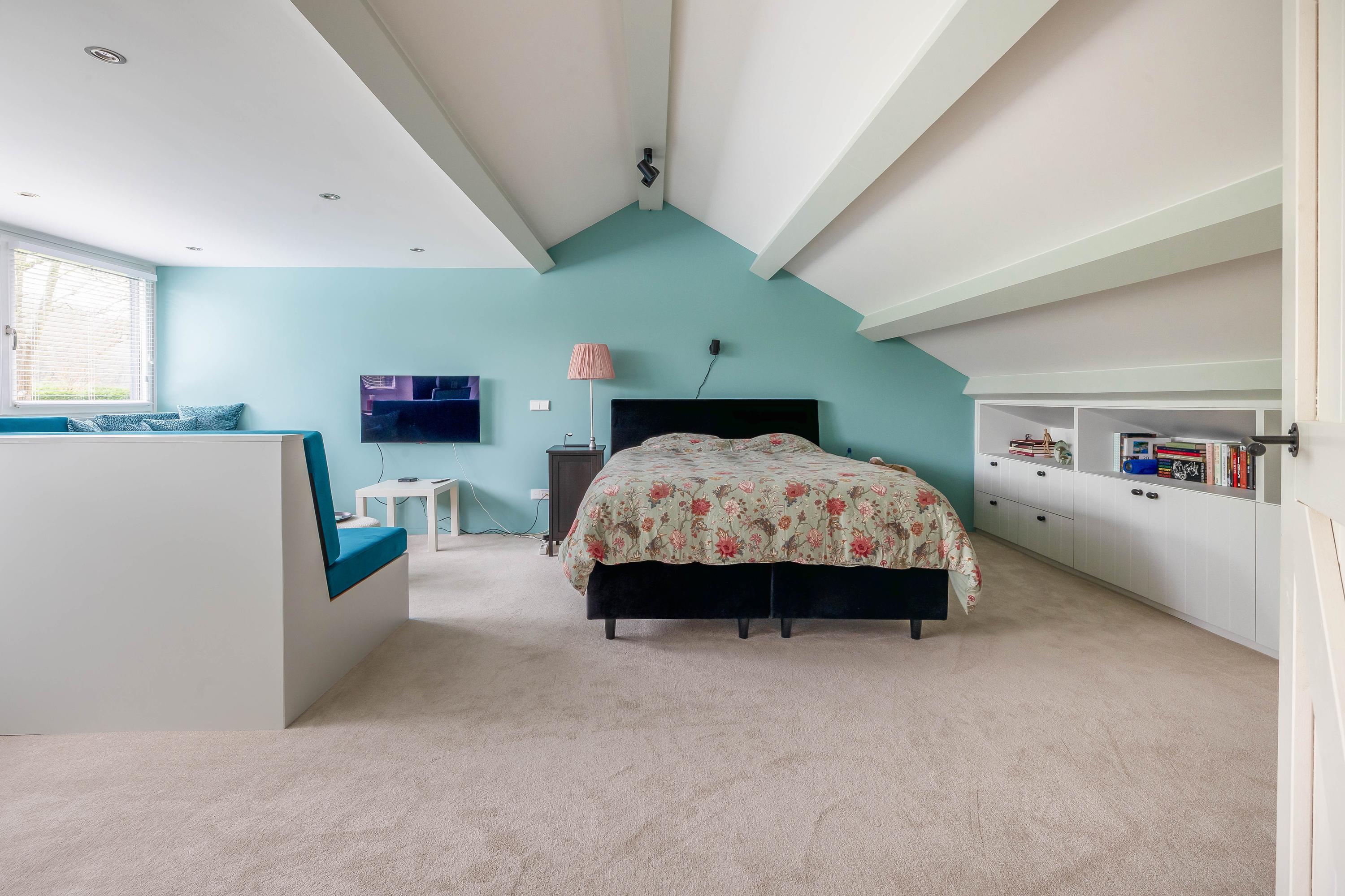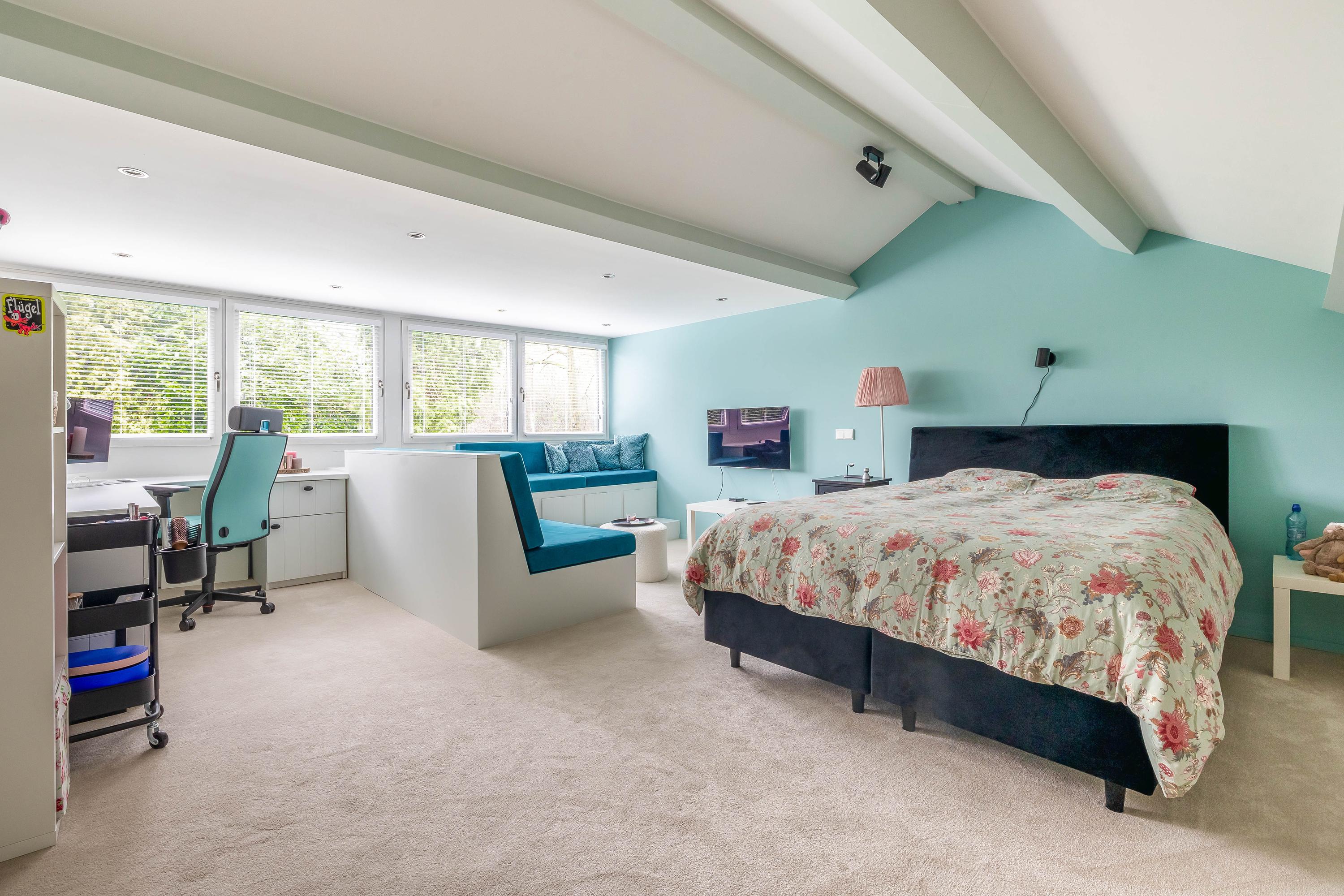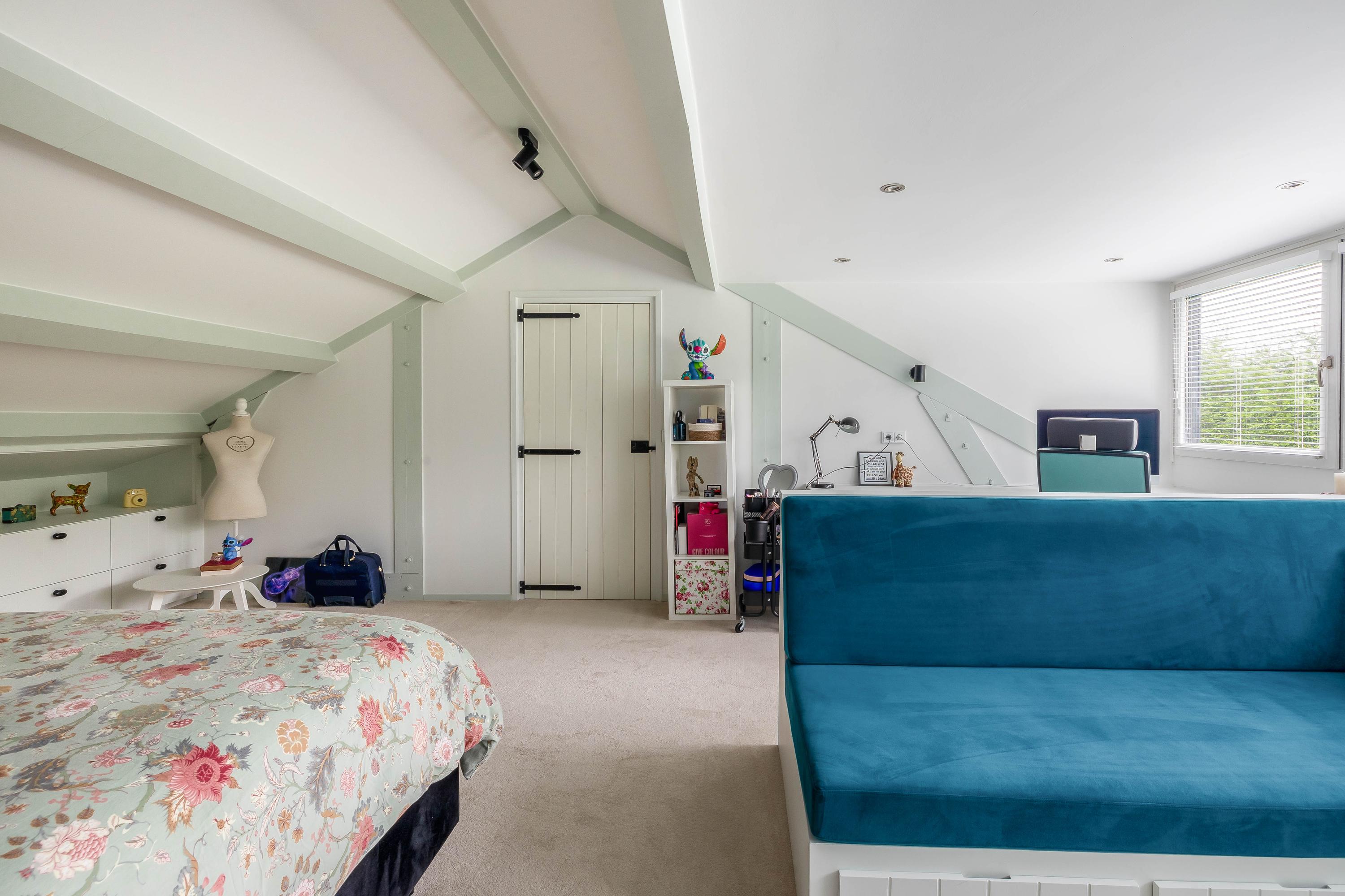 The very spacious bedroom (approx. 28 m²) is fitted with a large dormer with integrated electric shutters, blinds, and insect screens. The room includes many fixed elements such as benches and a desk. Both the landing and the bedroom are carpeted.