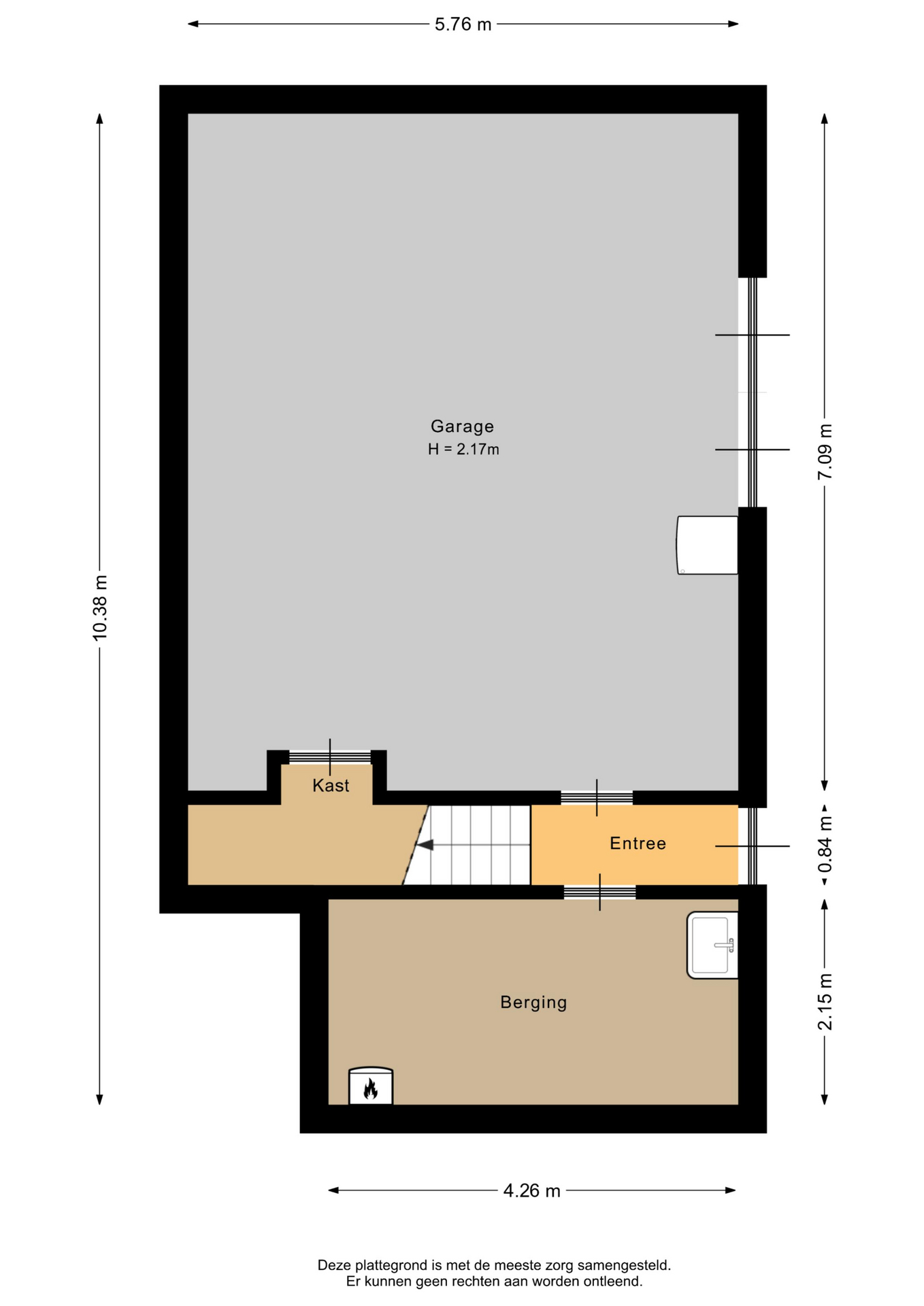 The spacious basement includes a large garage (approx. 40 m²), a storage room (approx. 9 m²) with a renewed meter cupboard, and a technical room with the central heating boiler. A pedestrian door and double doors provide access to the outside.
