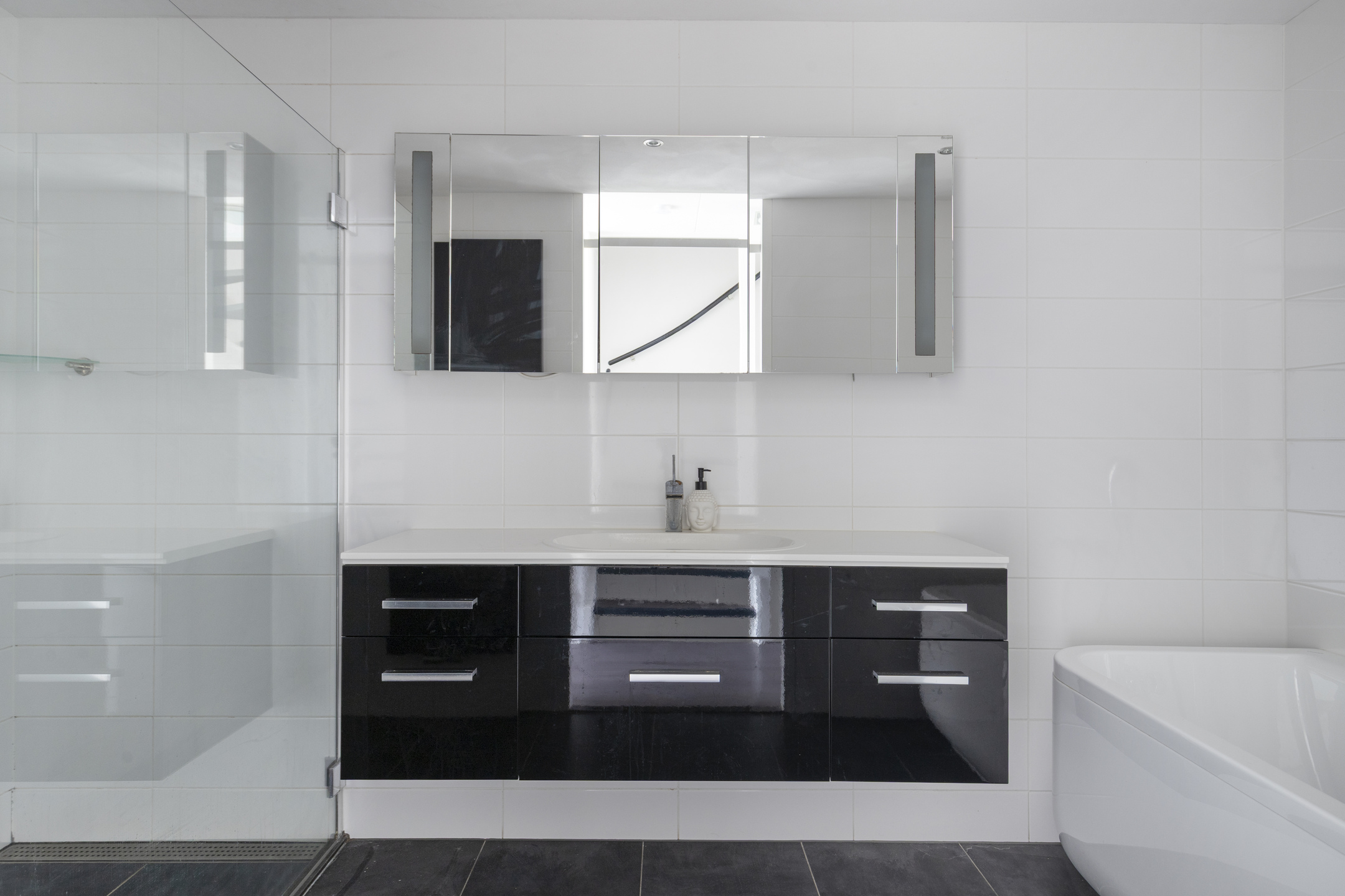 Modern bathroom with bathtub, shower, washbasin unit, underfloor heating and designer radiator