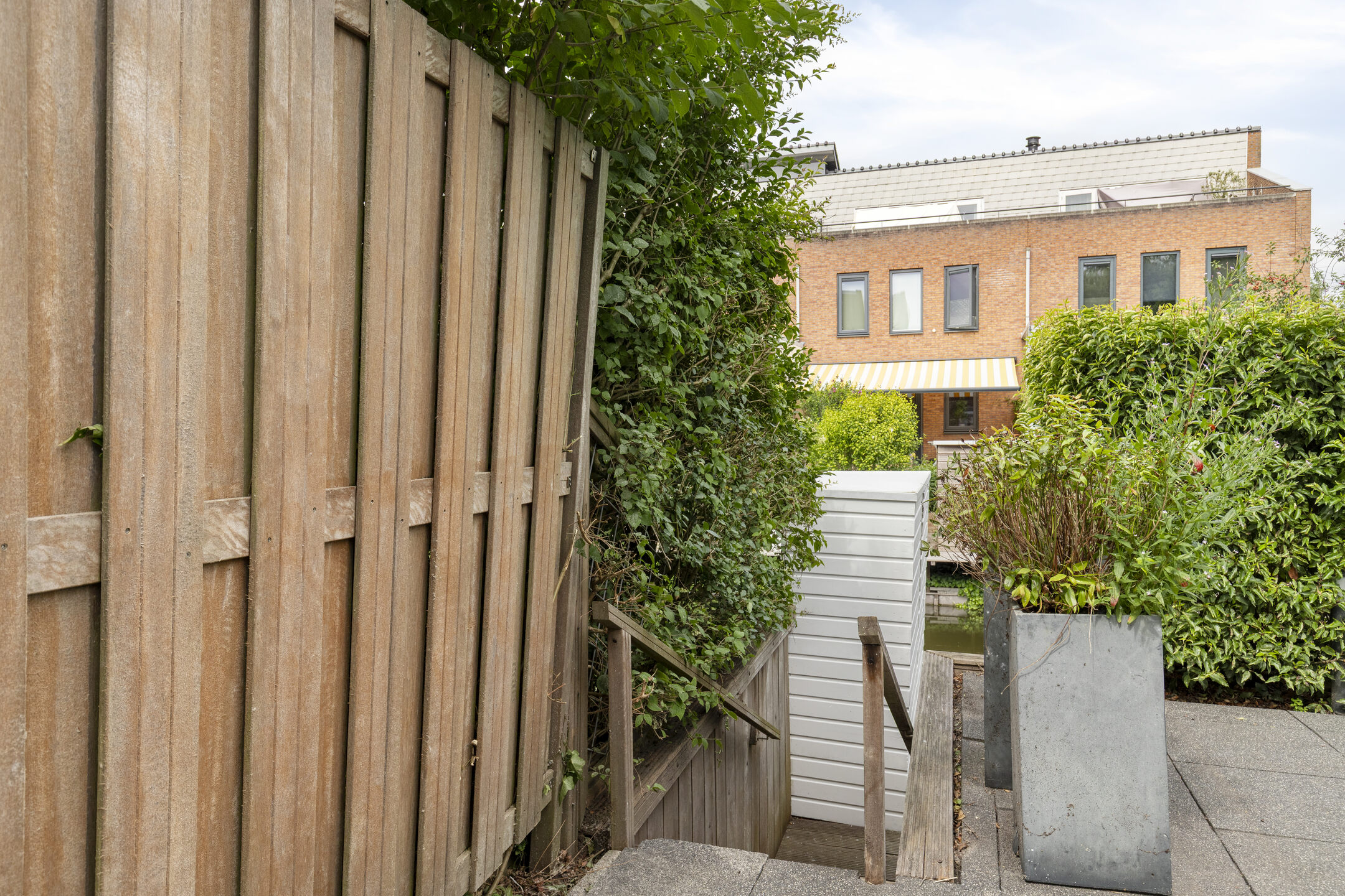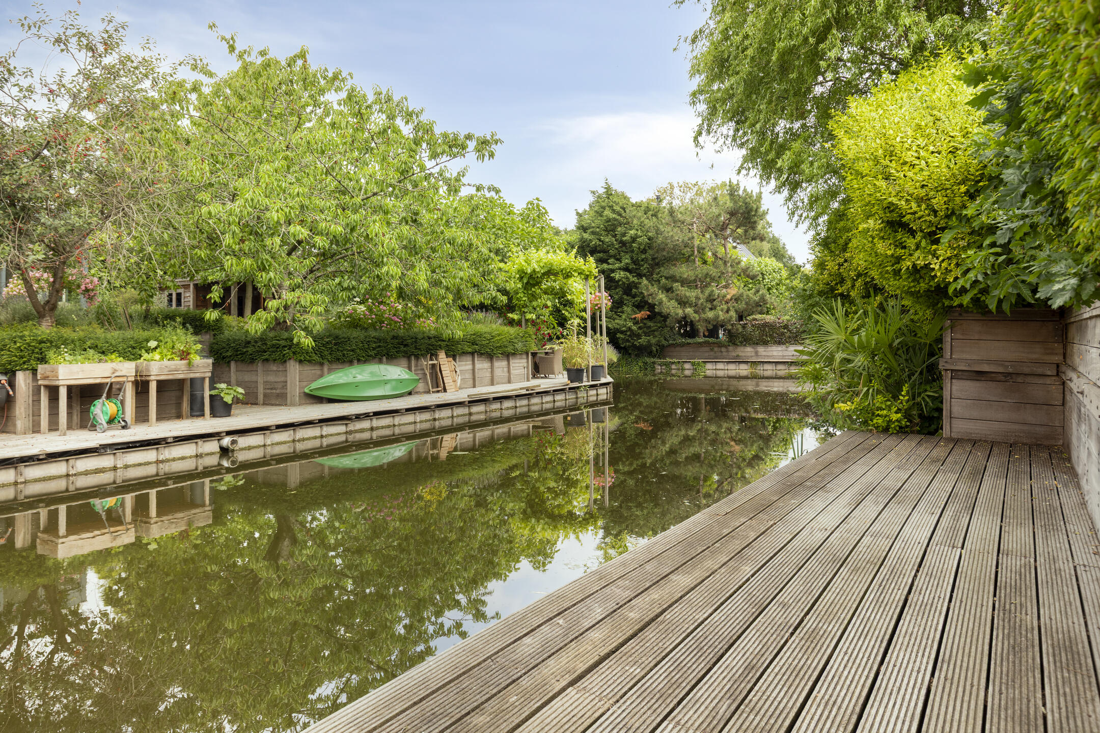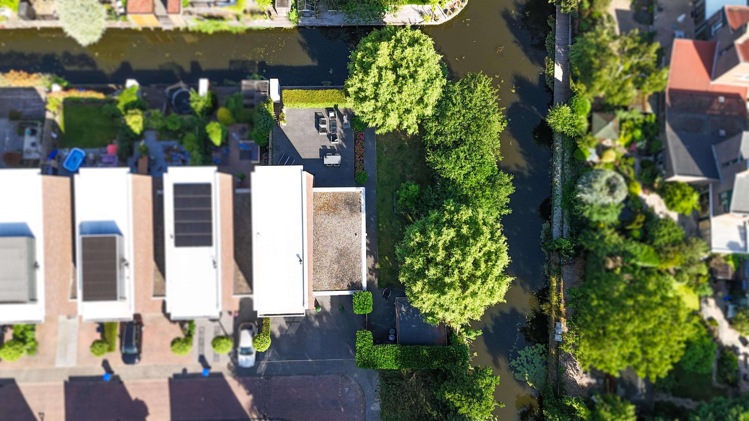 The sunny west-facing backyard is beautifully landscaped and includes multiple terraces, a stylish covered seating area and a wooden deck by the canal — an ideal place to relax well into the evening. At the front of the property, there is private parking for three cars on the driveway, as well as direct access to the garage.