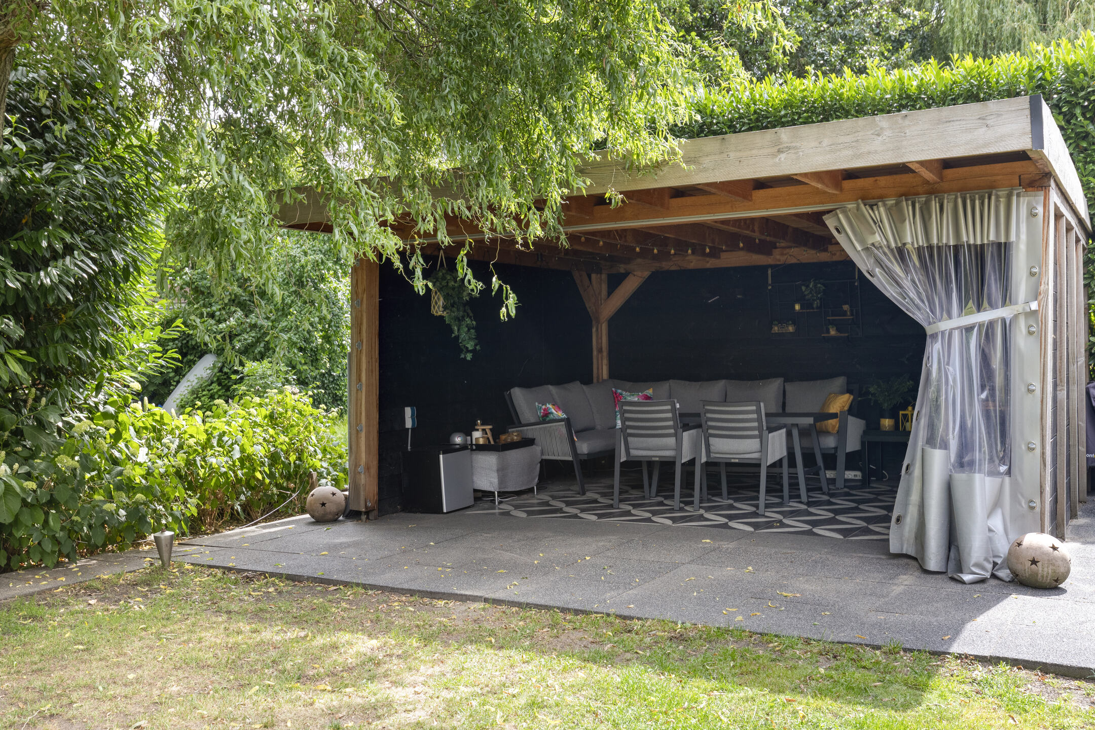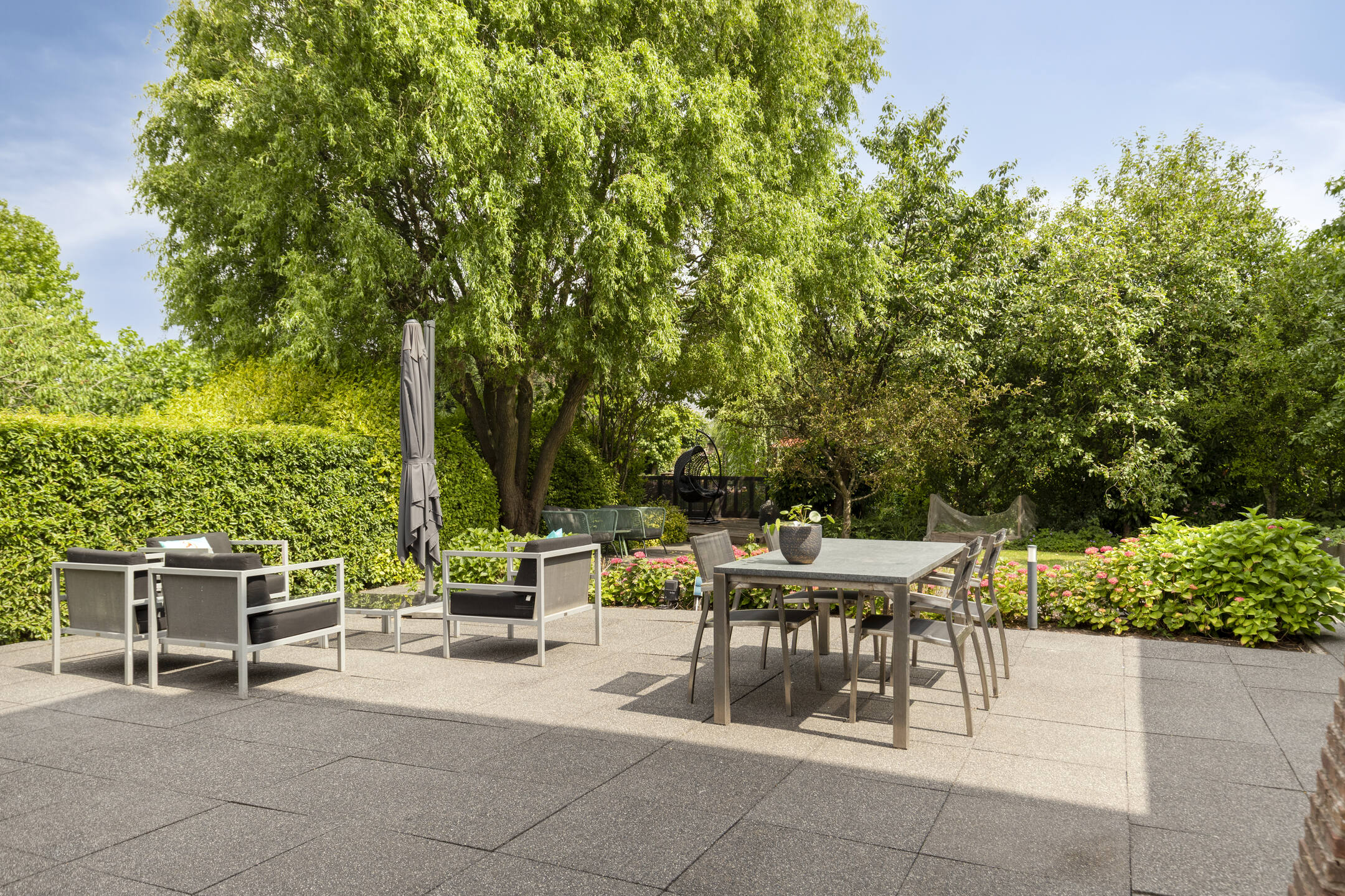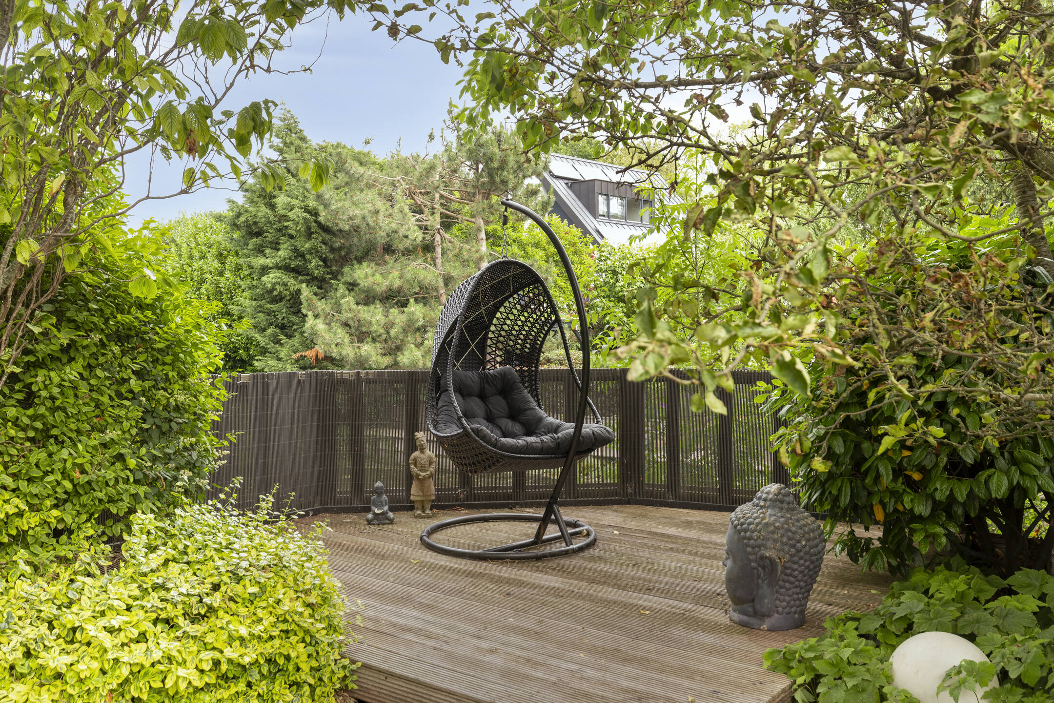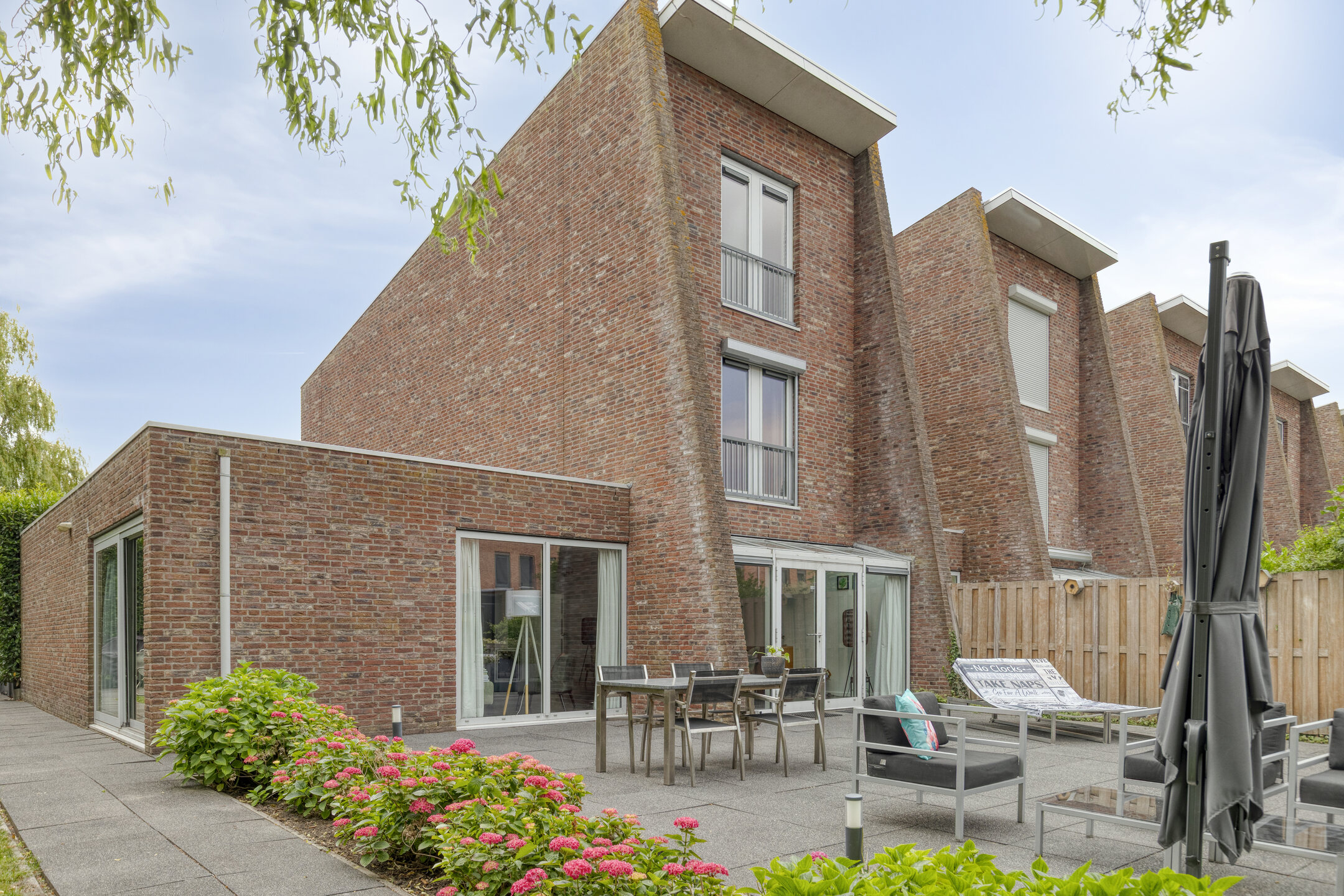 The sunny west-facing backyard is beautifully landscaped and includes multiple terraces, a stylish covered seating area and a wooden deck by the canal — an ideal place to relax well into the evening. At the front of the property, there is private parking for three cars on the driveway, as well as direct access to the garage.