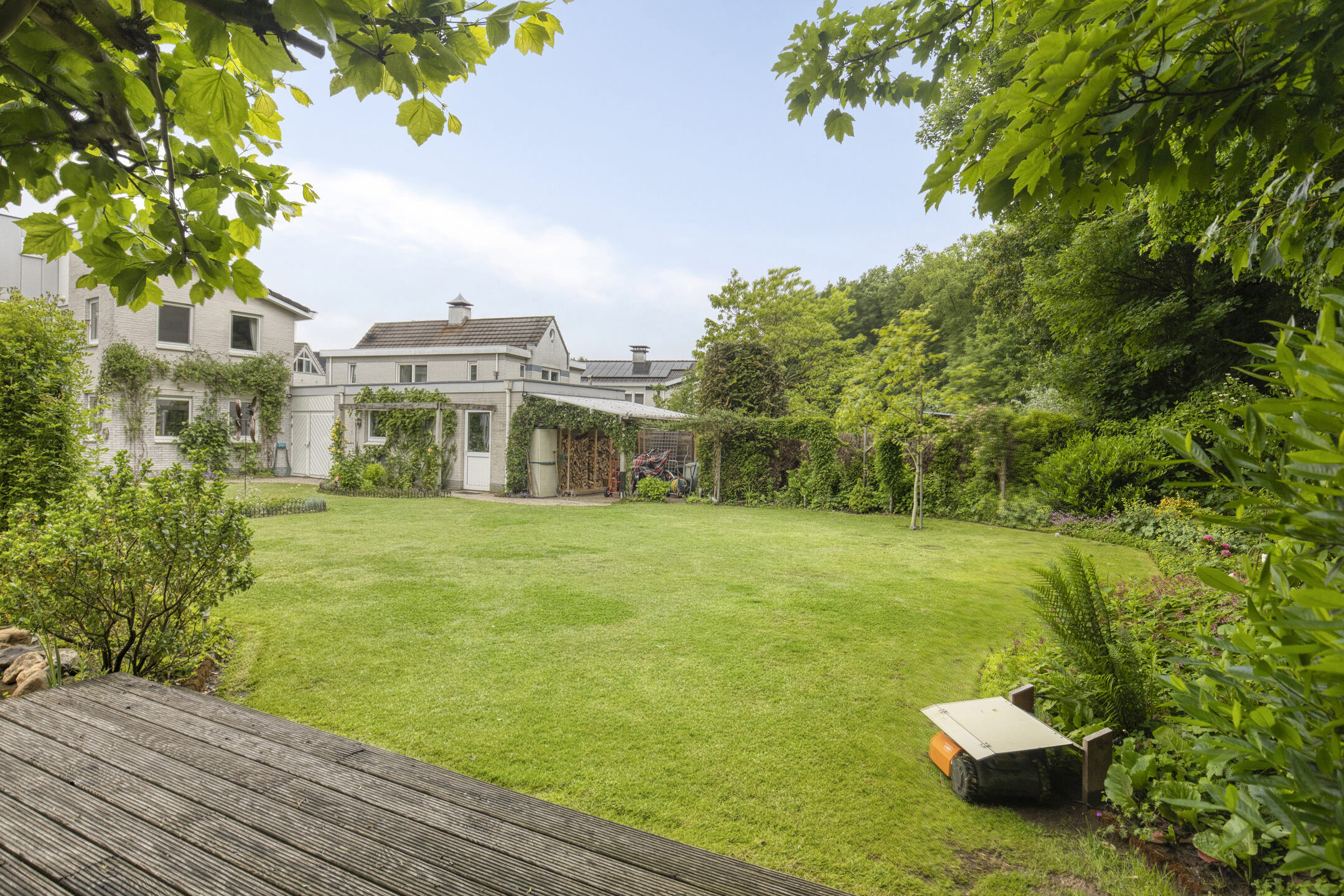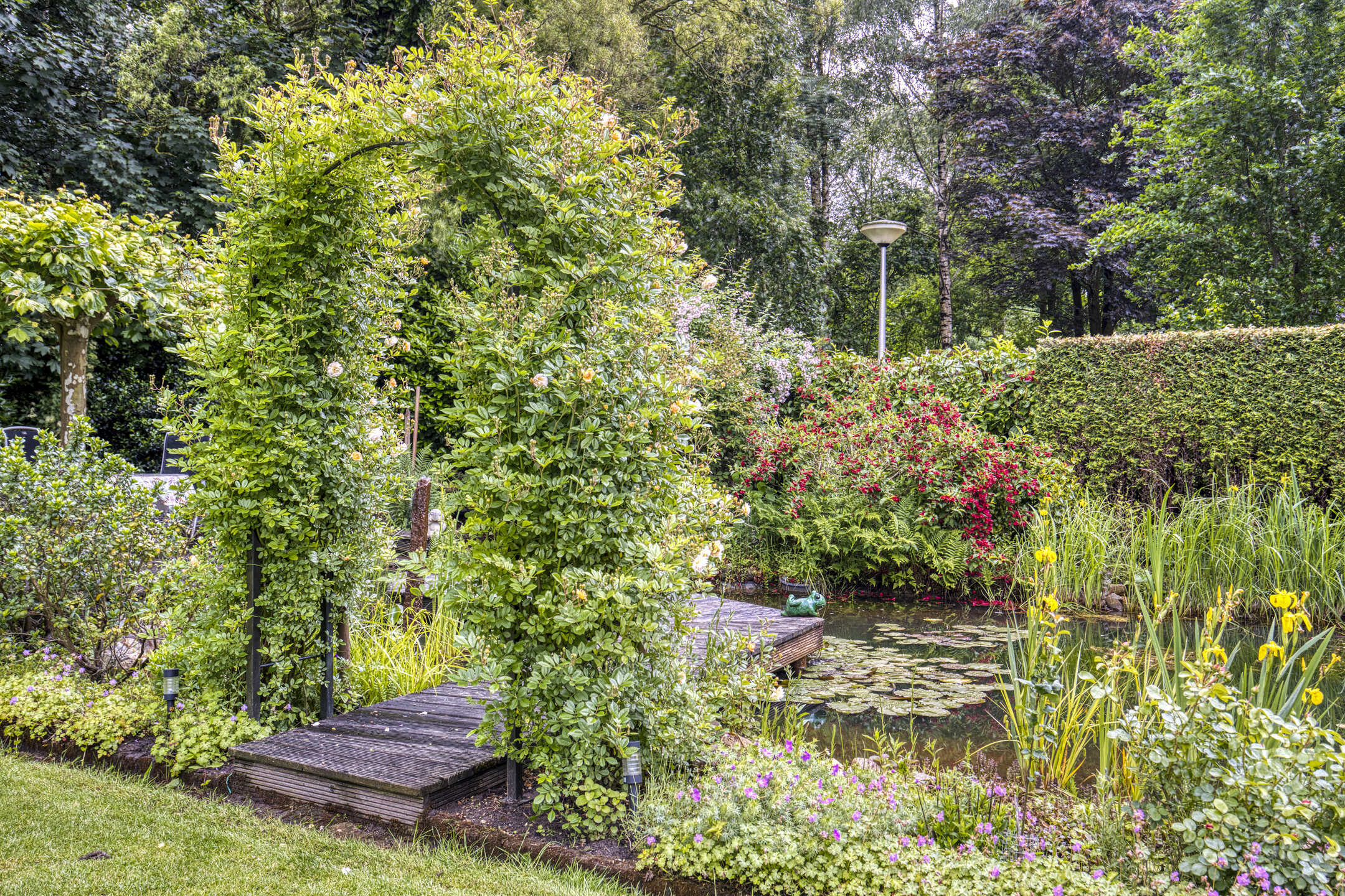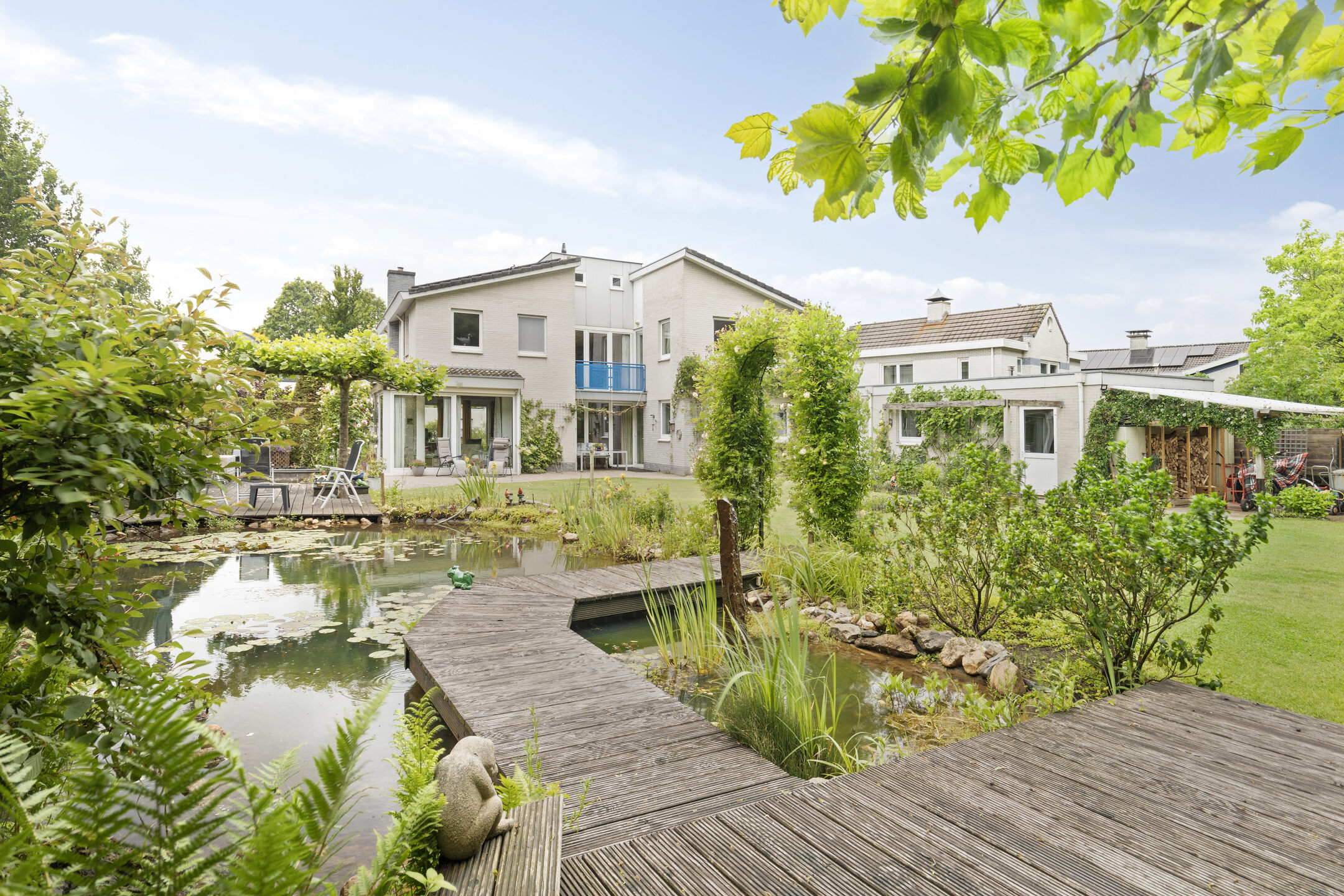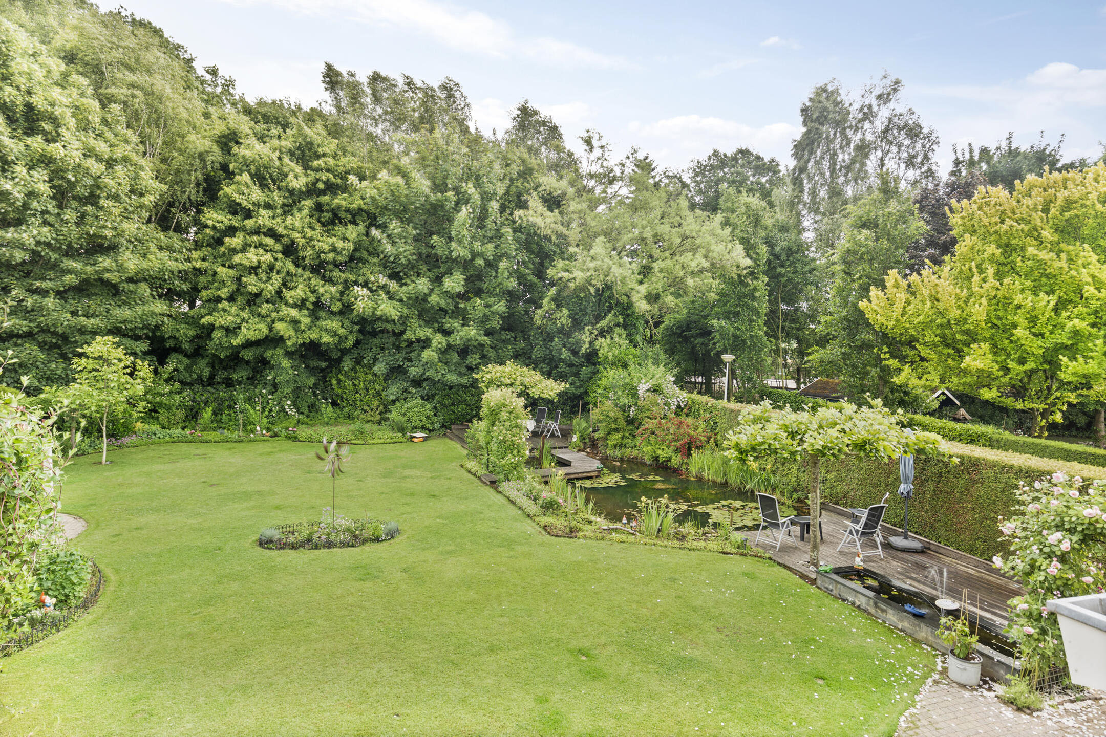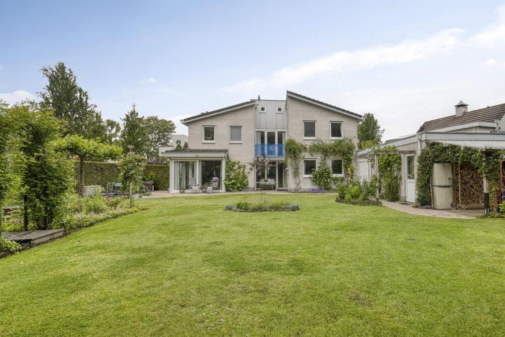 The mature garden is very fittingly decorated to the house; contemporary and colorful. A terrace has been laid out behind the house. The garden is beautifully designed, with large lawn, a beautiful pond and brightly filled borders. Over the pond runs a jetty with a picturesque rose gate. Cozy seating areas are scattered throughout the garden and allow you to sit in the sun at all times.