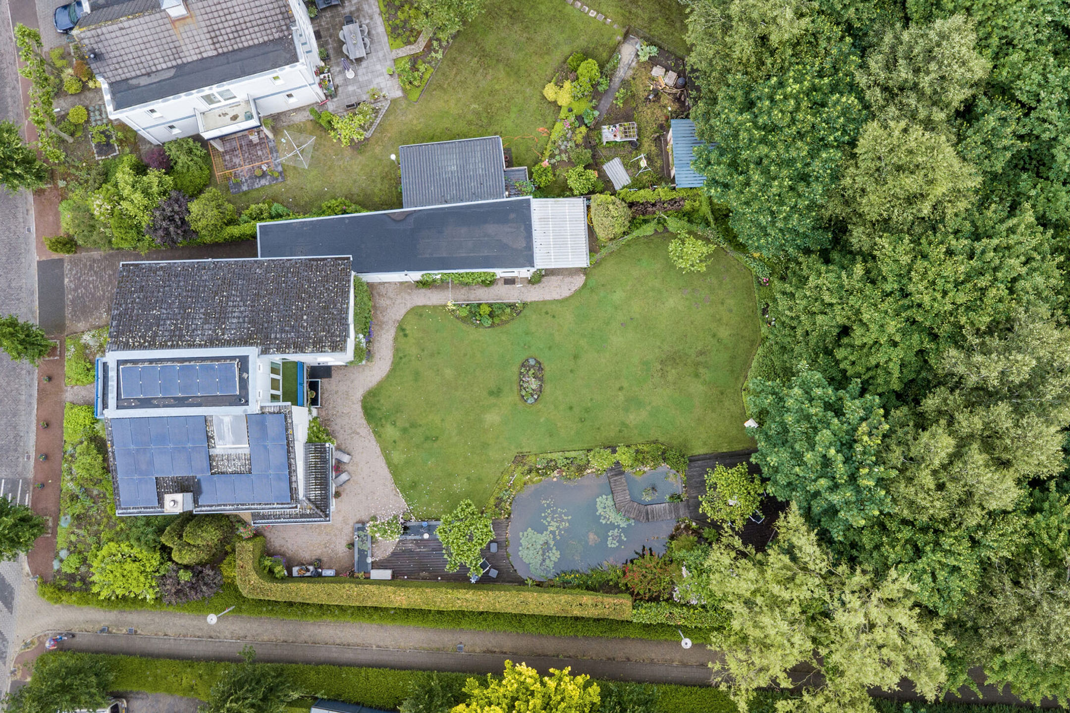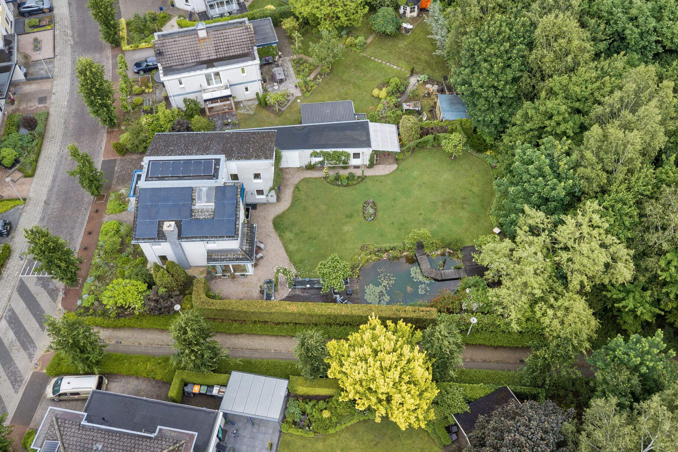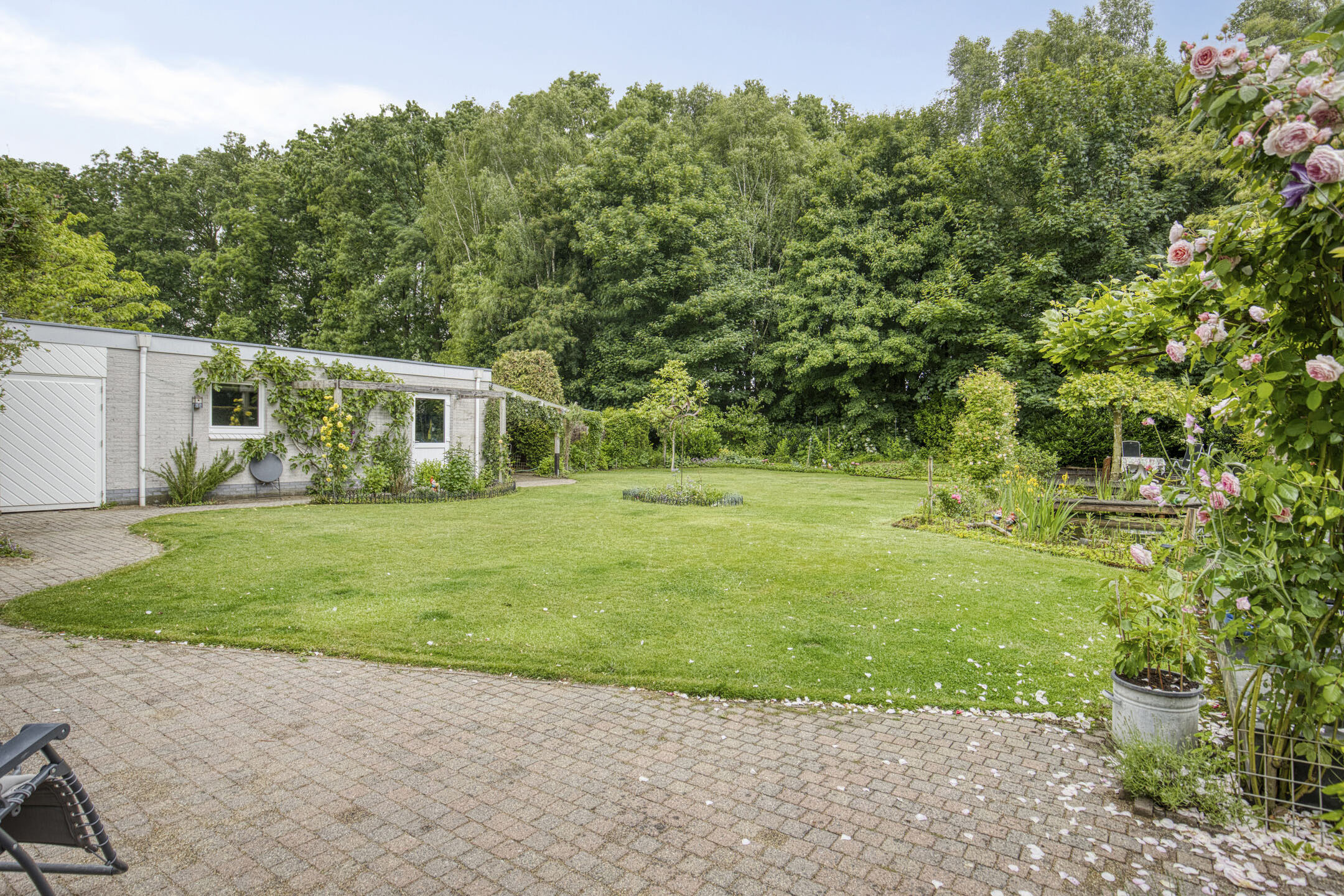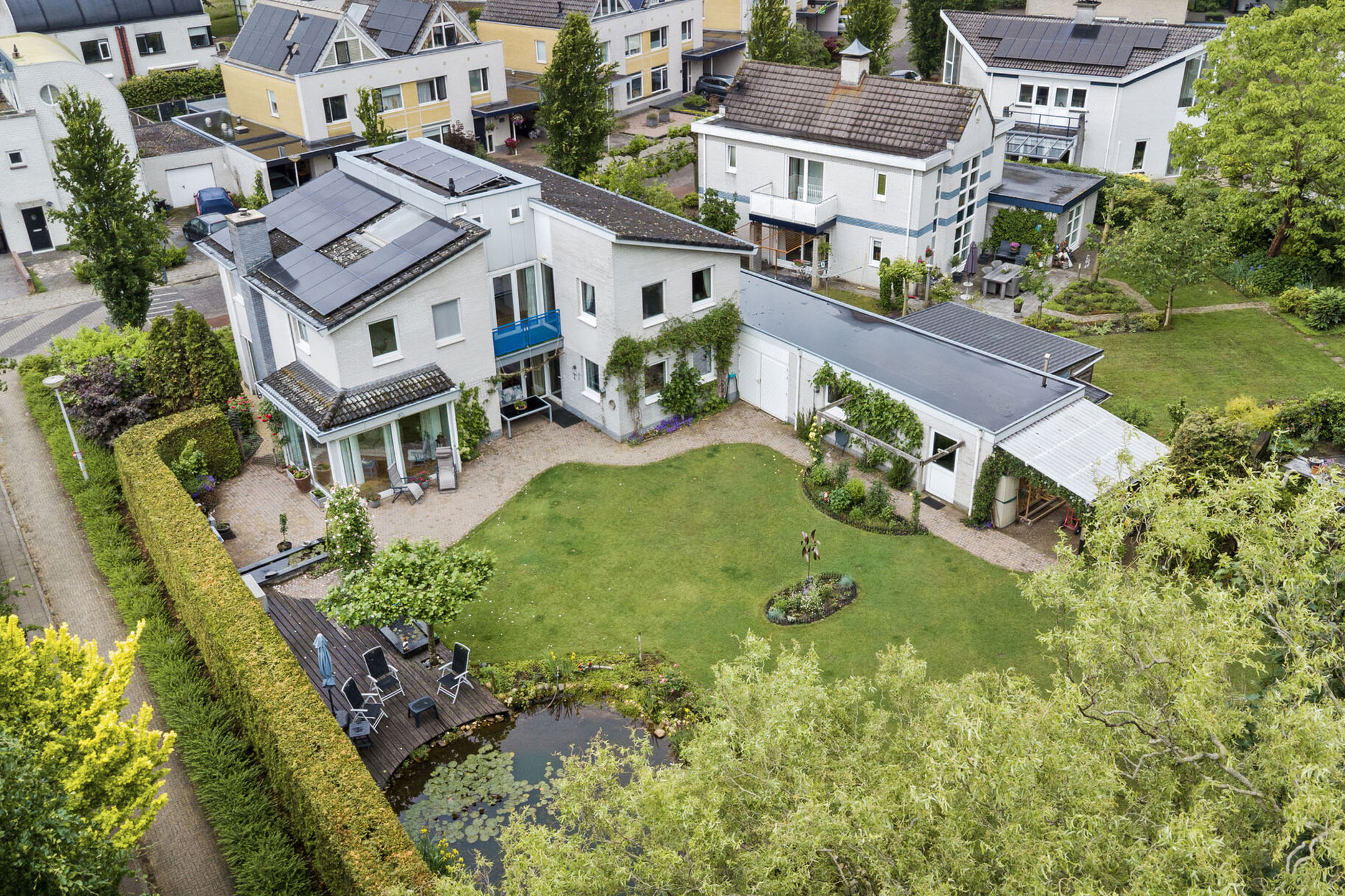 The mature garden is very fittingly decorated to the house; contemporary and colorful. A terrace has been laid out behind the house. The garden is beautifully designed, with large lawn, a beautiful pond and brightly filled borders. Over the pond runs a jetty with a picturesque rose gate. Cozy seating areas are scattered throughout the garden and allow you to sit in the sun at all times.