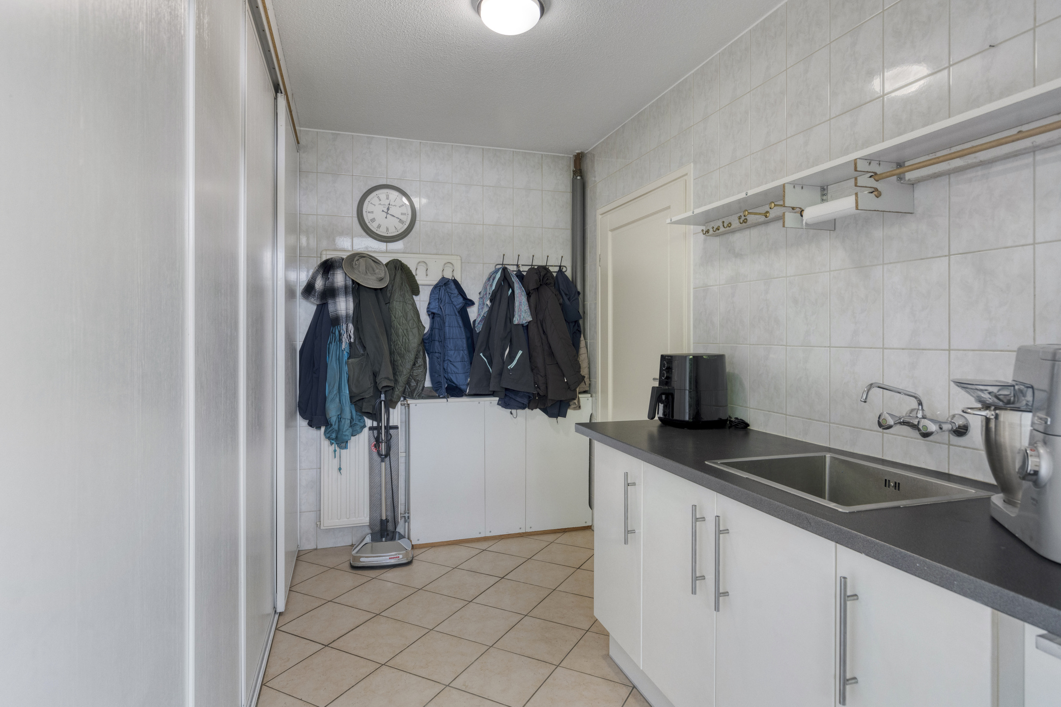 Following this is the utility room, with pantry, built-in cupboards and the connections for the washing machine, dryer and freezer.