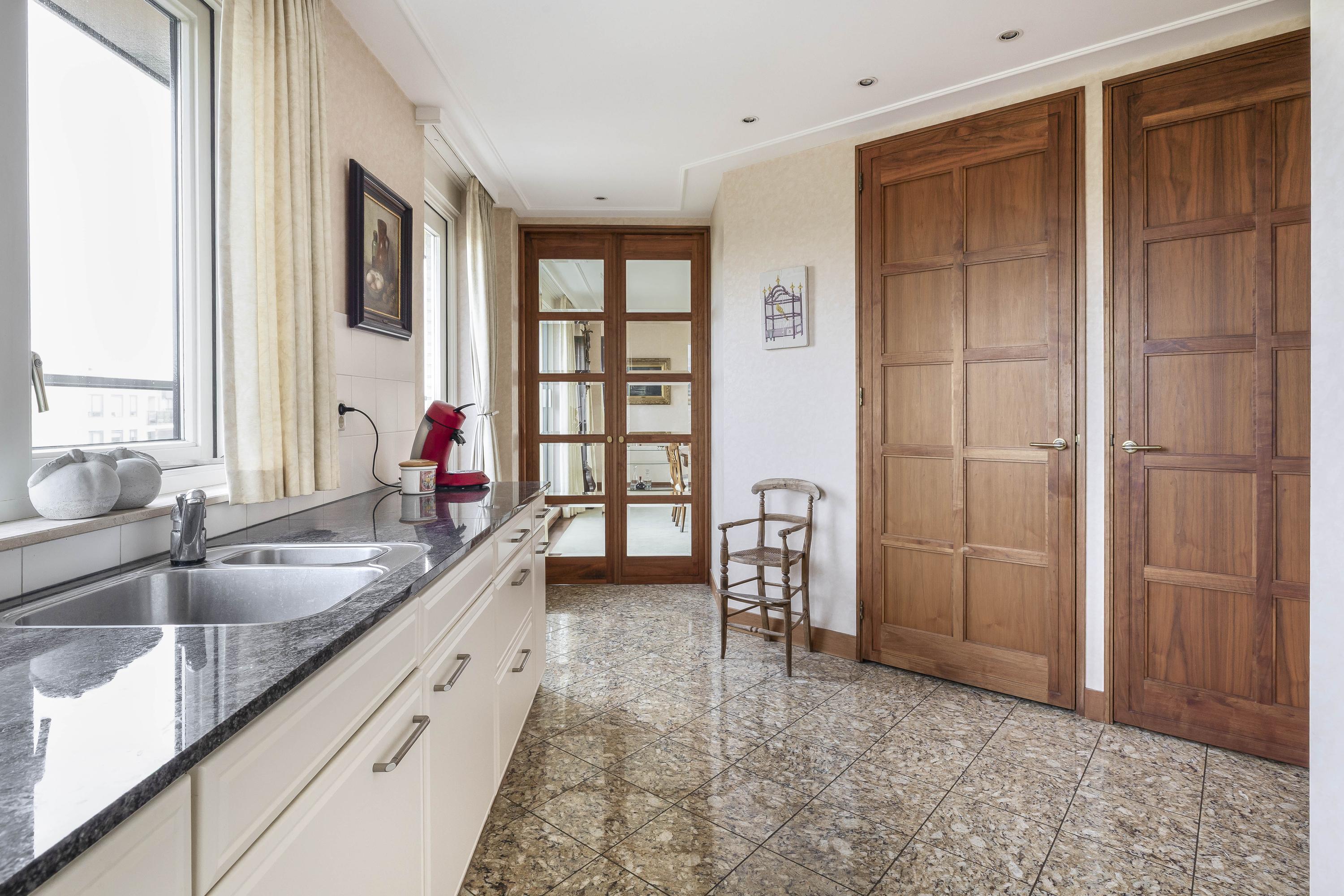 As you enter the penthouse, you are greeted by a spacious hallway that leads to a built-in storage closet, a chic guest toilet, the generous living room, and the kitchen. The kitchen, designed in an elegant U-shaped layout, is equipped with high-end built-in appliances and a practical internal pantry.