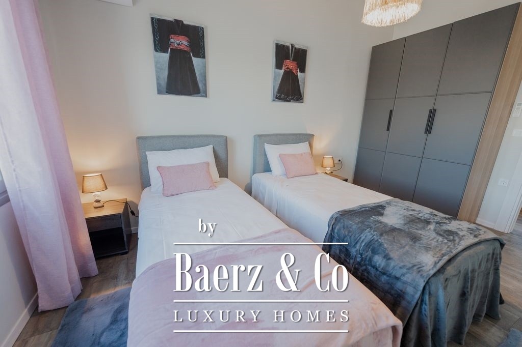 Thoughtfully renovated throughout, the apartment blends contemporary design with premium materials. The living and dining areas widen toward the waterfront balcony, inviting natural light and framing scenes of the Aegean and sunset each day. A separate, fully equipped kitchen serves both privacy and function, while each of the three bedrooms is fitted with generous wardrobes and a secure safe. Two bathrooms are designed for comfort and clarity, their modern finishes quietly reinforcing the sense of quality.