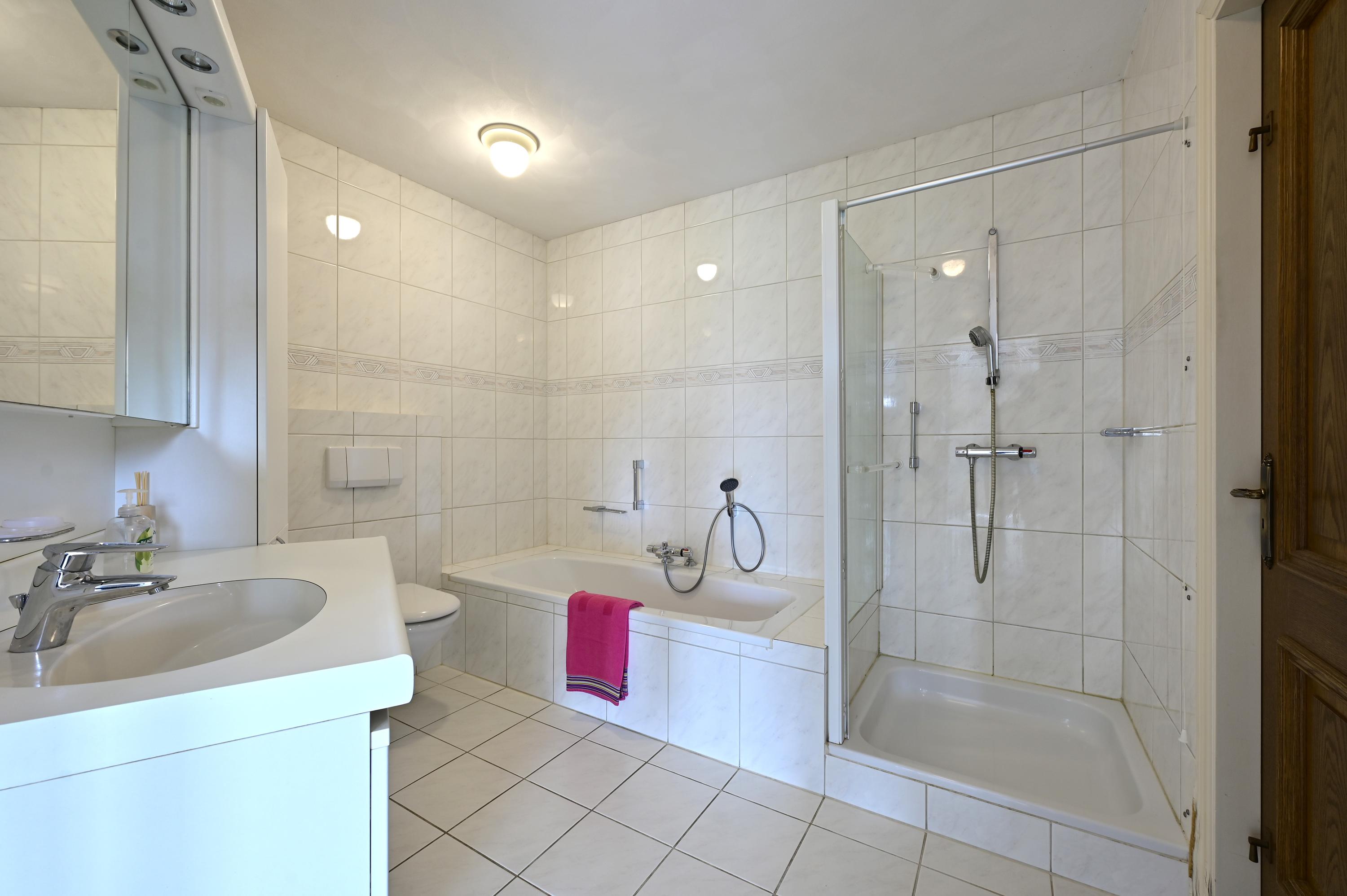 Centrally located on the landing are a spacious storage cupboard and the large bathroom, finished with white and blue tiles. This bathroom is fully equipped with bathtub, WC, vanity unit with mirror, and a generous walk-in shower. Thanks to the dormer with twin windows, daylight pours in, offering sweeping views across the rear garden. Finally, another spacious bedroom lies beside the bathroom, with a large window to the side and two built-in wardrobes plus eaves storage. As throughout the home, all window frames are crafted from premium hardwood, contributing to the robust, durable character of the property.