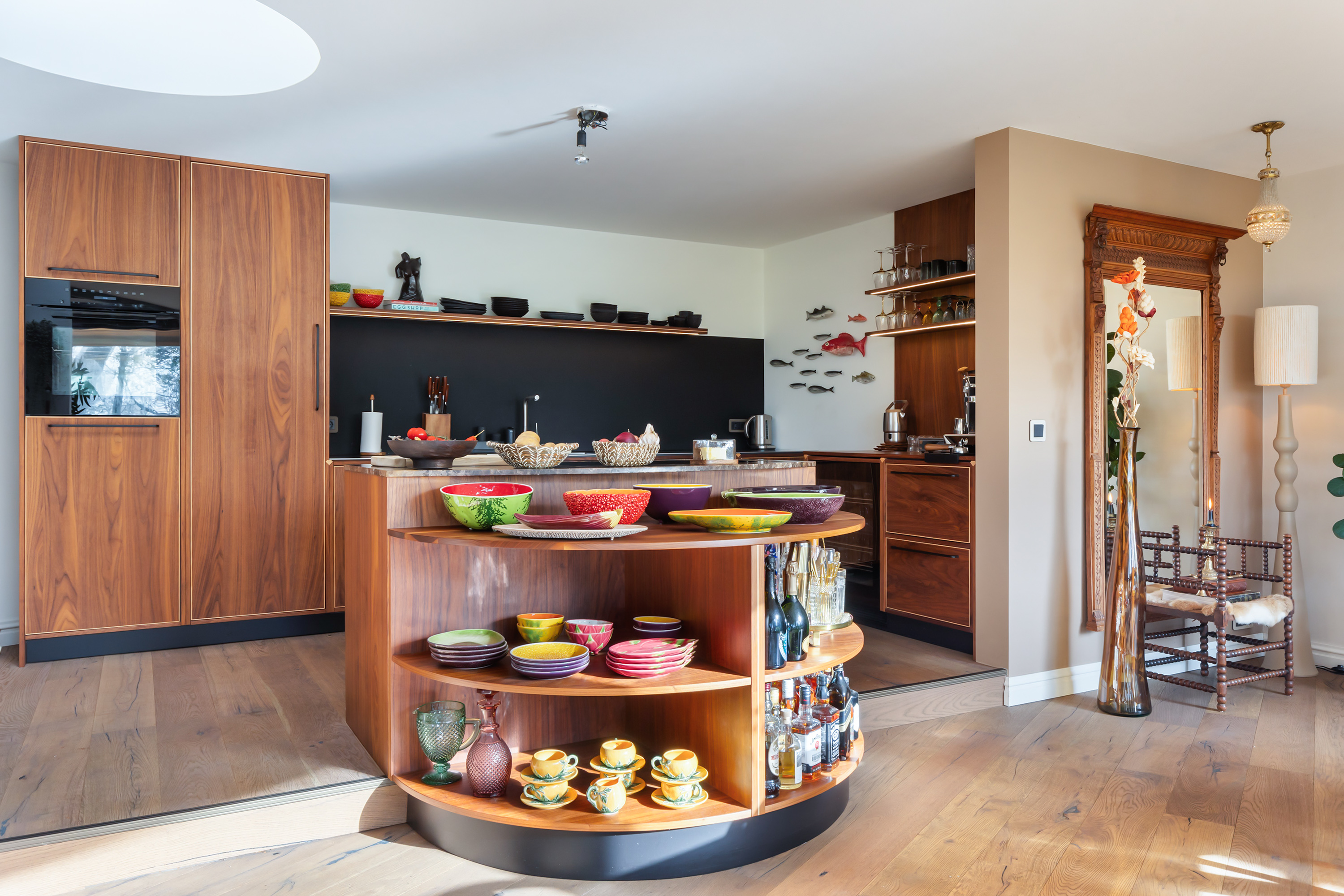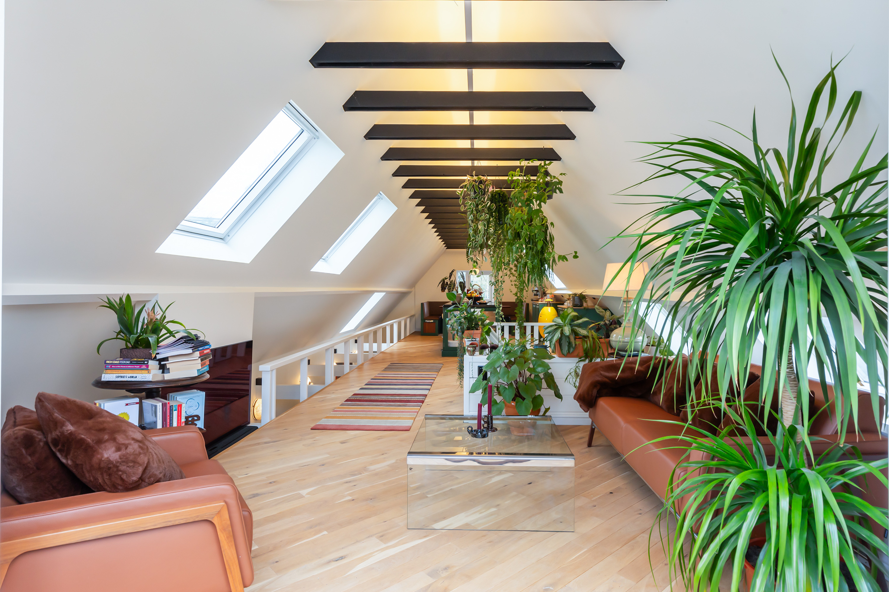 On the mezzanine level is an atmospheric kitchen-diner featuring oak cabinetry in a woodland green tone, granite worksurfaces and Miele appliances. At the front is a bright dining area, while the rear offers a cosy TV room with French doors opening onto the spacious roof terrace. Here, you can enjoy panoramic views across the garden and fields – an ideal spot to unwind or dine in the evening sun.