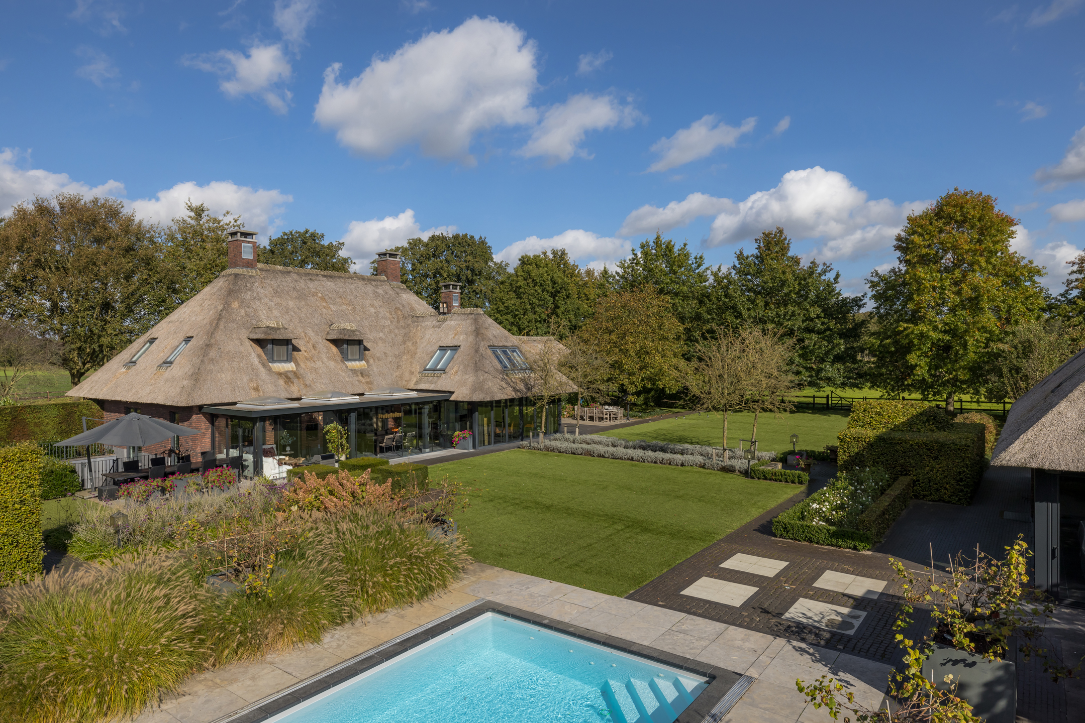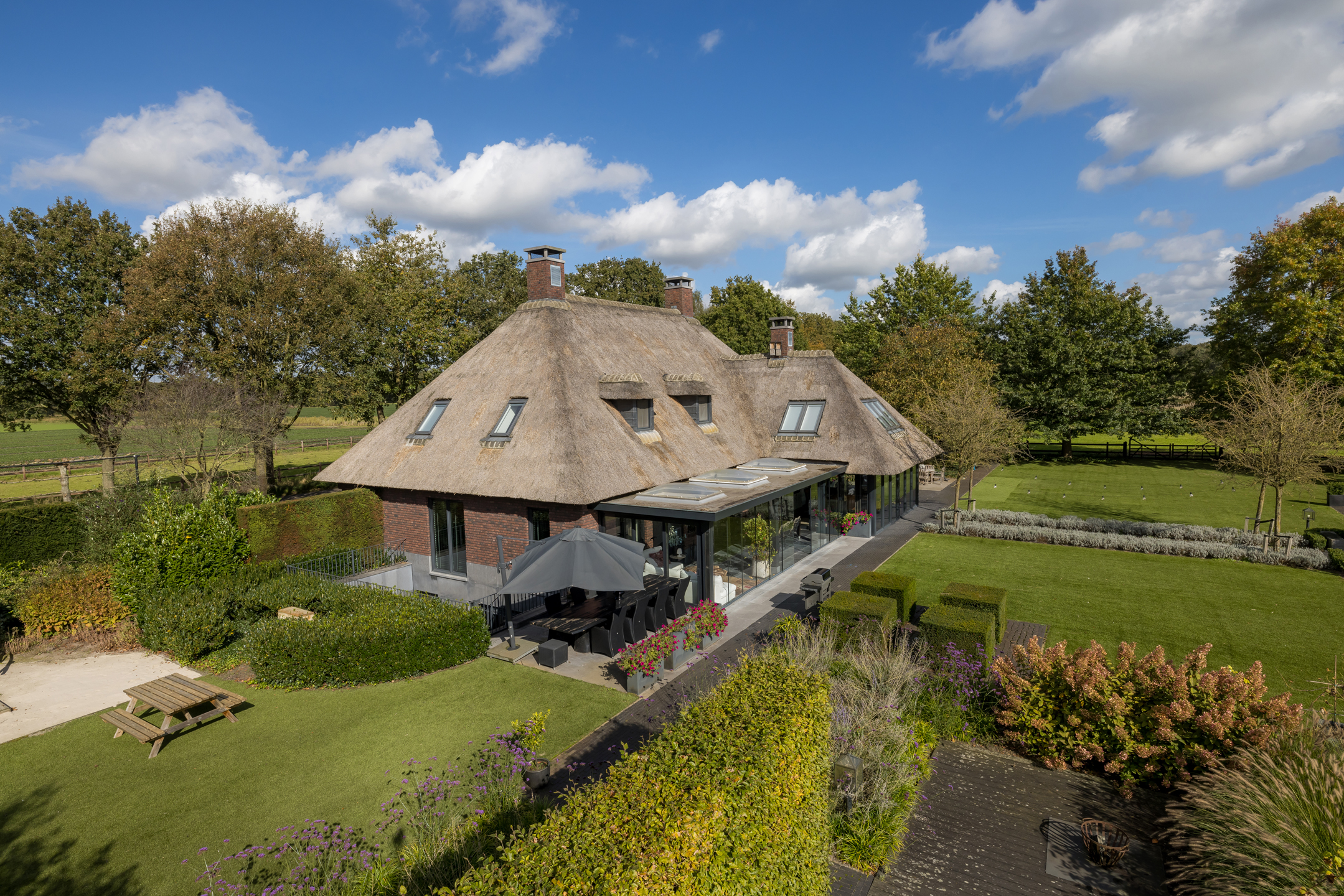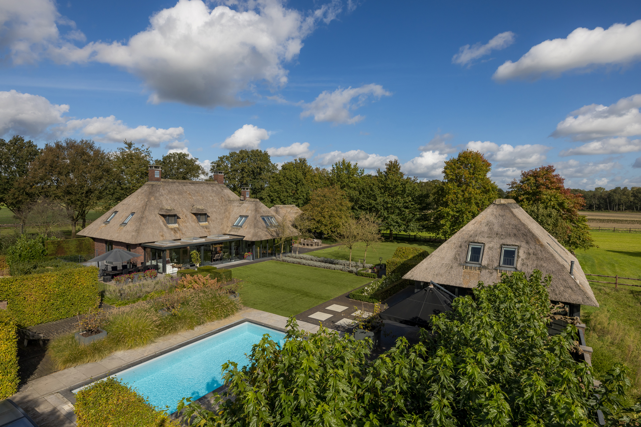 In het buitengebied van Erp gelegen, een werkelijk uniek rietgedekt landhuis met guesthouse en vrijstaande garage, op een riant perceel van bijna 1.5 hectare. Een droomhuis waar het echt aan niets ontbreekt: landelijk, klassiek, chique en technisch modern. Het energielabel A+++ geeft aan dat dit schitterende object ook helemaal op de toekomst is voorbereid. Een woning waar aan ruimte geen gebrek is, volledig onderkelderd, royale begane grond, een riante eerste verdieping en een zolder. Dit heerlijke familiehuis voelt ruim en cosy, zonder het gevoel te krijgen dat het veel te groot is.