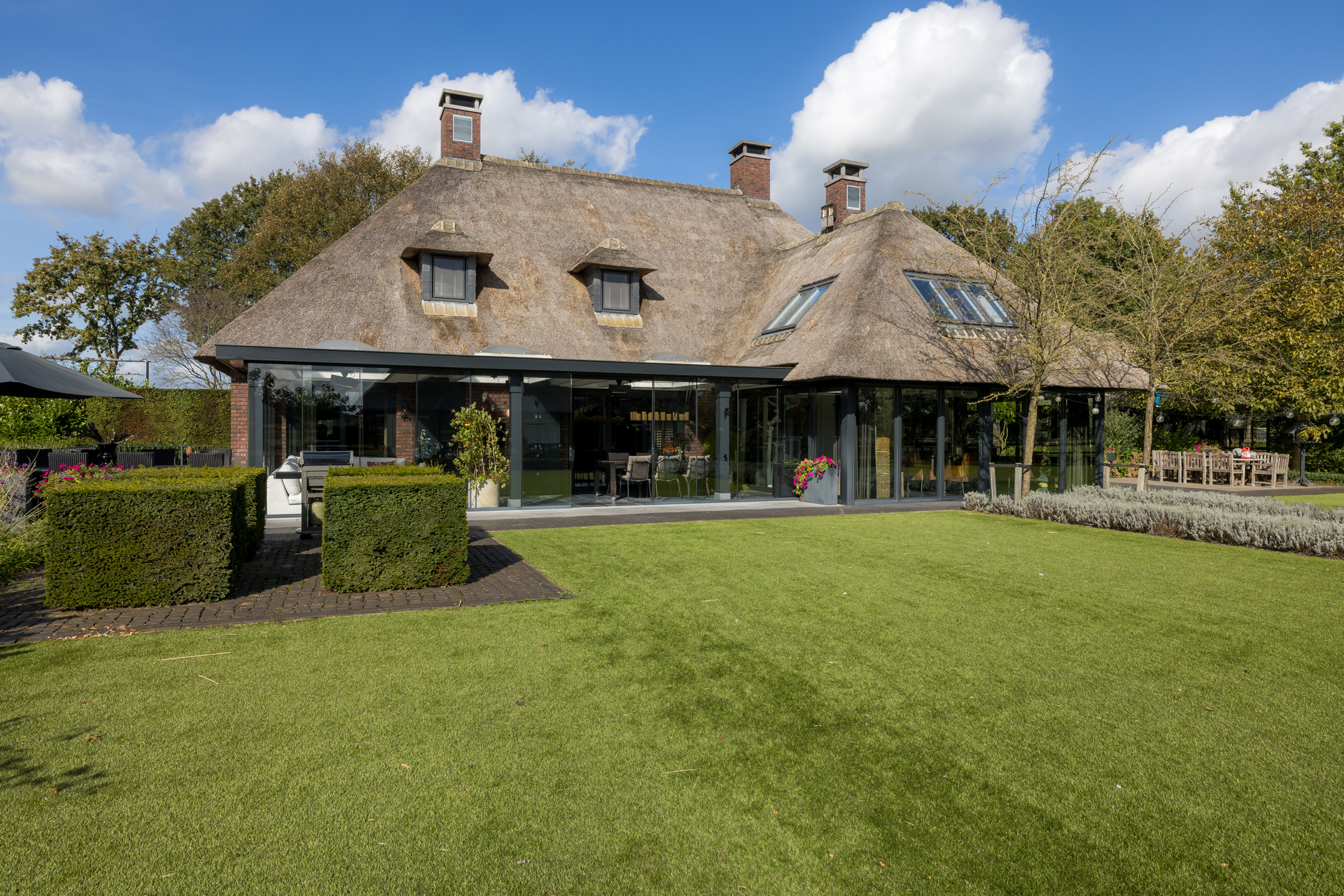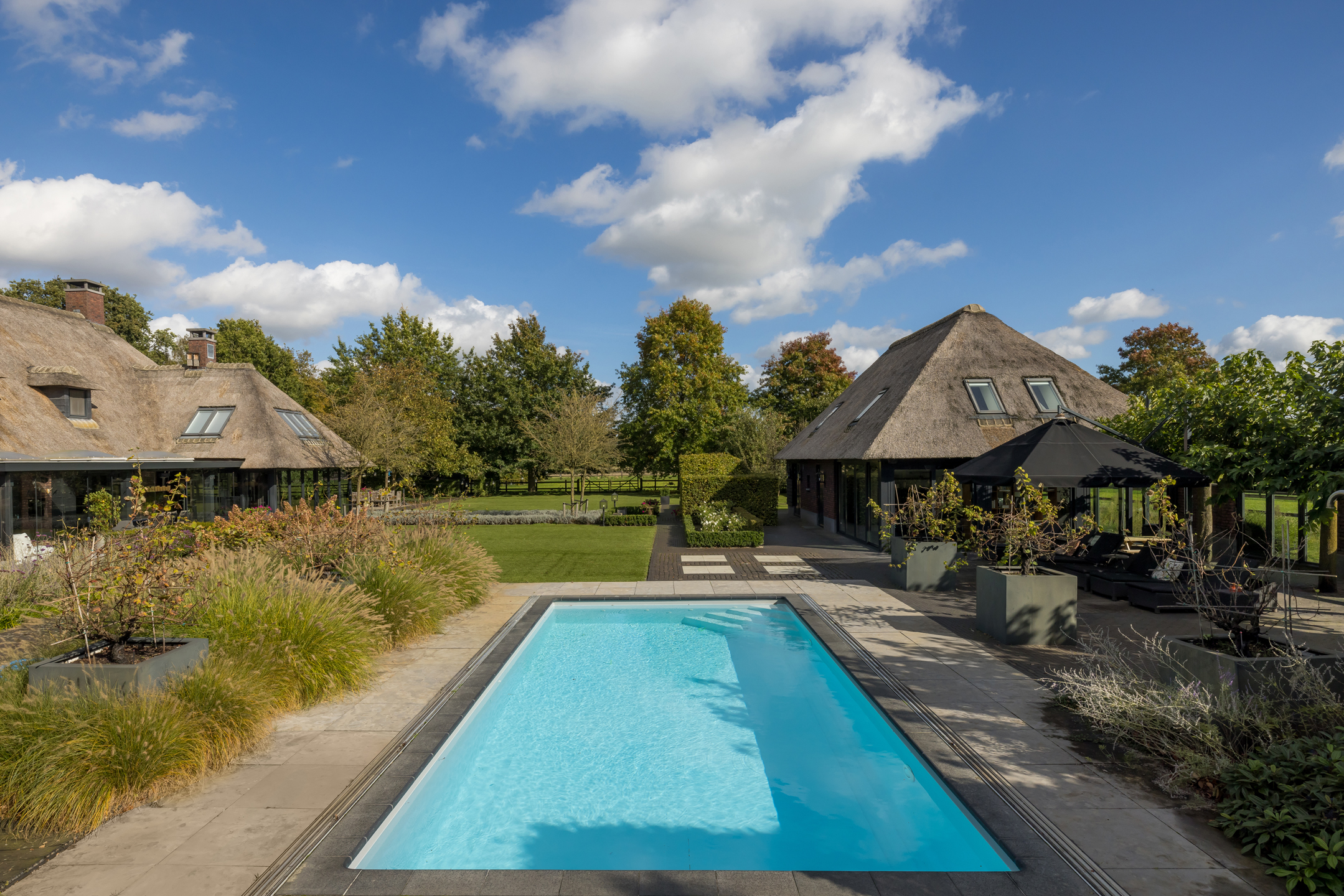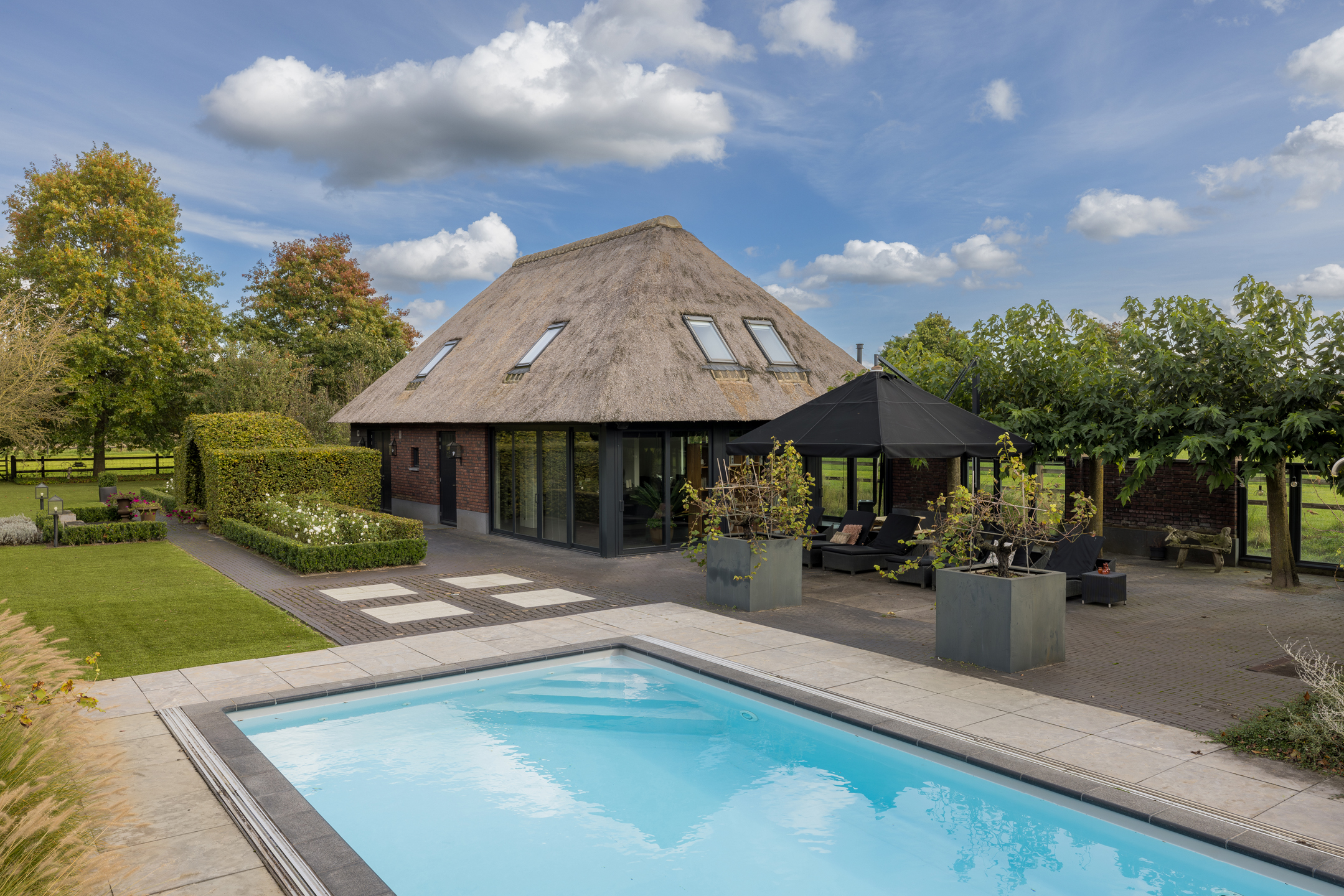 In het buitengebied van Erp gelegen, een werkelijk uniek rietgedekt landhuis met guesthouse en vrijstaande garage, op een riant perceel van bijna 1.5 hectare. Een droomhuis waar het echt aan niets ontbreekt: landelijk, klassiek, chique en technisch modern. Het energielabel A+++ geeft aan dat dit schitterende object ook helemaal op de toekomst is voorbereid. Een woning waar aan ruimte geen gebrek is, volledig onderkelderd, royale begane grond, een riante eerste verdieping en een zolder. Dit heerlijke familiehuis voelt ruim en cosy, zonder het gevoel te krijgen dat het veel te groot is.