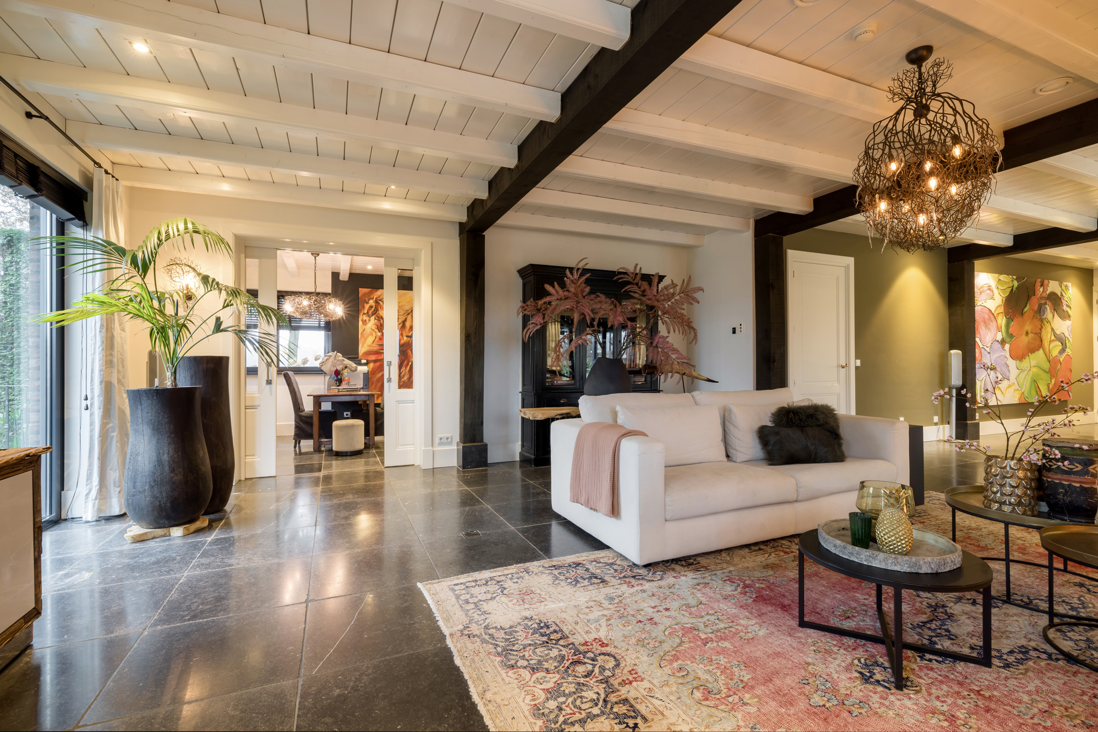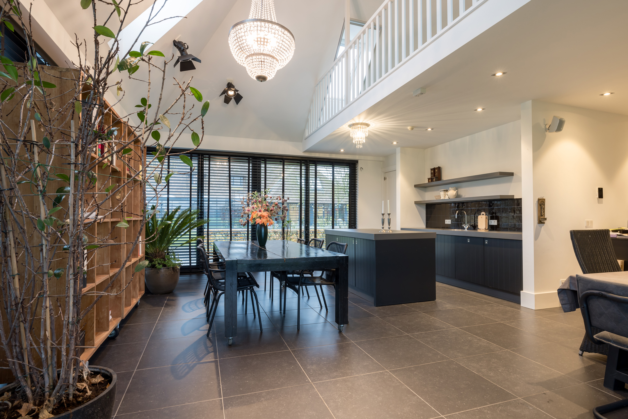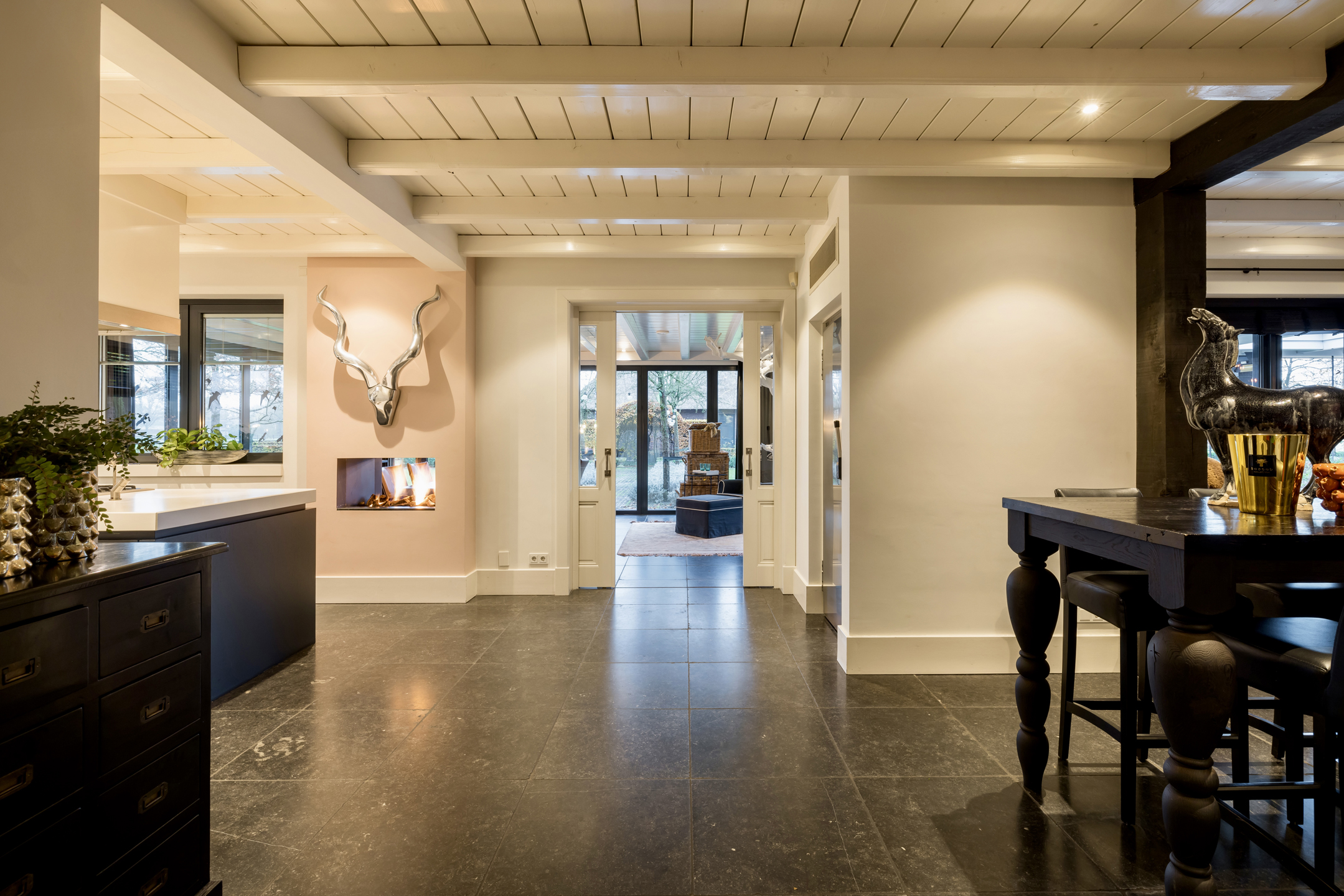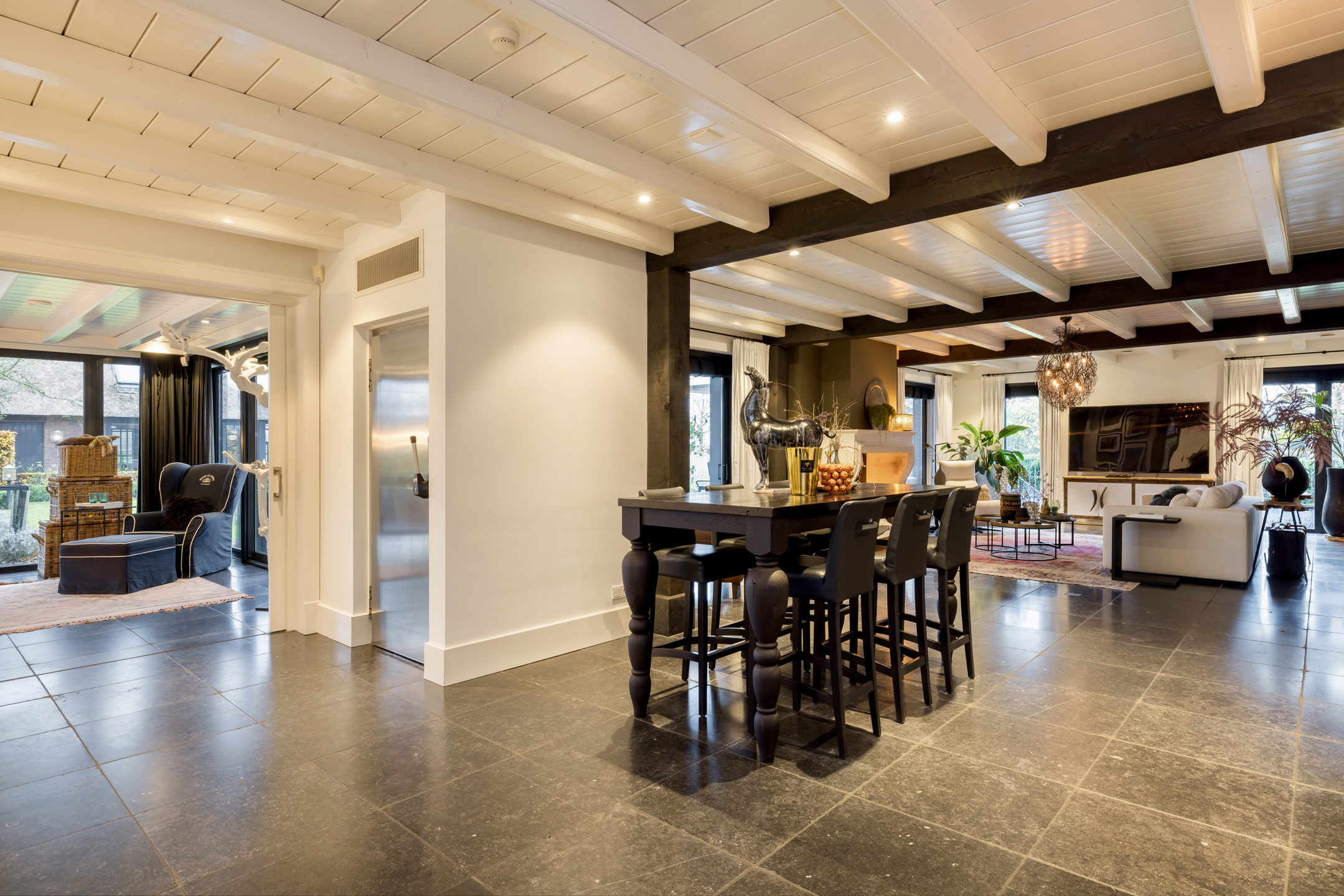 Via de dubbele voordeur bereik je de ruime hal met vaste trap naar boven, toilet, garderobe en deuren naar de kelder, de personenlift en de living. De living is sfeervol, chique en rustgevend met doorkijk naar de prachtige tuin en de schitterende haardpartij. Met rechts het kantoor middels en-suite deuren bereikbaar. Ga je naar links dan bereik je de open keuken met hier veel werkblad, opbergruimte, een kookeiland en alle denkbare keukenapparatuur die de echte liefhebber van de kookkunst zich maar kan wensen. De volgende apparatuur is hier aanwezig: stoomoven, oven, combi-oven, warmhoudlade, 6-pits gasfornuis, 2 x vaatwasser en een quooker. Wat het nog meer bijzonder maakt dat in de keuken een kleine goederen lift aanwezig is om zowel de kelder als 1ste verdieping van eten en dranken te voorzien. Een koelcel i.p.v. een koelkast ook vrij uniek om je eigen koelkast in te lopen. Aan de achtertuin zijde is direct achter de keuken een fantastische tuinkamer gesitueerd die als eetkamer dienst doet. Uiteraard met overal glas en uitzicht op tuin en landerijen. Pal naast de tuinkamer is een serre aanwezig met een heerlijke buiten houthaard. Deze ruimte kun je volledig openzetten via schuifdeuren zodat je de prachtige tuin naar binnen kunt halen. Last but not least, is dit tophuis ook nog eens levensloop bestendig. Aan de linker voorzijde van de woning is de Masterbedroom gesitueerd, met ruime badkamer en walking-closet. De volledige begane grond heeft een Belgisch natuurstenen vloer met vloerverwarming en koeling maar kan ook verwarmd en gekoeld worden met een airco.