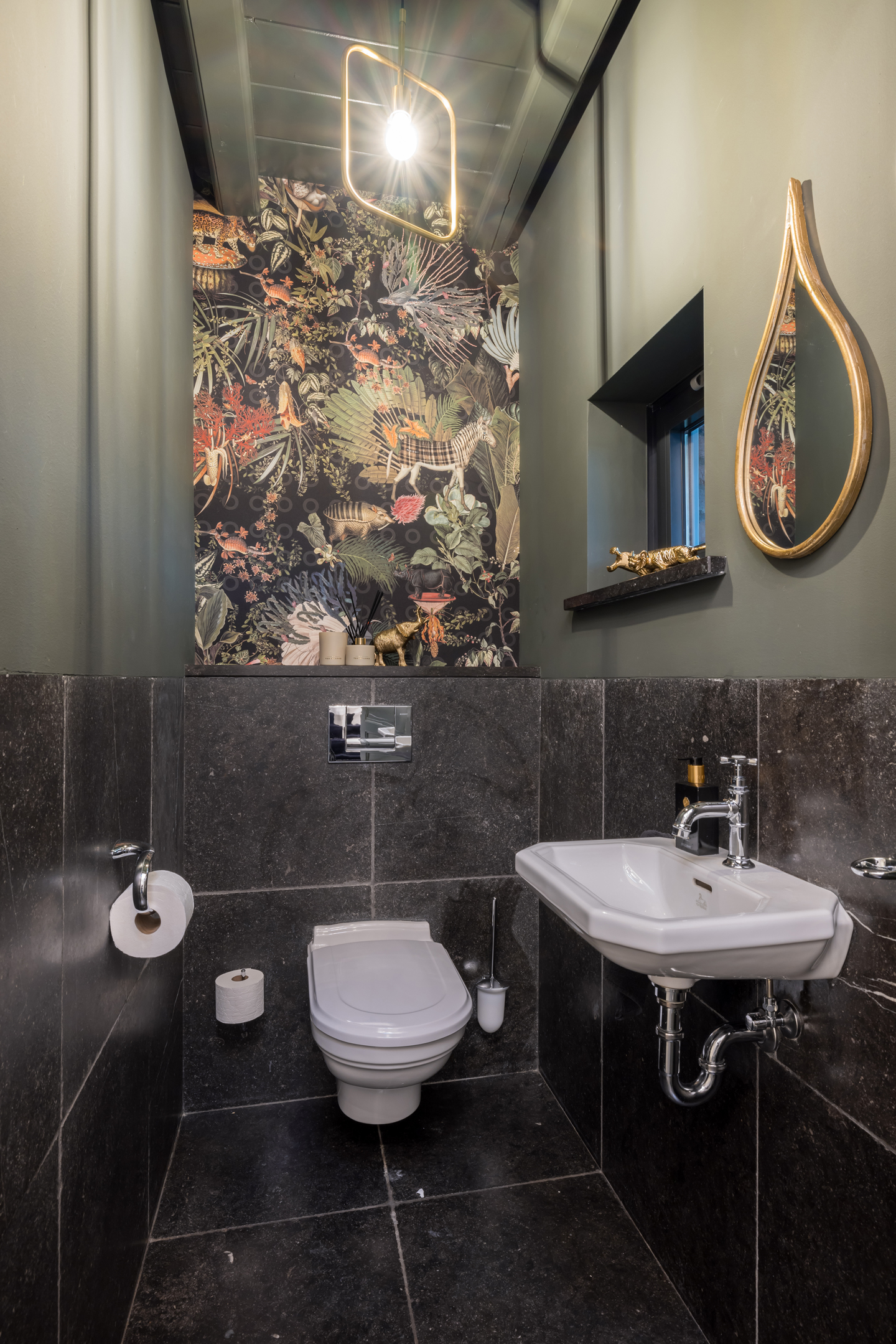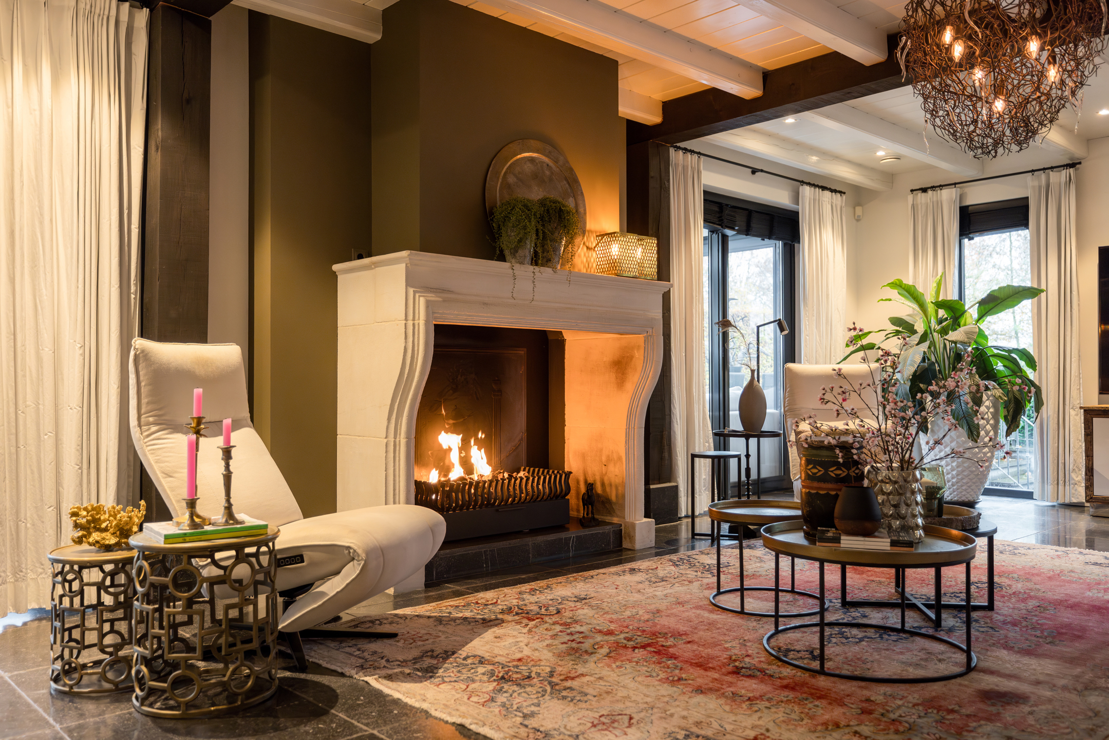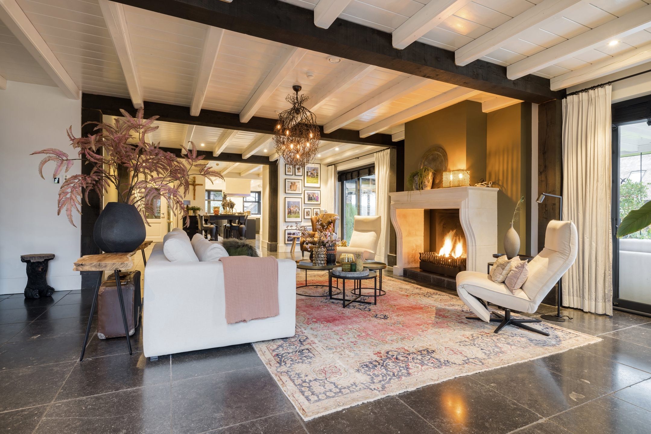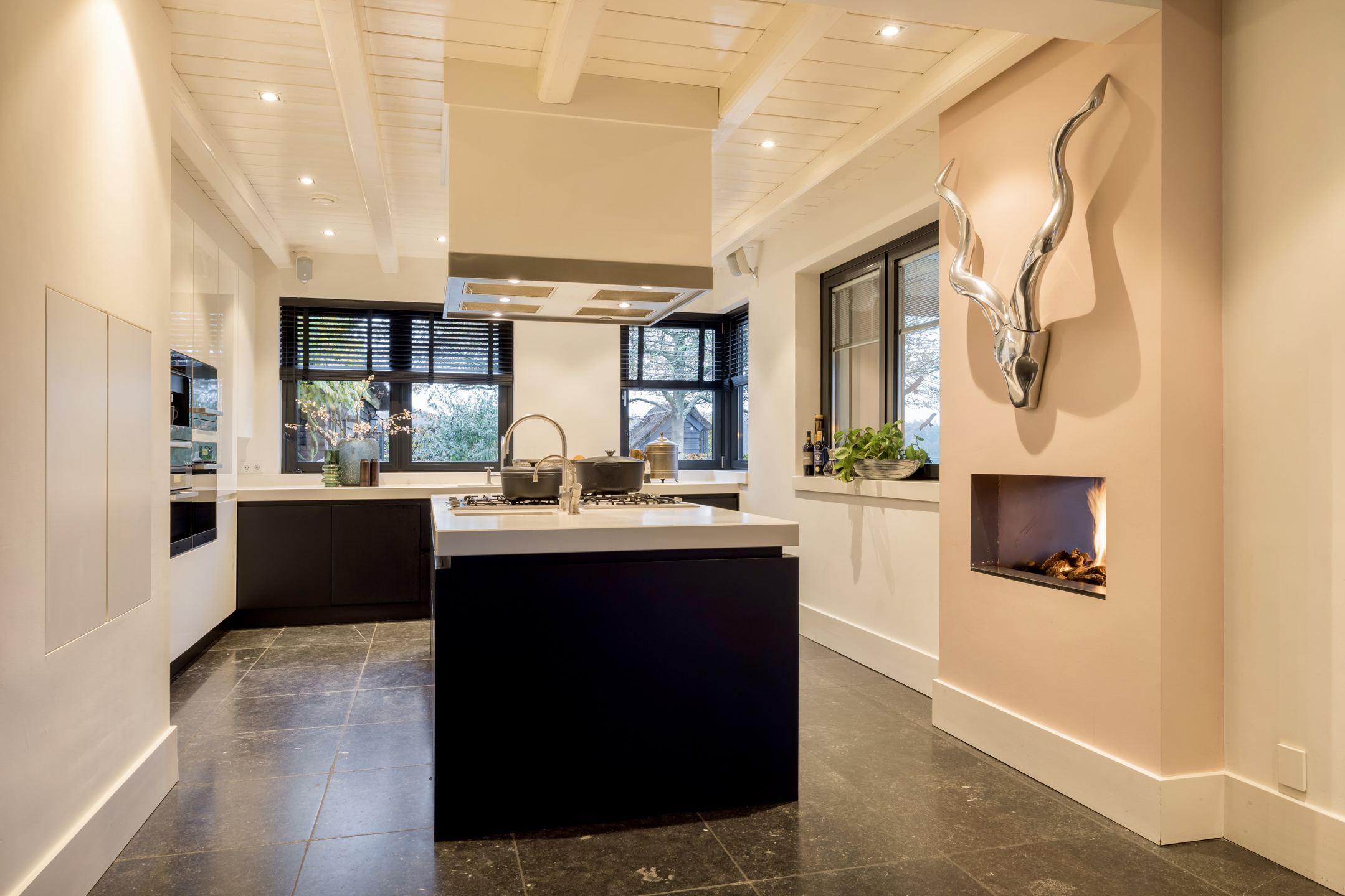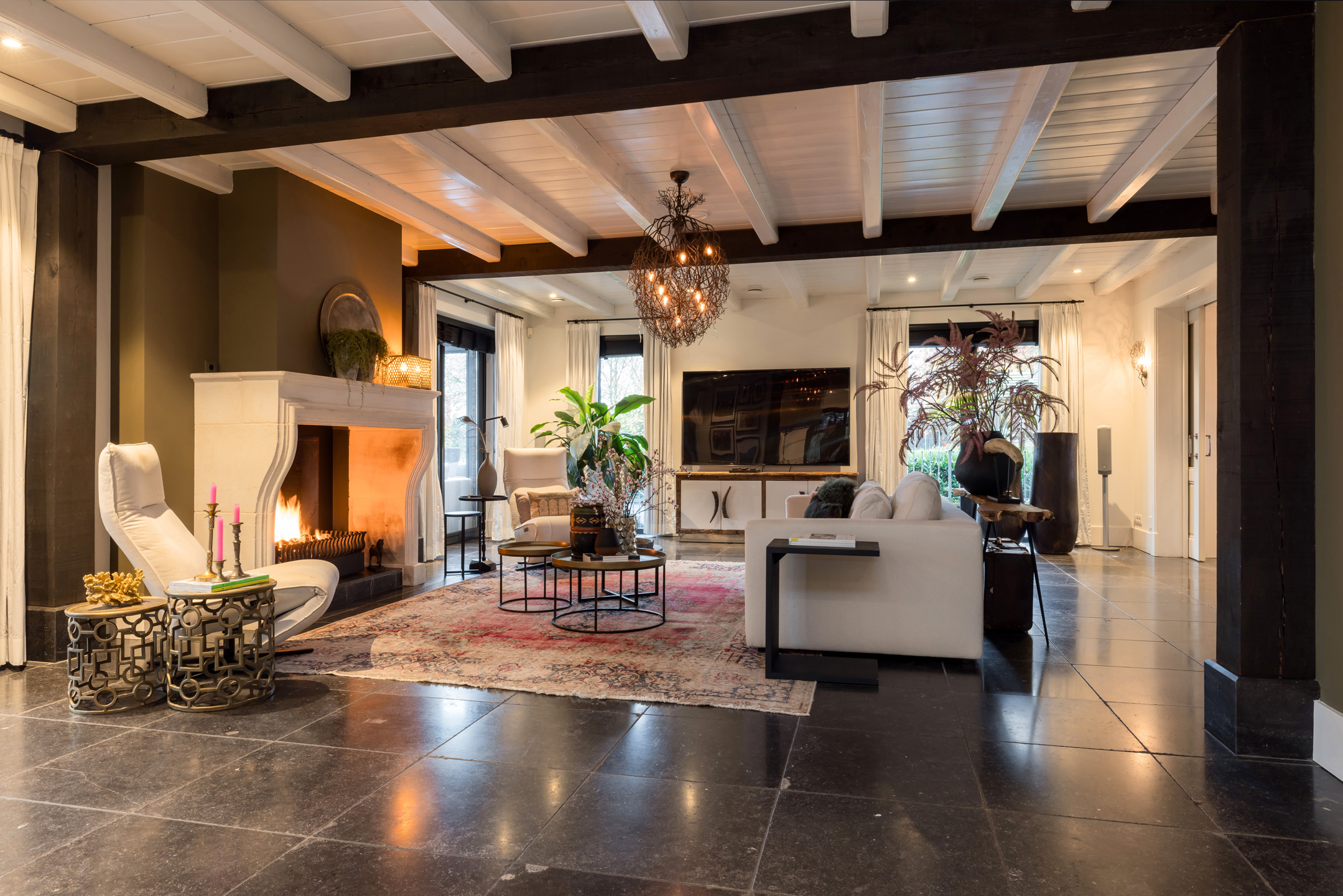 Via de dubbele voordeur bereik je de ruime hal met vaste trap naar boven, toilet, garderobe en deuren naar de kelder, de personenlift en de living. De living is sfeervol, chique en rustgevend met doorkijk naar de prachtige tuin en de schitterende haardpartij. Met rechts het kantoor middels en-suite deuren bereikbaar. Ga je naar links dan bereik je de open keuken met hier veel werkblad, opbergruimte, een kookeiland en alle denkbare keukenapparatuur die de echte liefhebber van de kookkunst zich maar kan wensen. De volgende apparatuur is hier aanwezig: stoomoven, oven, combi-oven, warmhoudlade, 6-pits gasfornuis, 2 x vaatwasser en een quooker. Wat het nog meer bijzonder maakt dat in de keuken een kleine goederen lift aanwezig is om zowel de kelder als 1ste verdieping van eten en dranken te voorzien. Een koelcel i.p.v. een koelkast ook vrij uniek om je eigen koelkast in te lopen. Aan de achtertuin zijde is direct achter de keuken een fantastische tuinkamer gesitueerd die als eetkamer dienst doet. Uiteraard met overal glas en uitzicht op tuin en landerijen. Pal naast de tuinkamer is een serre aanwezig met een heerlijke buiten houthaard. Deze ruimte kun je volledig openzetten via schuifdeuren zodat je de prachtige tuin naar binnen kunt halen. Last but not least, is dit tophuis ook nog eens levensloop bestendig. Aan de linker voorzijde van de woning is de Masterbedroom gesitueerd, met ruime badkamer en walking-closet. De volledige begane grond heeft een Belgisch natuurstenen vloer met vloerverwarming en koeling maar kan ook verwarmd en gekoeld worden met een airco.