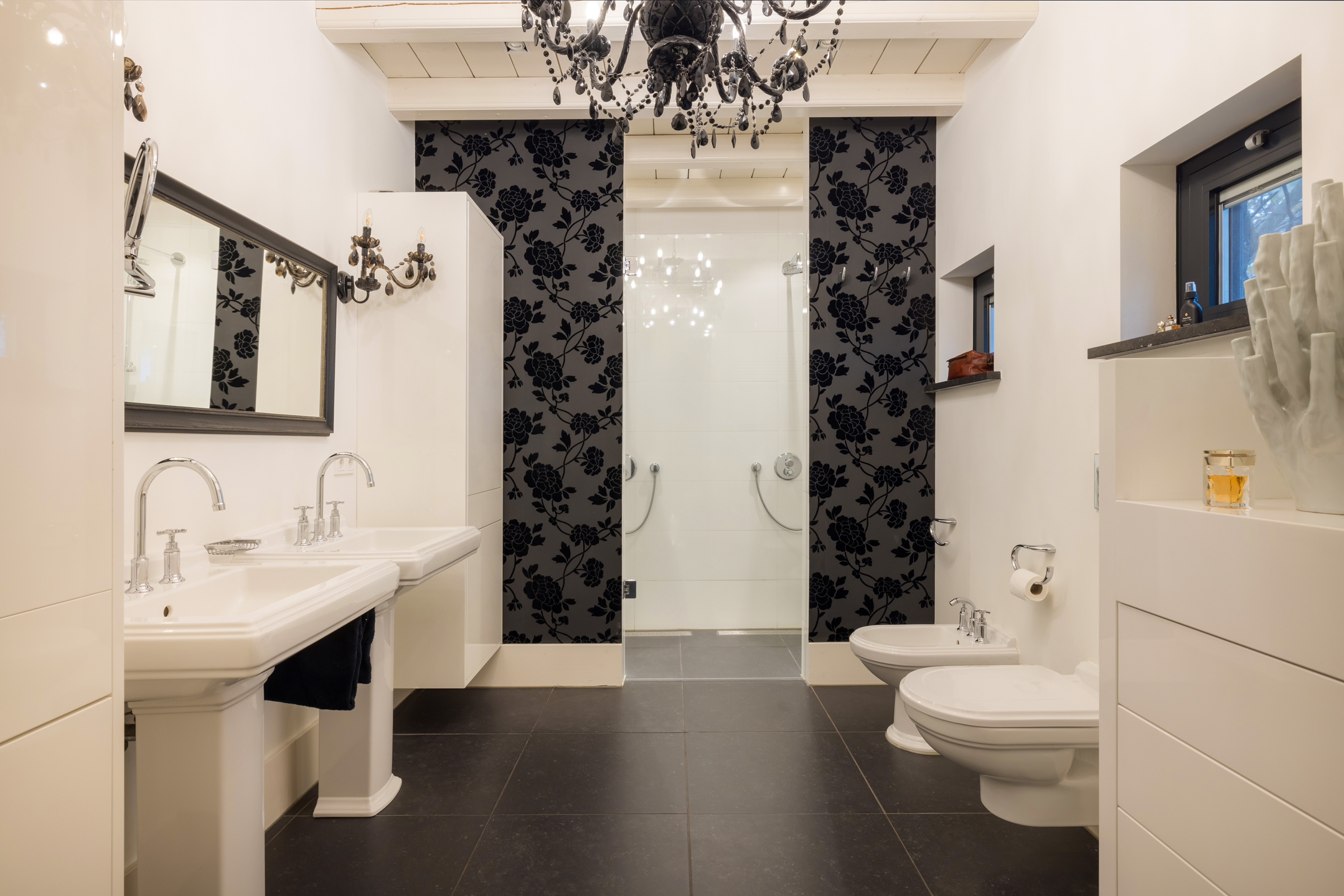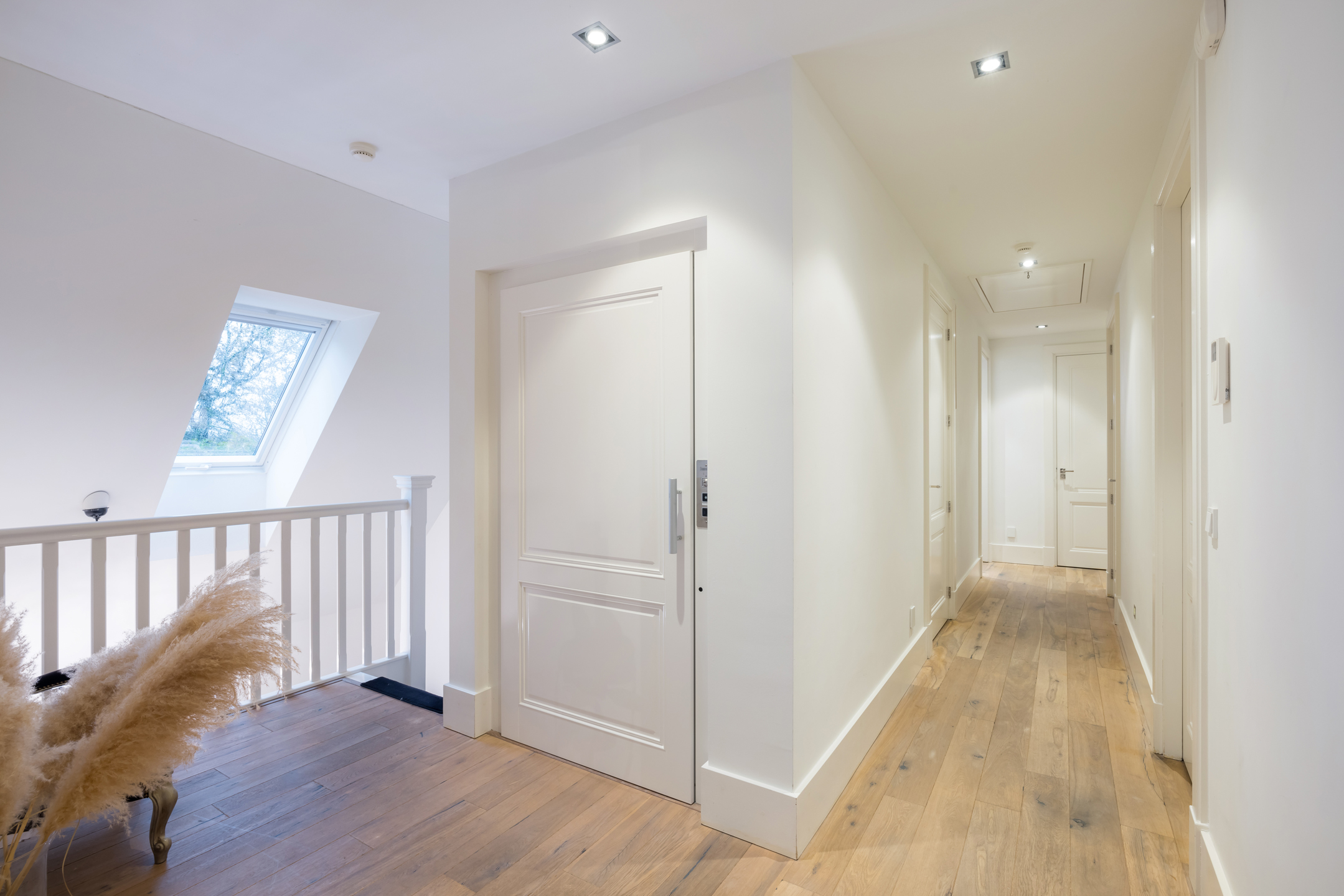 Bereikbaar via een vaste trap als een personen lift vanuit de hal. Boven aangekomen, is er een vide met ruime overloop met hier 5 slaapkamers en 2 badkamers. De hele etage is voorzien van een prachtige eikenhouten plankenvloer. De badkamers hebben een keramische tegelvloer. Alle slaapkamers zijn ruim, hebben dakkapellen en dus voldoende daglicht met overal uitzicht op de tuin en de landelijke omgeving. Alle slaapkamers zijn ruim, hebben dakkapellen en dus voldoende daglicht met overal uitzicht op de tuin en de landelijke omgeving. Het afwerkingsniveau is ook hier onberispelijk en je waant je hier in een 5 sterren hotel. Een van de 5 slaapkamers (Masterbedroom) is nog veel ruimer en doet momenteel dienst als kantoorruimte, werkelijk schitterend. Alle slaapkamers zijn voorzien van een airconditioning. Een grote badkamer met dubbele wastafel, bad en douche. De 2e badkamer is van kleiner formaat en voorzien van een wastafel en douche. Het toilet is separaat.