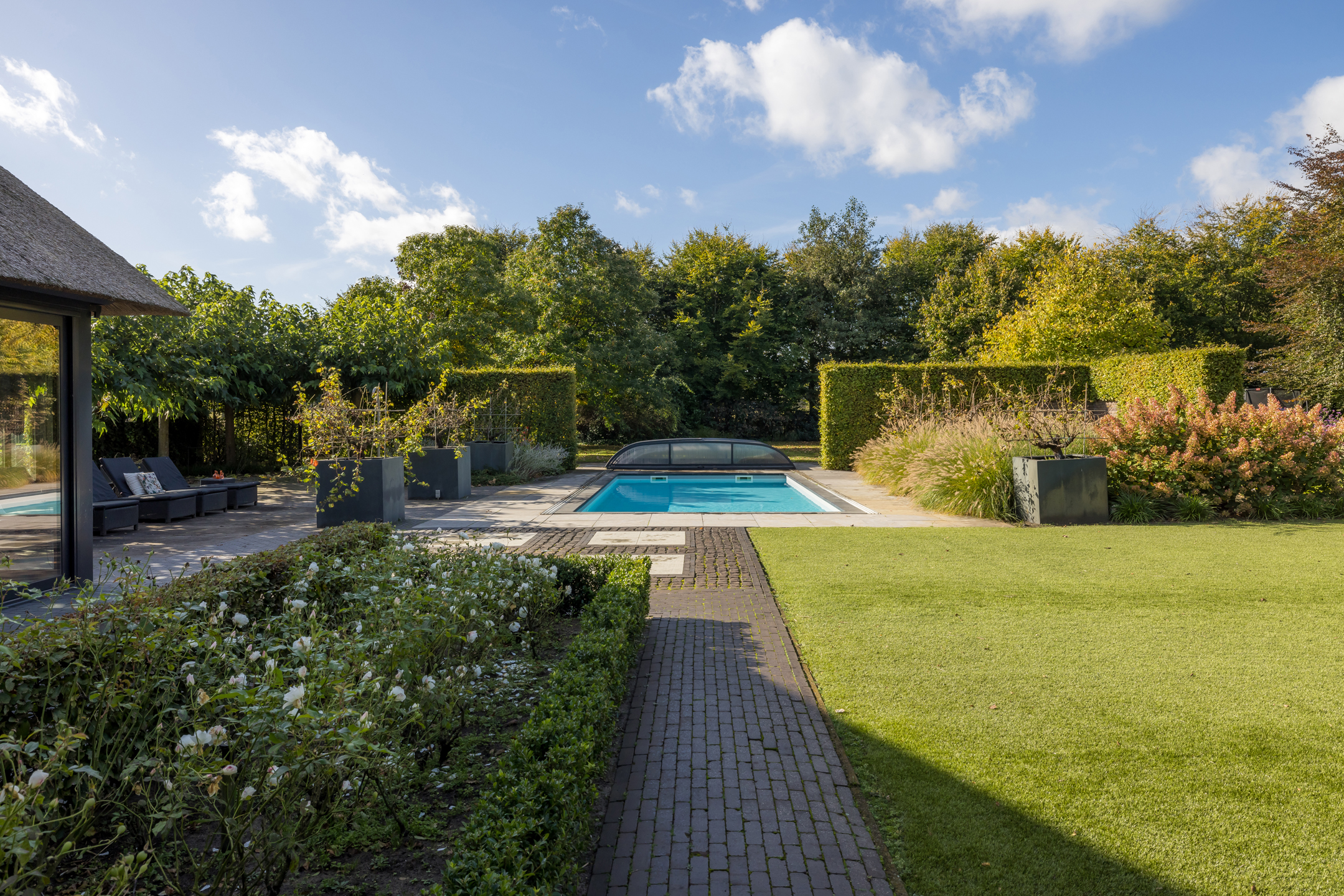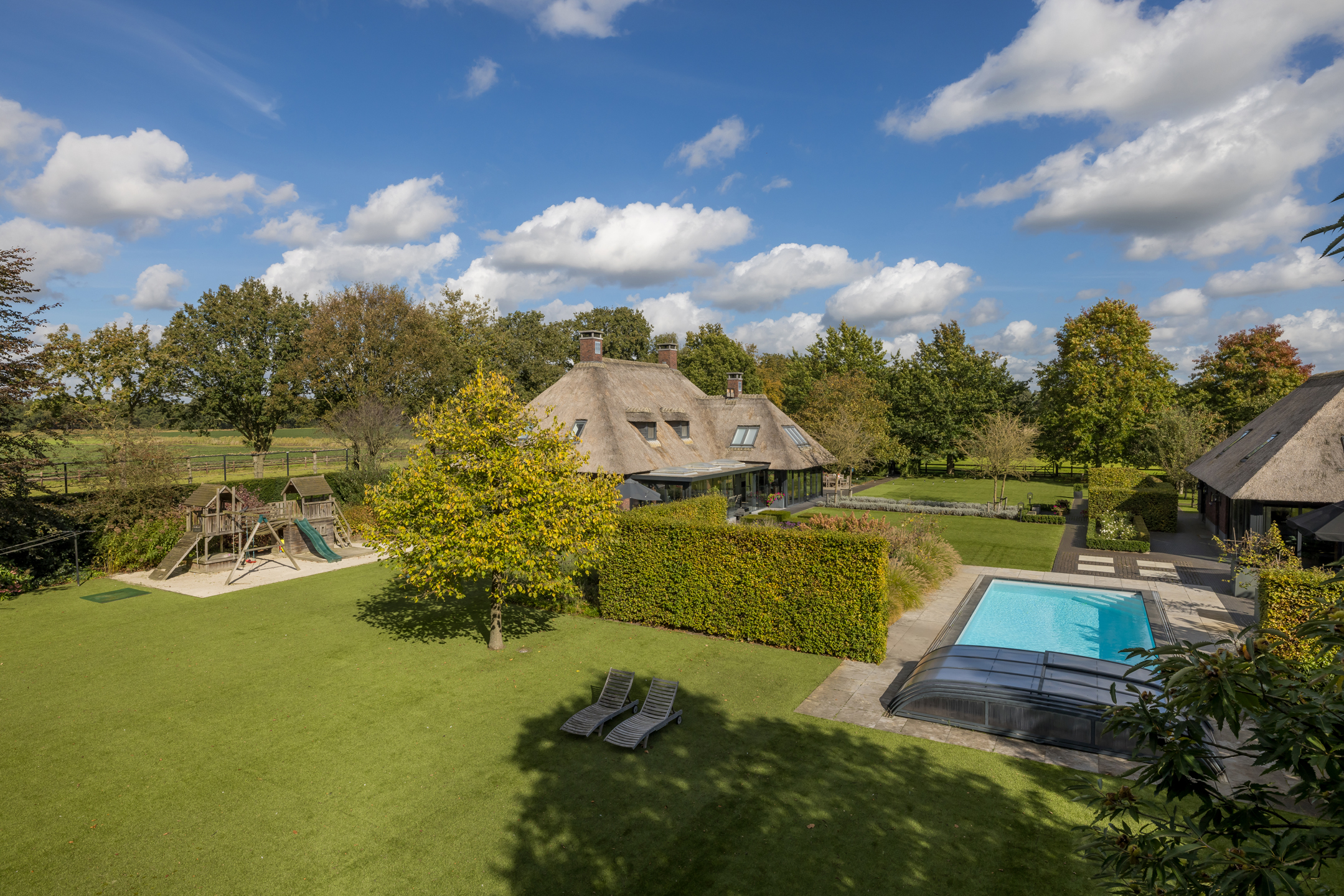 Een prachtig aangelegde voortuin met aan 2 zijdes ruime parkeermogelijkheden. De achtertuin is riant en onderhoudsvriendelijk. Met een uitzicht op zowel in de verte het bos, weiland, het guesthouse, het buiten zwembad en de prachtig aangelegde tuin. Het zwembad is volledig afsluitbaar, maar kan uiteraard ook volledig worden geopend door middel van een schuifkoepel systeem. De verwarming van het zwembad gaat via een hybride warmtepomp. Het gazon is enkele jaren geleden vervangen door kunstgras, wat er eerlijk gezegd wel heel erg goed uitziet en het wel heel onderhoudsvriendelijk maakt. Het rechterdeel van de achtertuin is ingericht als speelruimte voor de kinderen. Achter het guesthouse en links van de woning is het perceel nu ingericht als grasland.