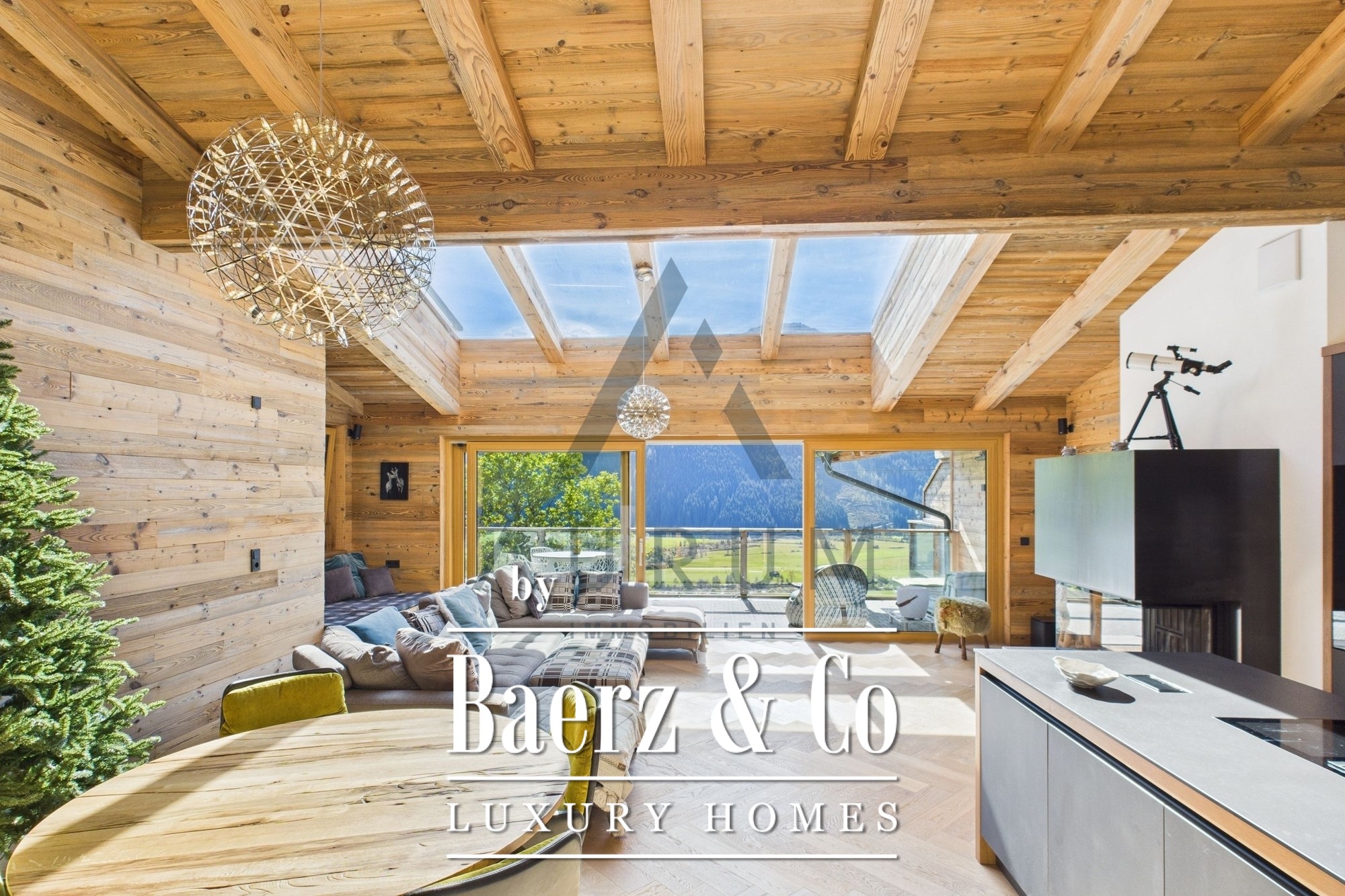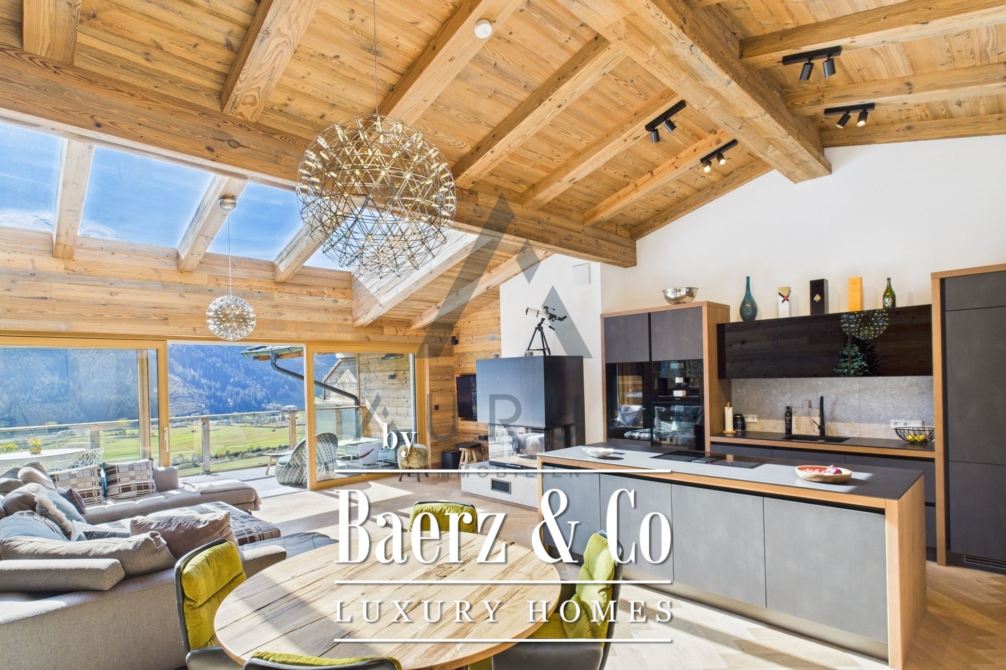 A striking living and dining area anchors the home, set beneath an exposed reclaimed wood roof truss and illuminated by a 3 by 4 meter roof glazing. Floor-to-ceiling triple-glazed French doors lead seamlessly to a 40 m² terrace, commanding panoramic mountain views. Materials and atmosphere combine in the designer kitchen, equipped with Miele appliances, a wine cooler, an integrated Bose sound system, and artful lighting. A fireplace lends understated warmth, while electric Venetian blinds and floor heating ensure year-round comfort.