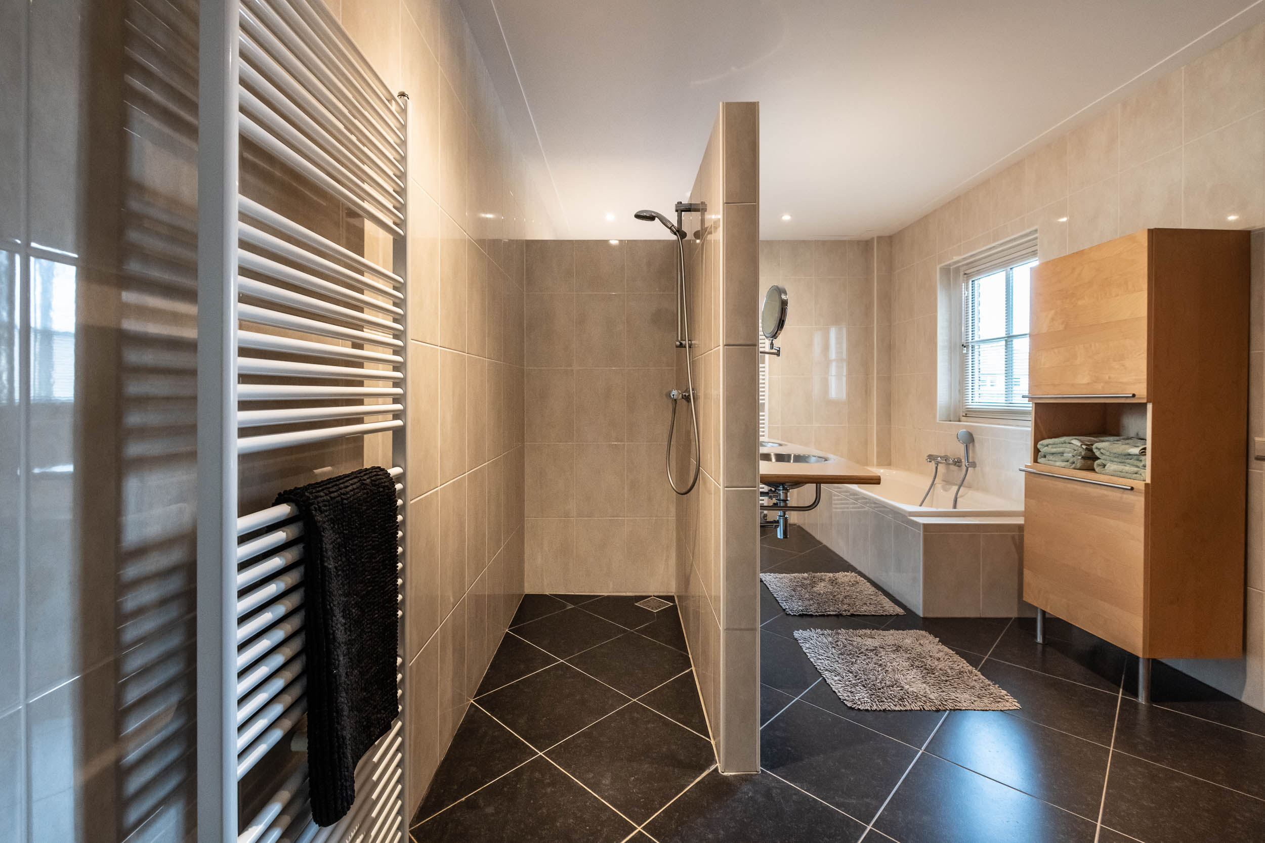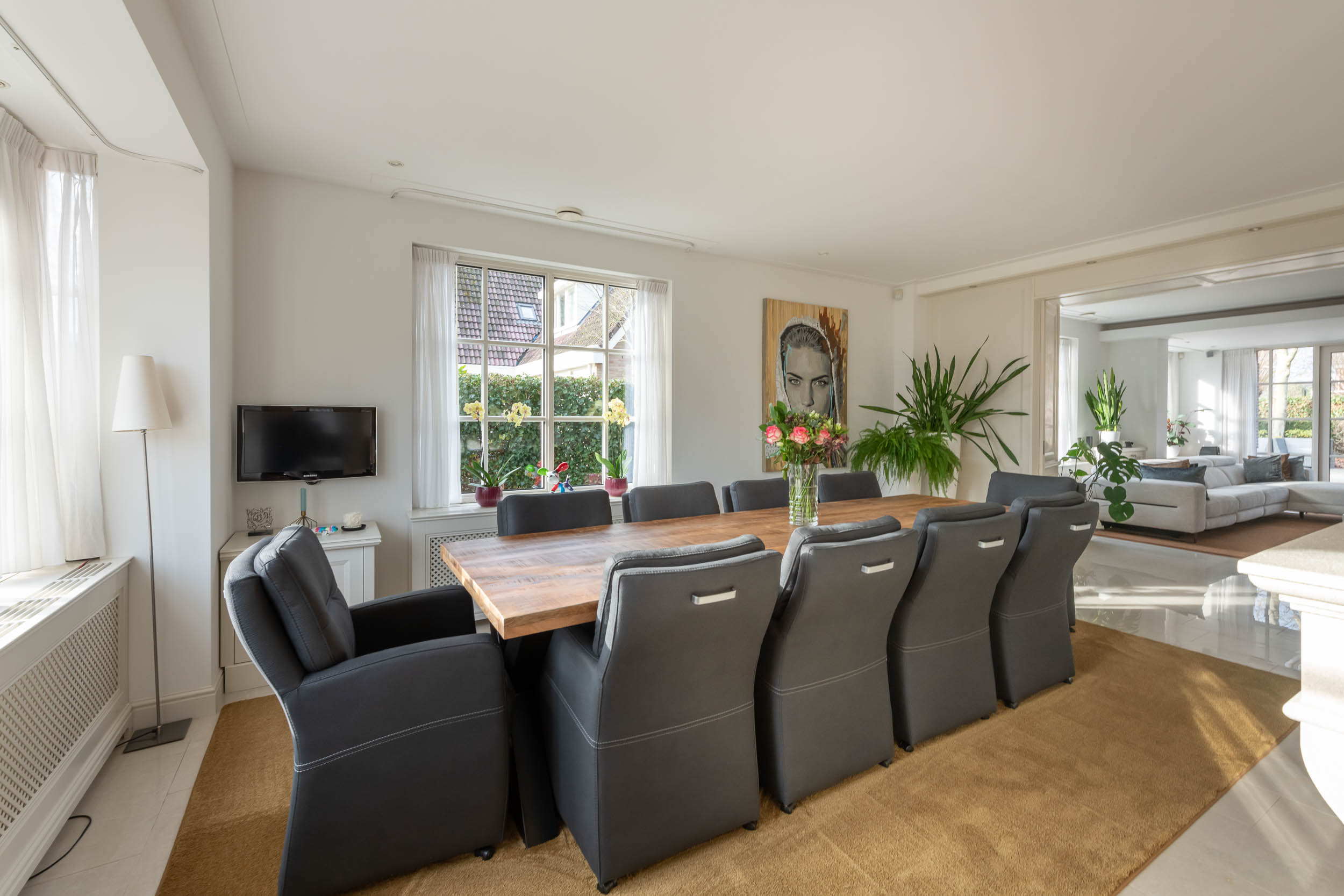 Ground floor: Entrance, large L-shaped hall with wardrobe and WC. From the hall, access is provided to the garage on the right and the living room on the left. At the front of the house are the dining room and a dedicated office space. Through the sliding doors of the dining room, you enter the rear of the house, where a cosy sitting room features a gas fireplace, a wide wall of built-in cupboards, and double doors opening onto the backyard. The spacious, modern SieMatic kitchen is open to the living room and features a large cooking island equipped with a built-in teppanyaki plate and an induction wok, along with additional features. One wall is fitted with a range of modern kitchen appliances. The utility room, accessible from both the garage and the kitchen, is equipped with a washing machine connection and a kitchen unit with a sink. The double French doors open onto a beautiful, spacious garden featuring a partially covered terrace, multiple seating areas, and a stylish garden shed.