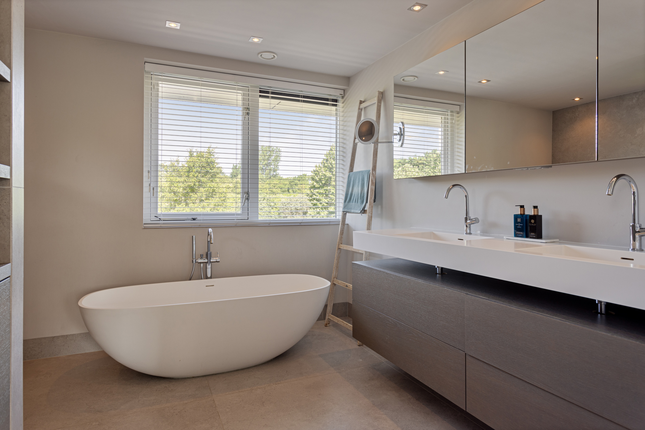 Upon entering there is a generous bright entrance with beautiful staircase and toilet room. Through the steel door we enter the generous, very bright living room with work corner and French doors to the beautiful garden. At the rear of the house is a large modern kitchen with cooking/sink island and breakfast bar; plenty of space for cozy dinners with friends and family. Again, large windows provide an abundance of light. A utility room is of course not missing; this is also where the washing equipment is located.