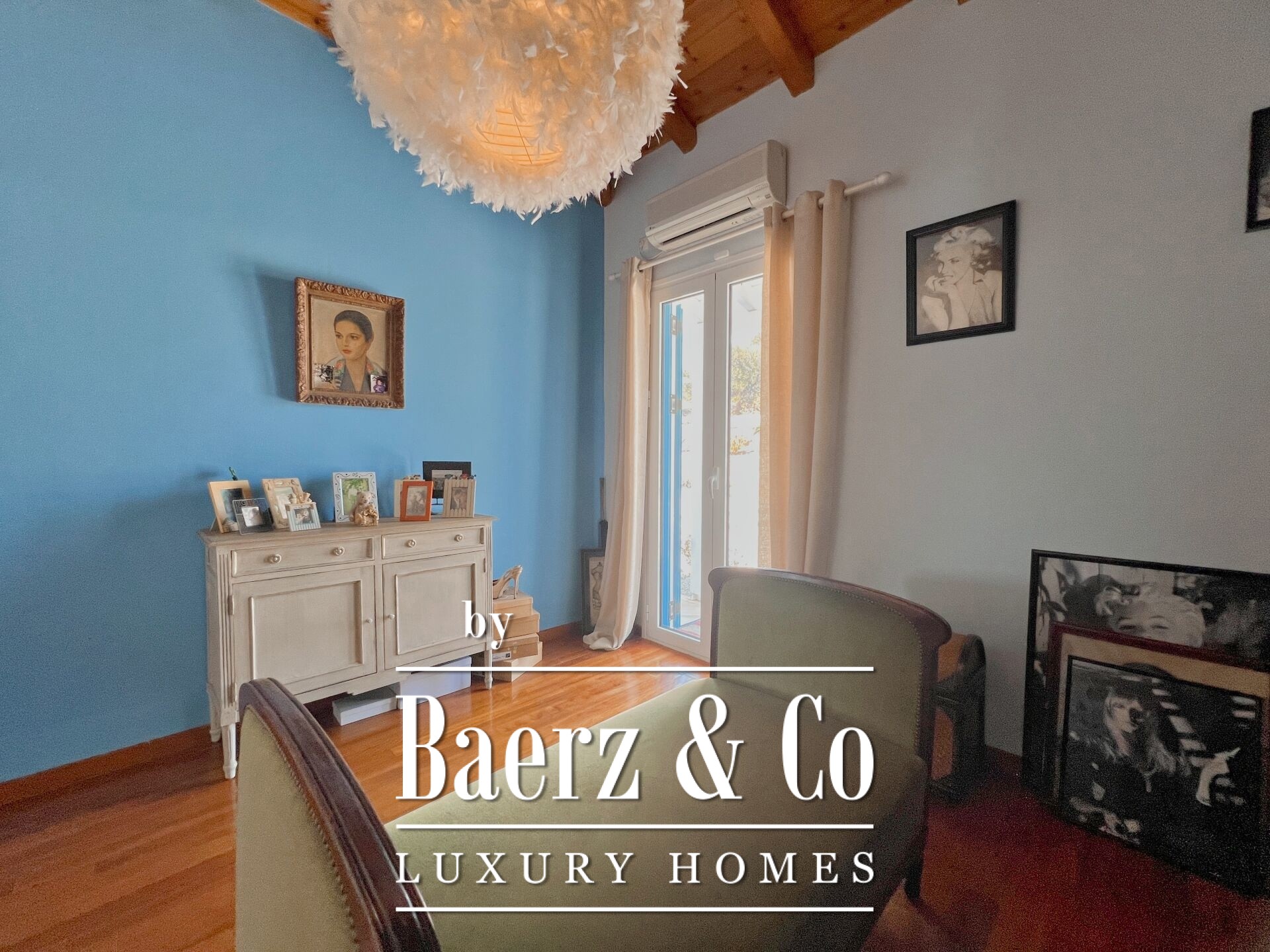 Outdoors, mature olive trees settle the house in its landscape. The expansive garden, designed with automatic irrigation, sits beside a sheltered garage, ample storage, a dedicated barbecue, and space for a future pool. Security features such as security door, CCTV, and alarm complement the villa’s sense of discretion. This property is a rare offering for those seeking a villa Kouverta experience defined by privacy, luxury, and the elemental presence of Aegean light.