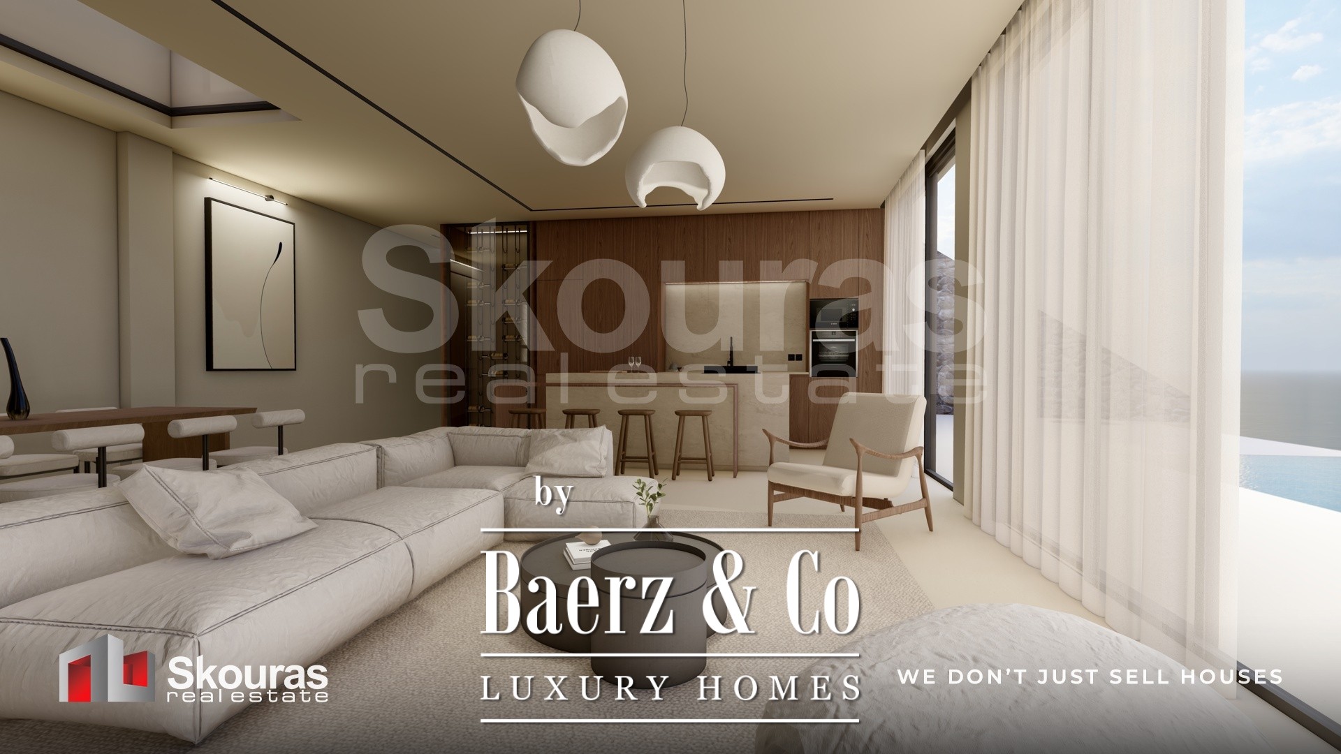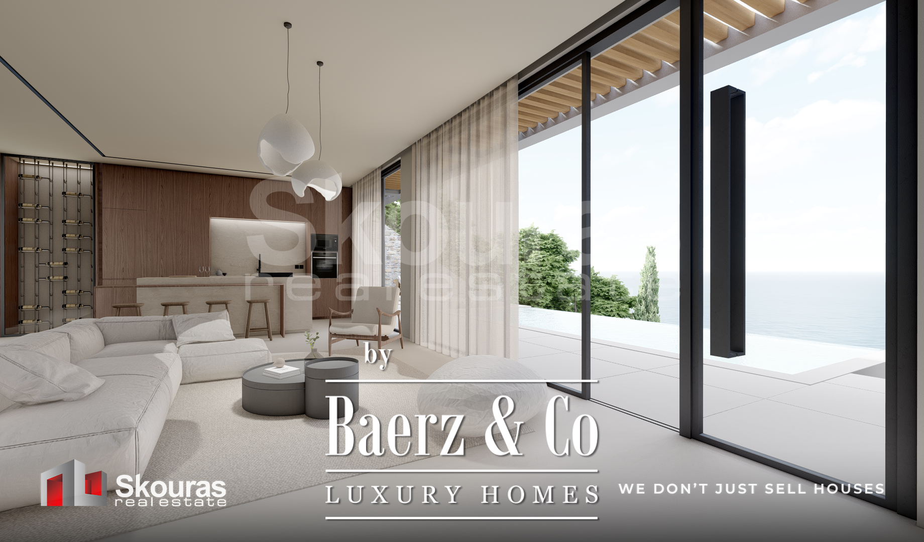 The villa features three generously proportioned bedrooms, each with its own en-suite bathroom and walk-in closet, ensuring both autonomy and refinement for residents and guests. Expansive glazing defines the open-plan living area, drawing in sea views and natural light, while the modern kitchen and dedicated wine cellar create a setting attuned to quiet luxury. Smart home technology elevates the experience of daily living.