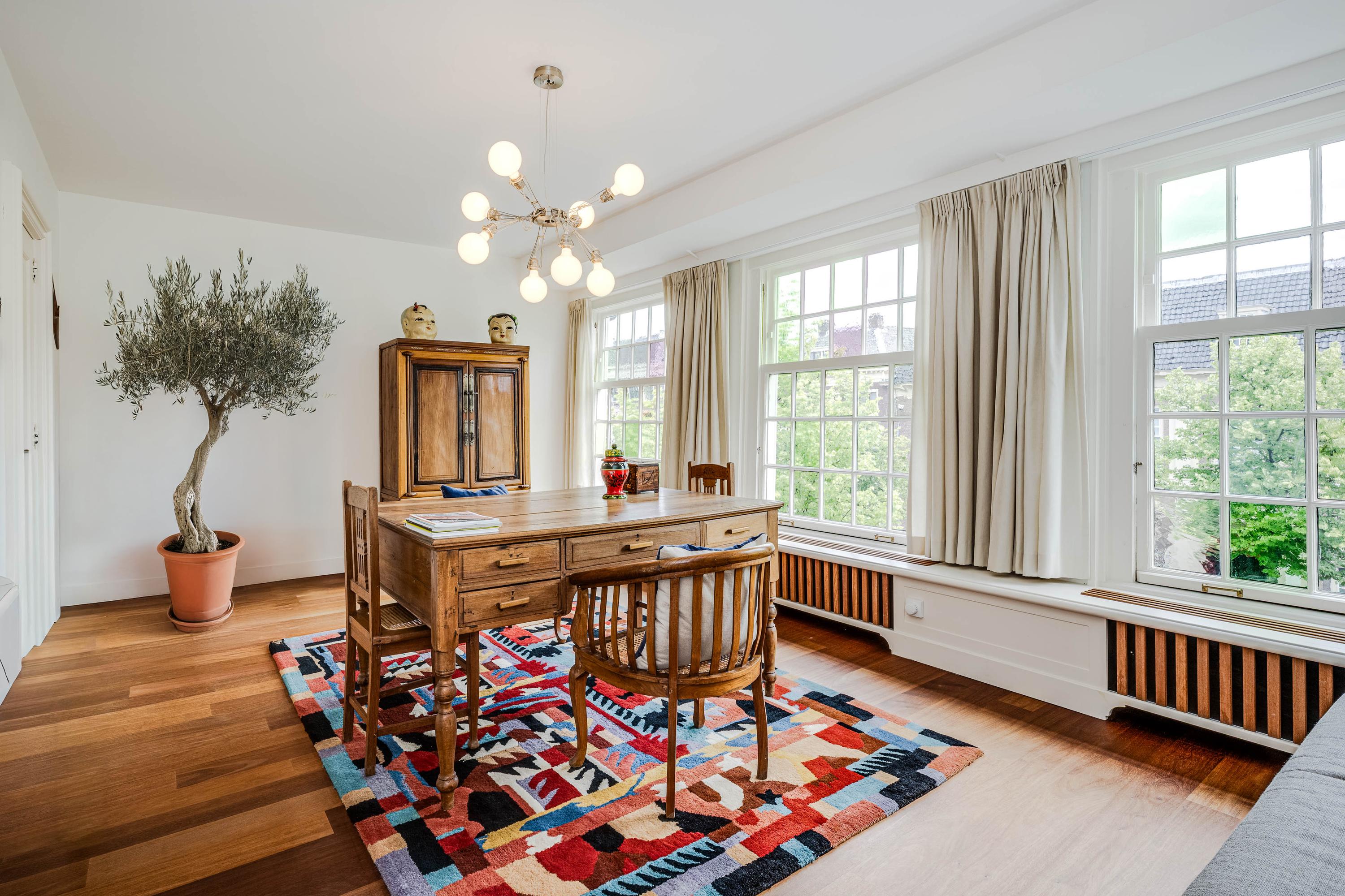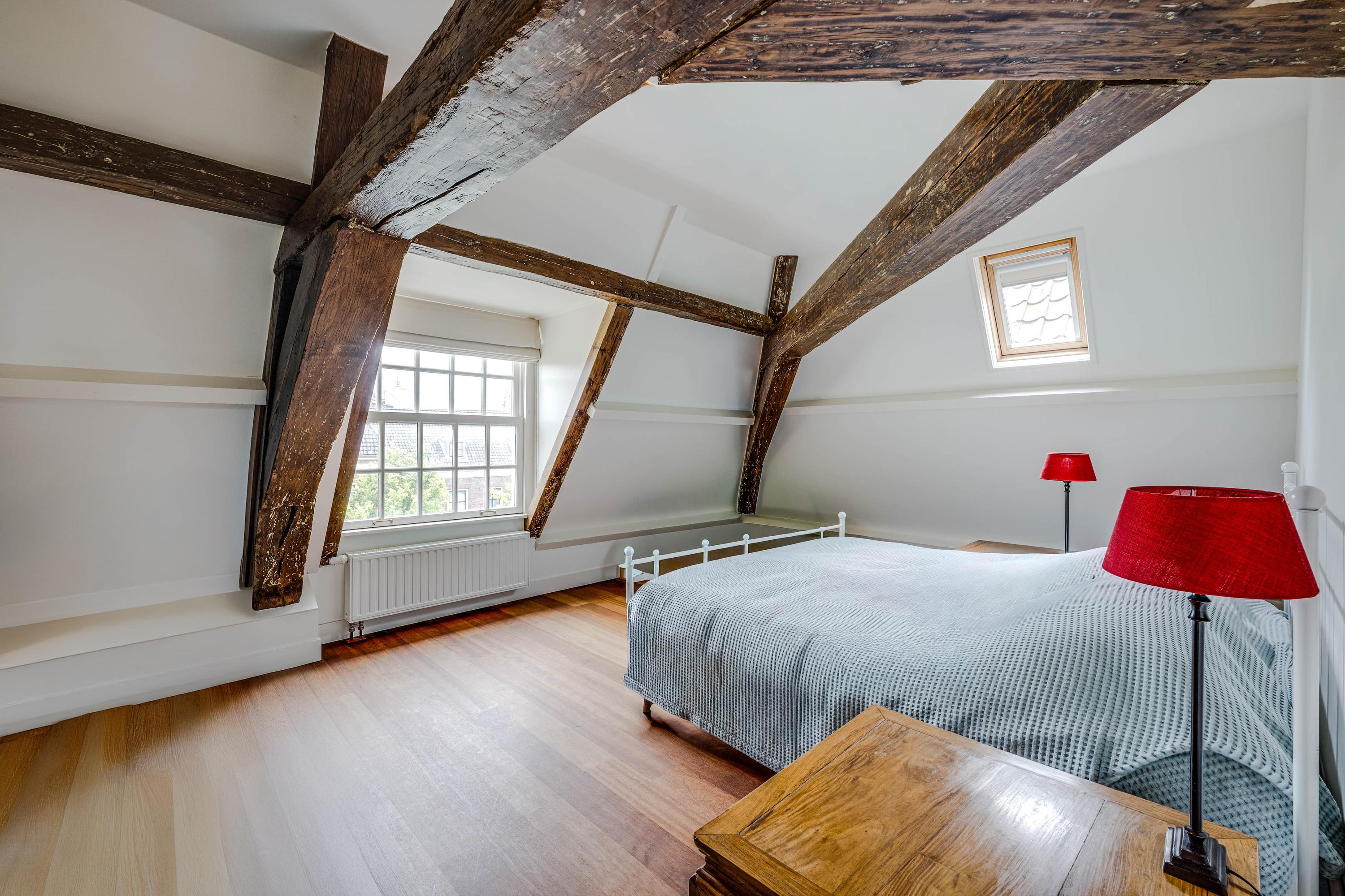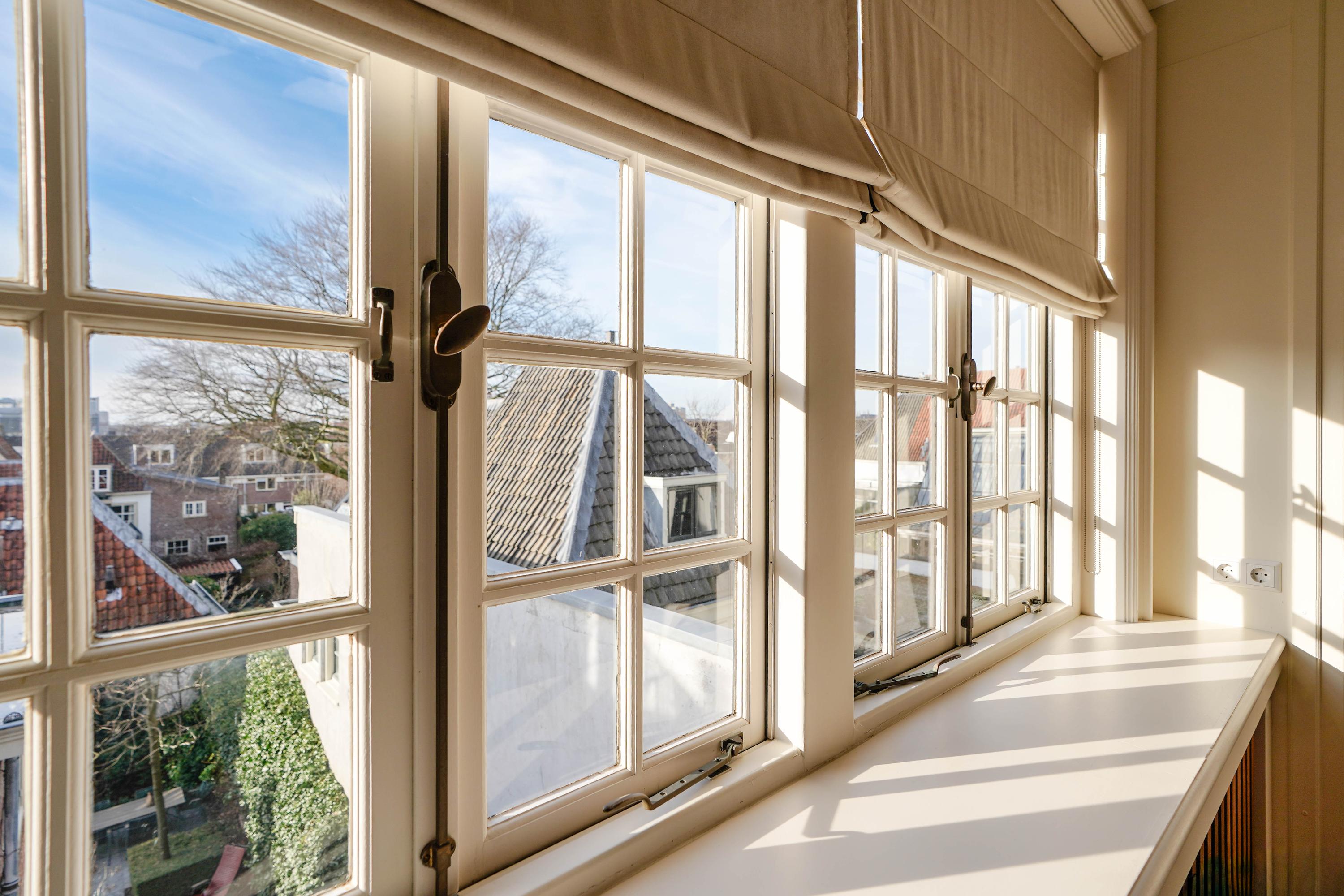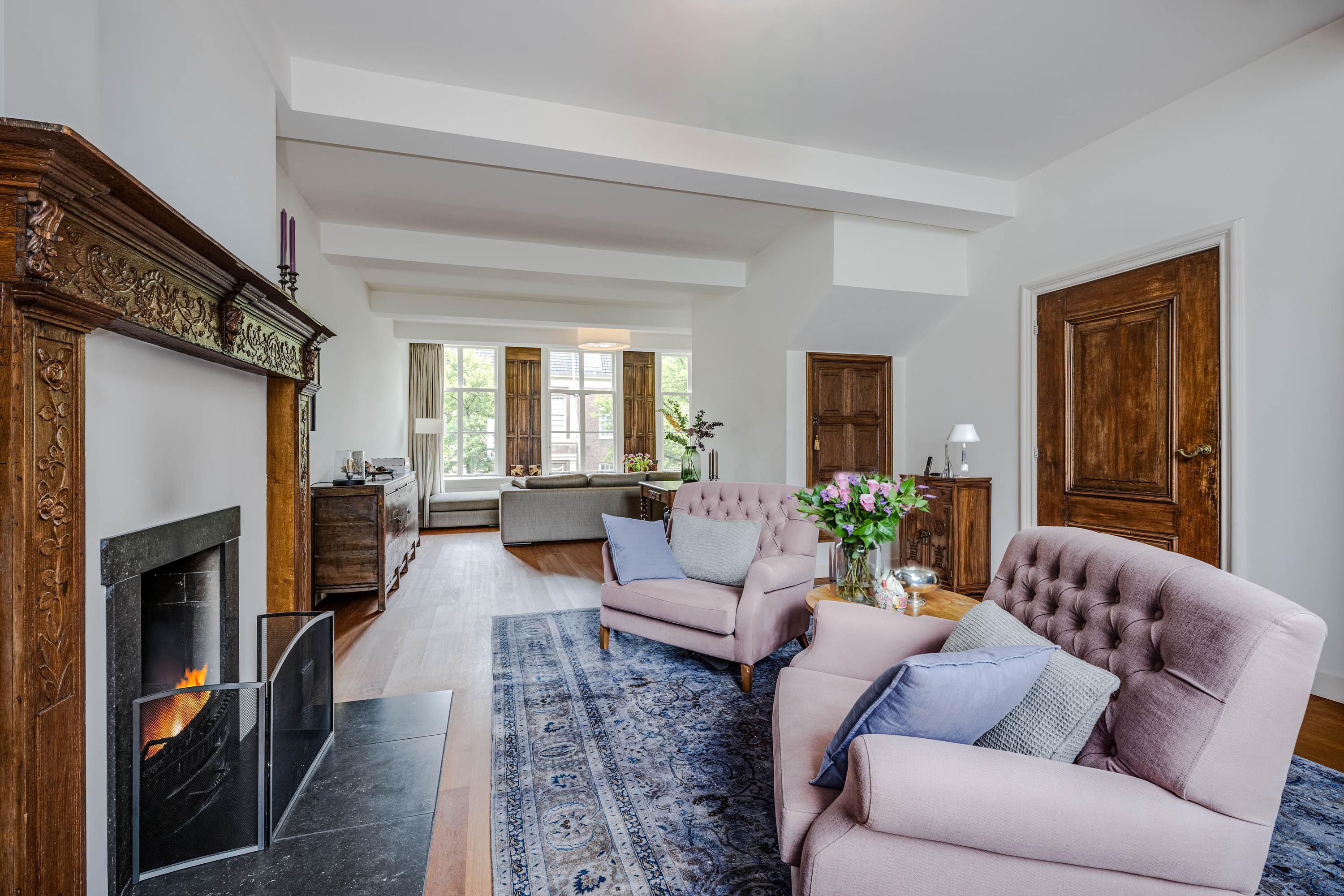 intimate sitting room surrounding the fireplace; at the front is a spacious living room, three windows wide, with a magnificent view of the canal and the historic cityscape.
