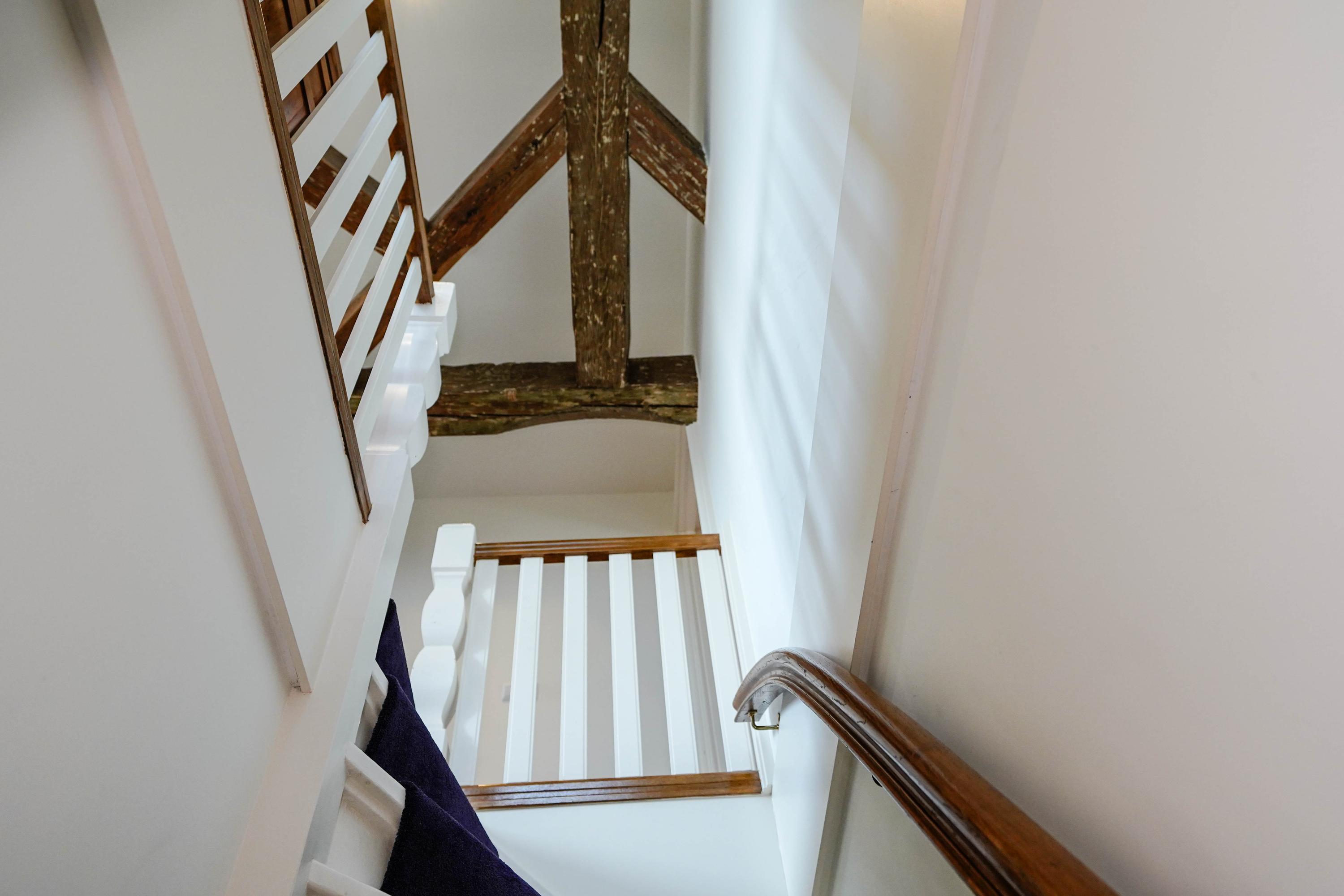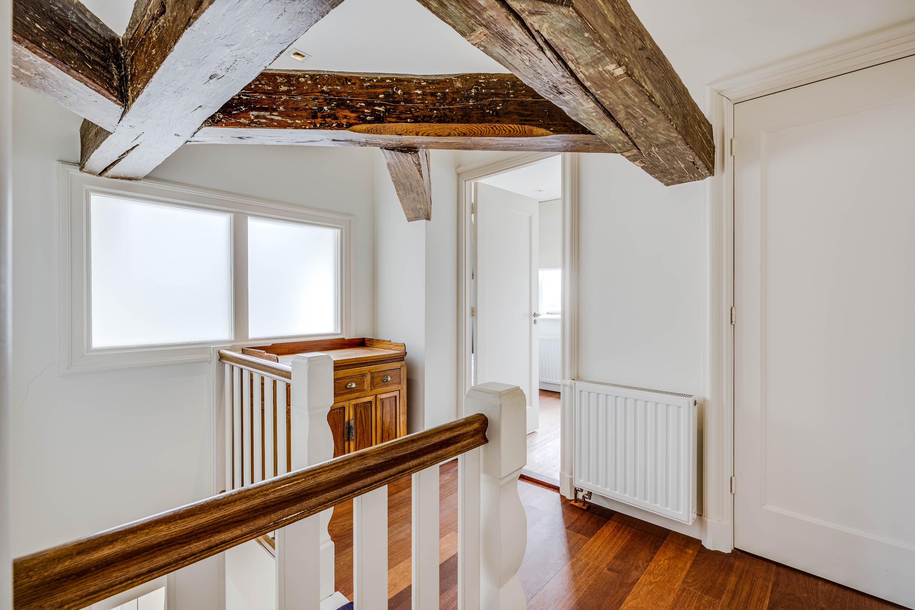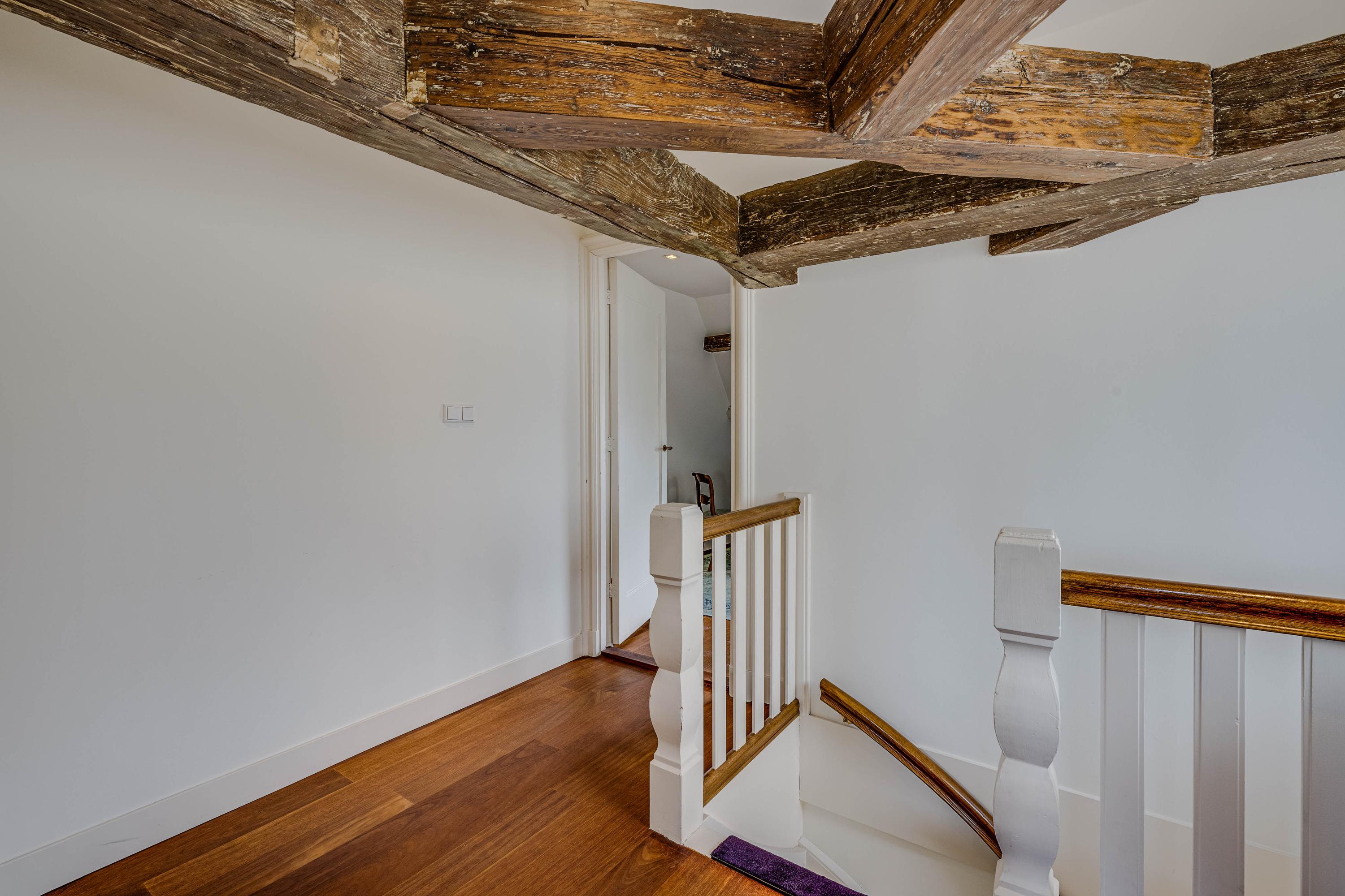 The interior exudes history and class, featuring beautiful beamed ceilings, an