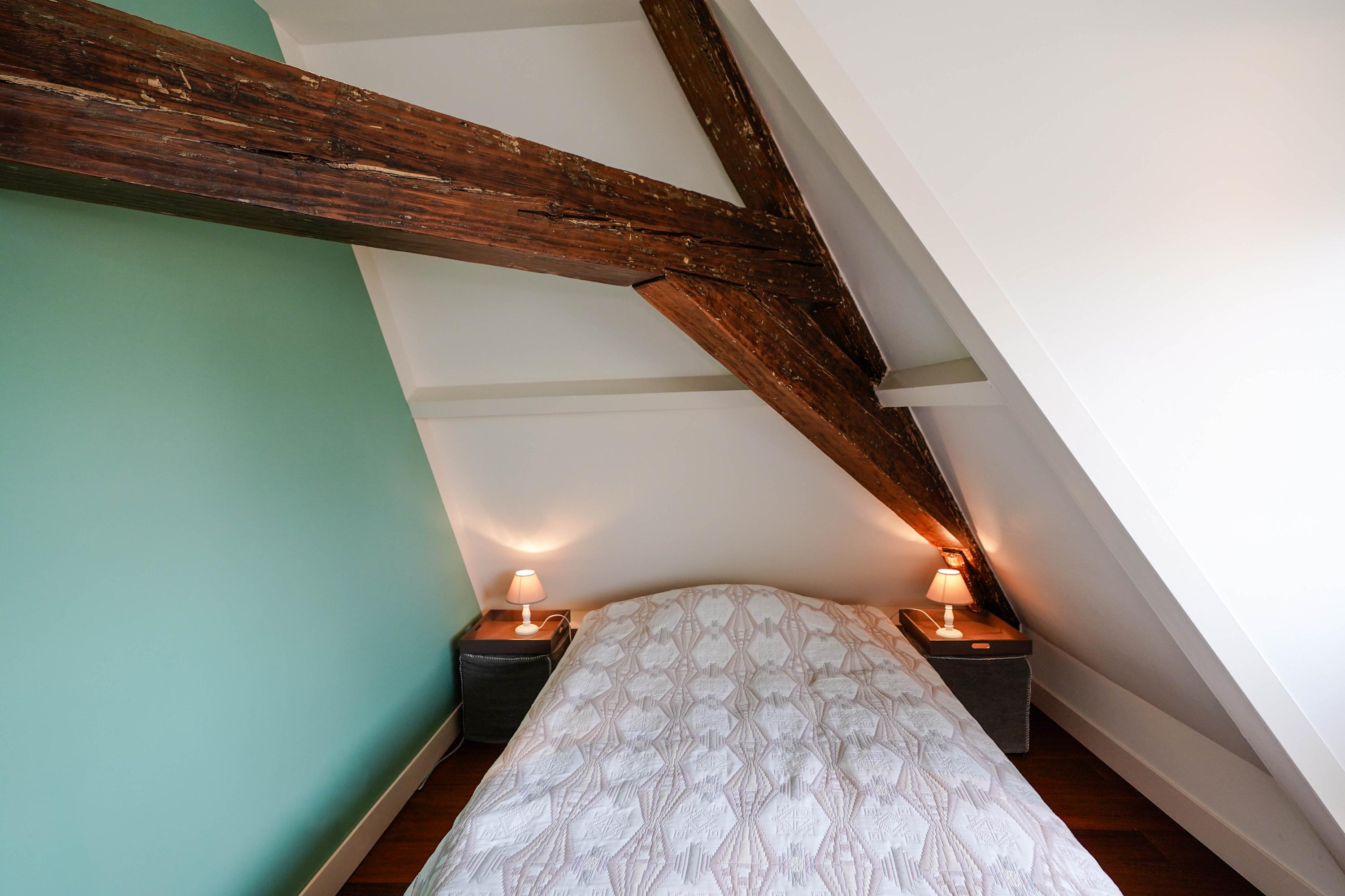 Landing, bathroom with shower and toilet. At the front is a particularly spacious and attractive bedroom with a dormer window and built-in wardrobe. Here you'll also find the hatch with a loft ladder to the large attic space, where the central heating system is located, among other things. At the rear is another bedroom with a dormer window.